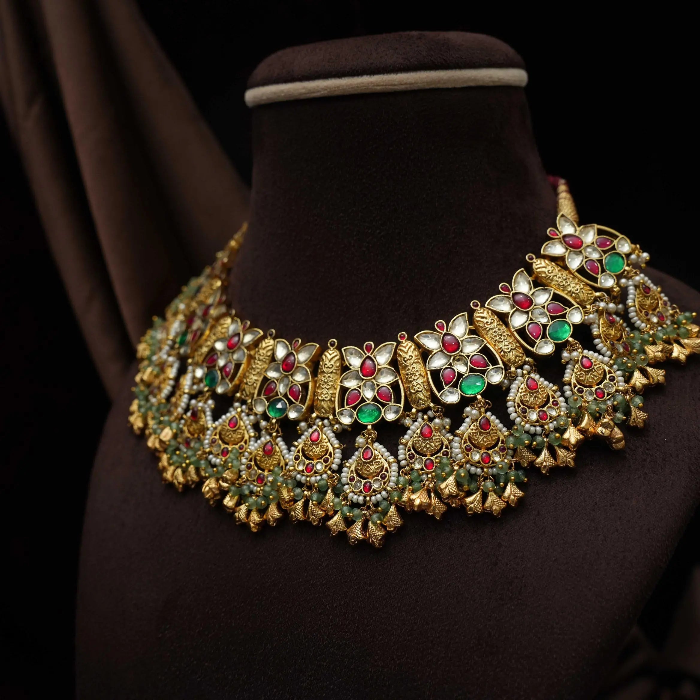Make a lasting impression with this exquisite handcrafted copper necklace, designed in a delicate floral motif. Embellished with premium-quality Polki stones and vibrant red and green accents, the piece captures the richness of traditional artistry.