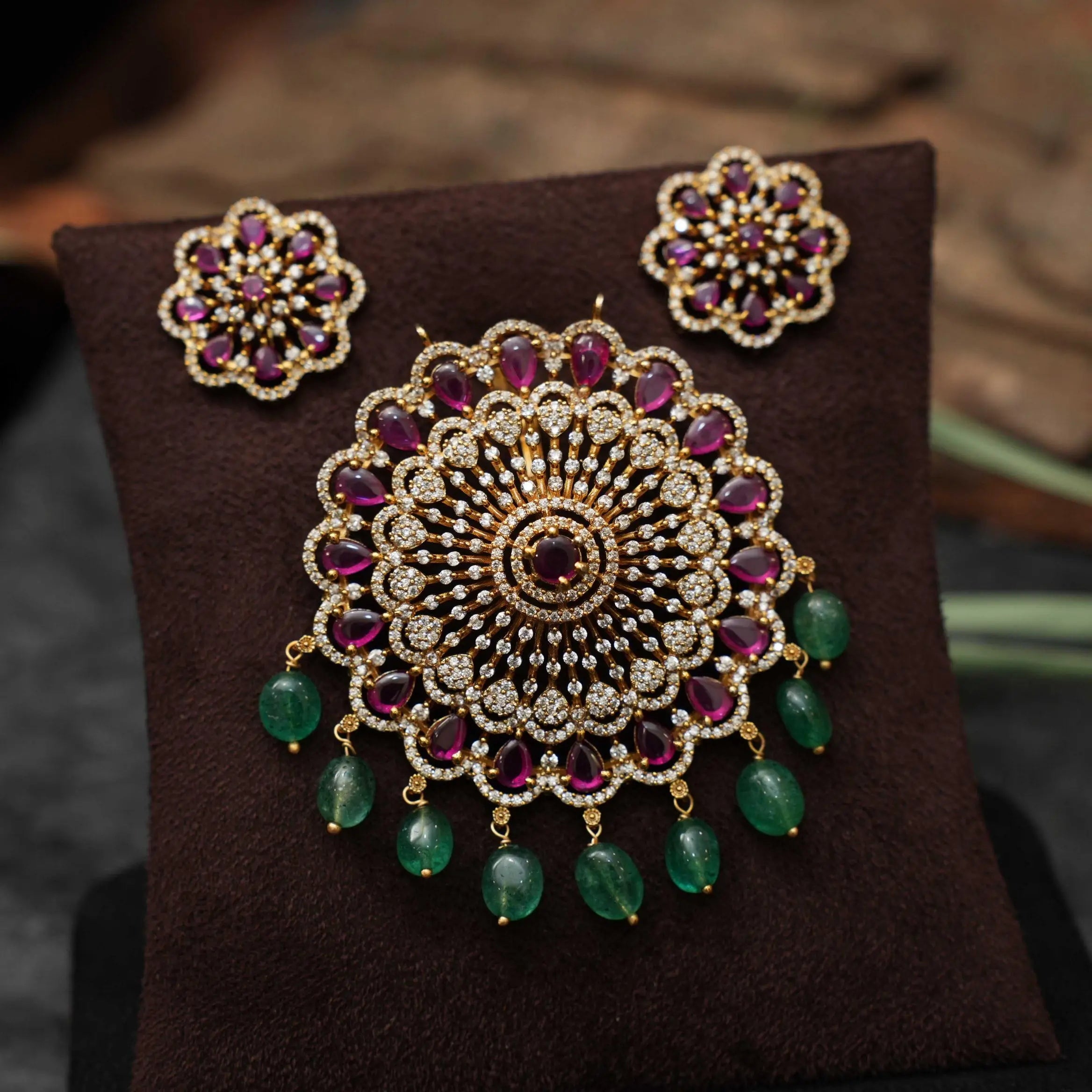 A statement stunning pendant handcrafted in floral motif studded with zircon stones adorn with green beads. This set compliments a pair of ear stud.