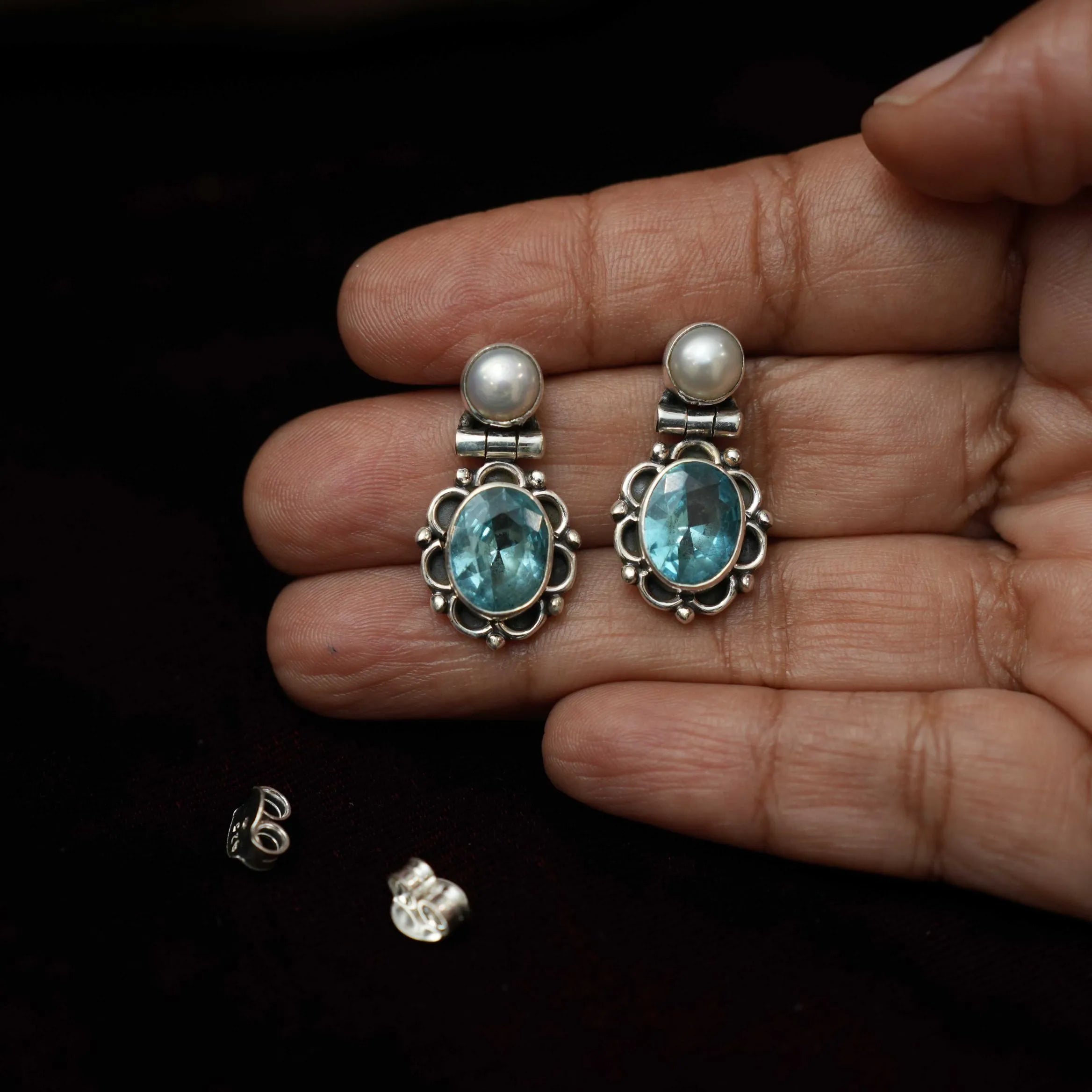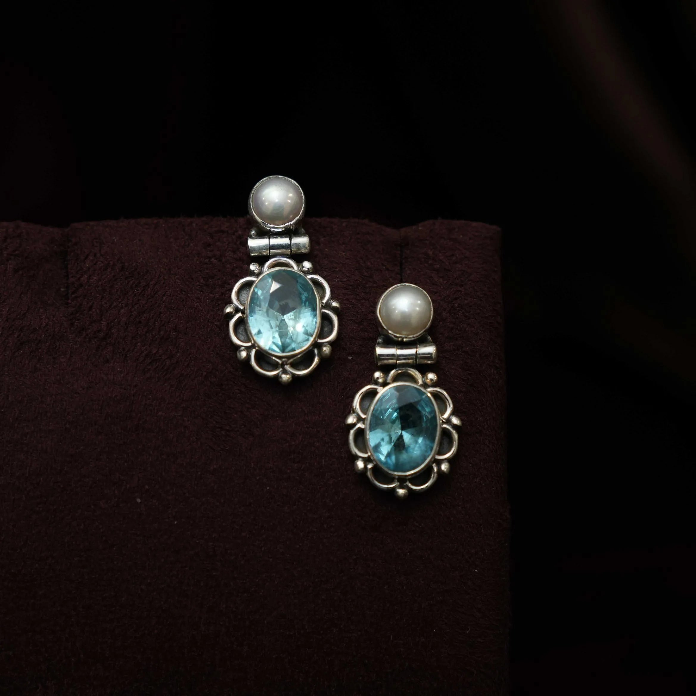 A classic silver oxidised earring adorn with pearl and pastel blue stones.