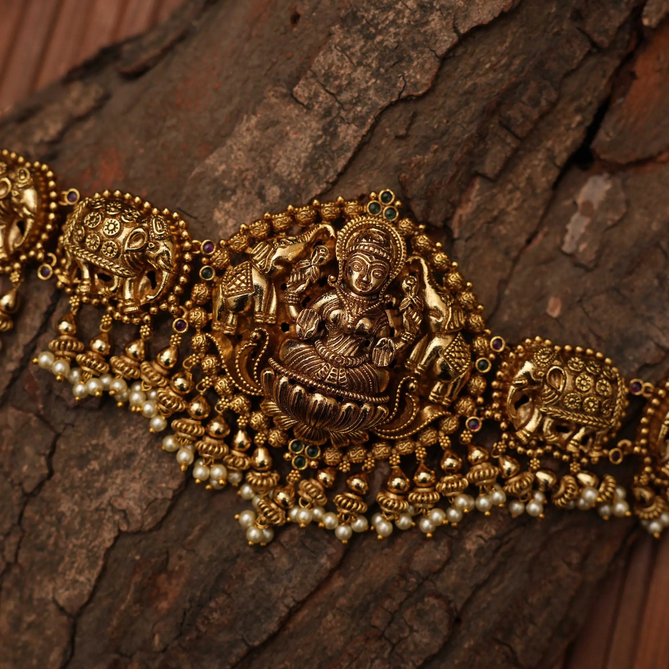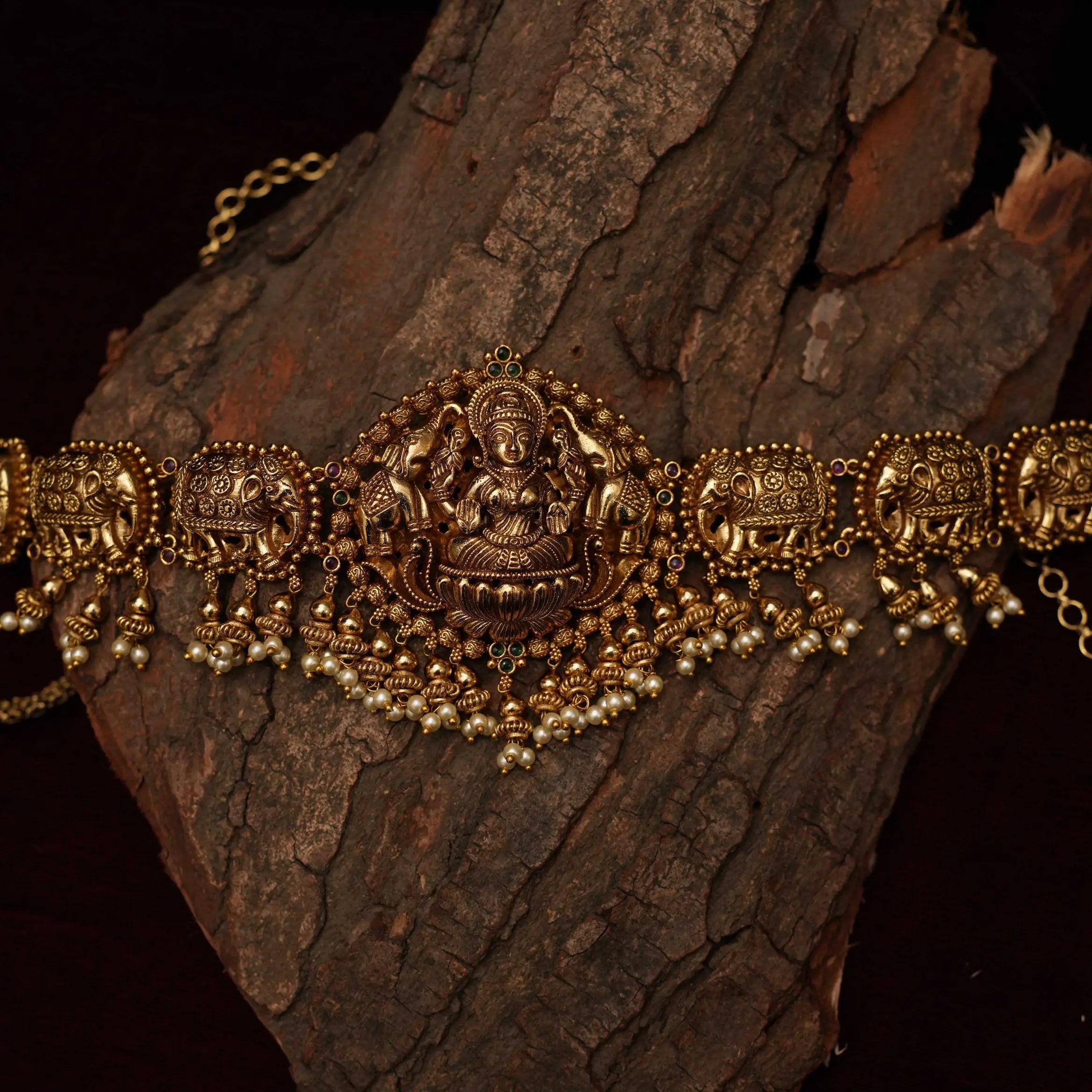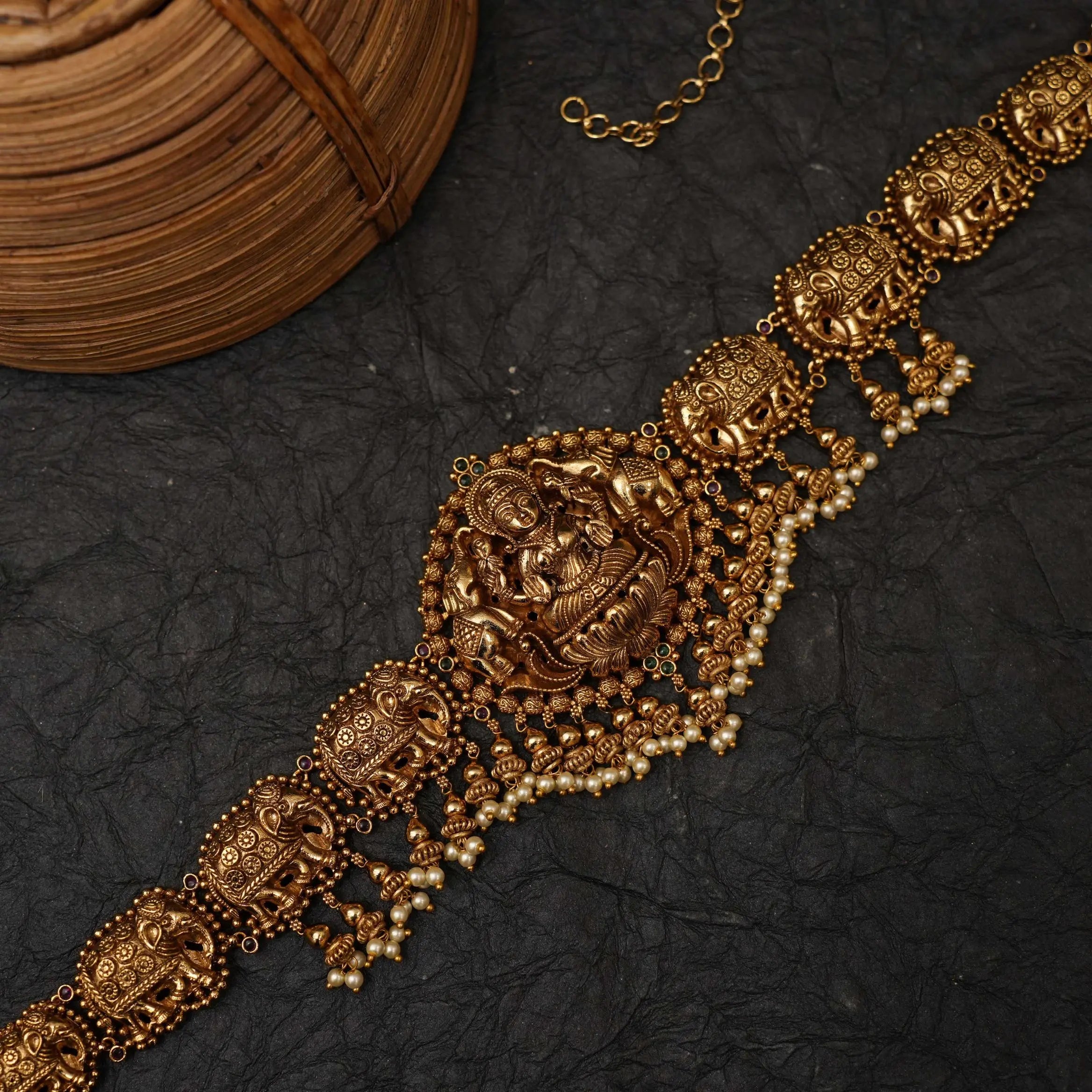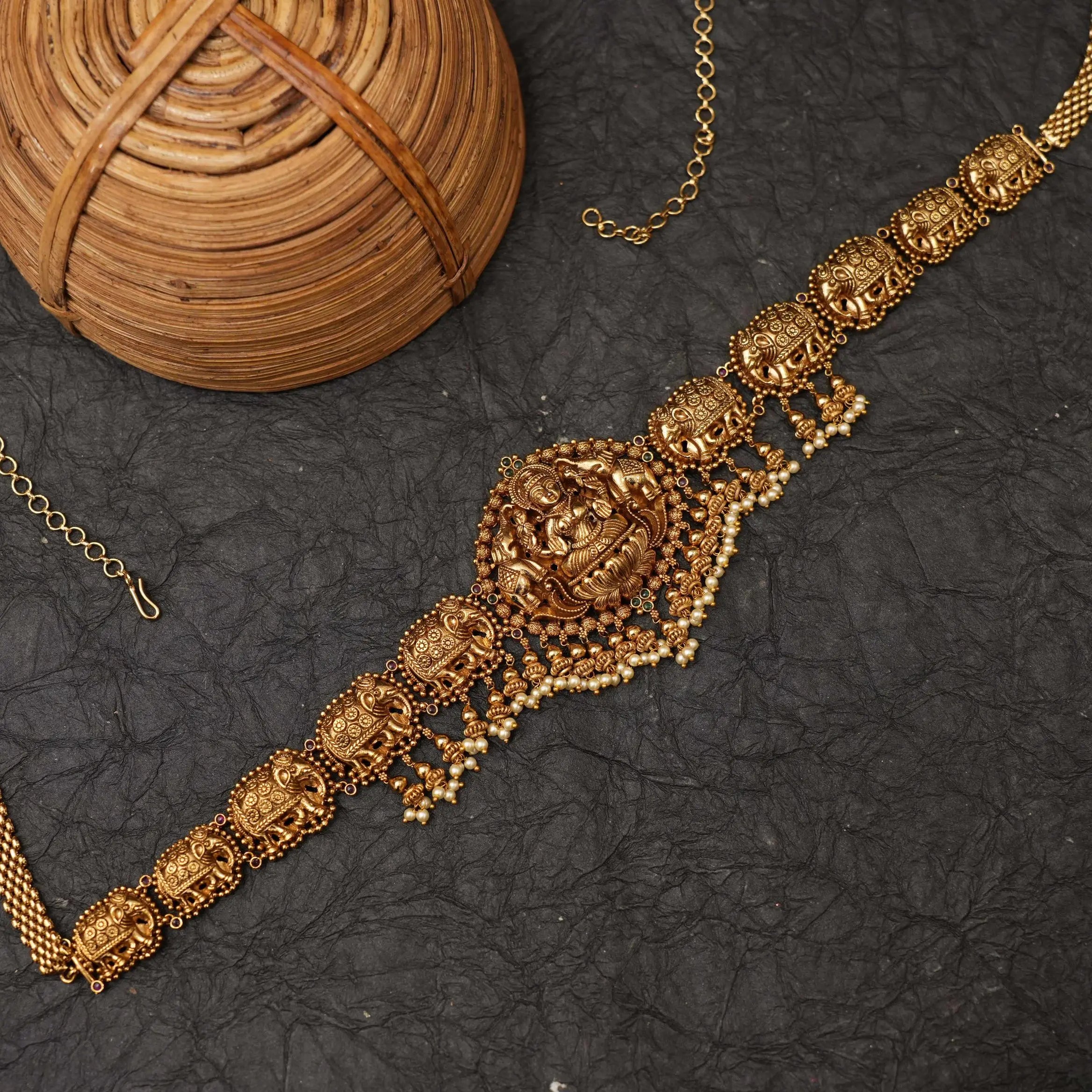 A beautifully crafted antique-finish hip belt featuring an exquisite row of peacock motifs, each sculpted with intricate nakshi detailing that reflects the richness of traditional South Indian craftsmanship. The central design showcases a floral medallion surrounded by delicately carved peacocks, symbolising grace, prosperity, and beauty. Accents of red and green stones add a subtle pop of colour, enhancing the ornate design without overpowering its antique charm. The lower edge is finished with a stunning row of green bead drops interspersed with tiny pearls, giving the piece graceful movement and a refined, regal look.