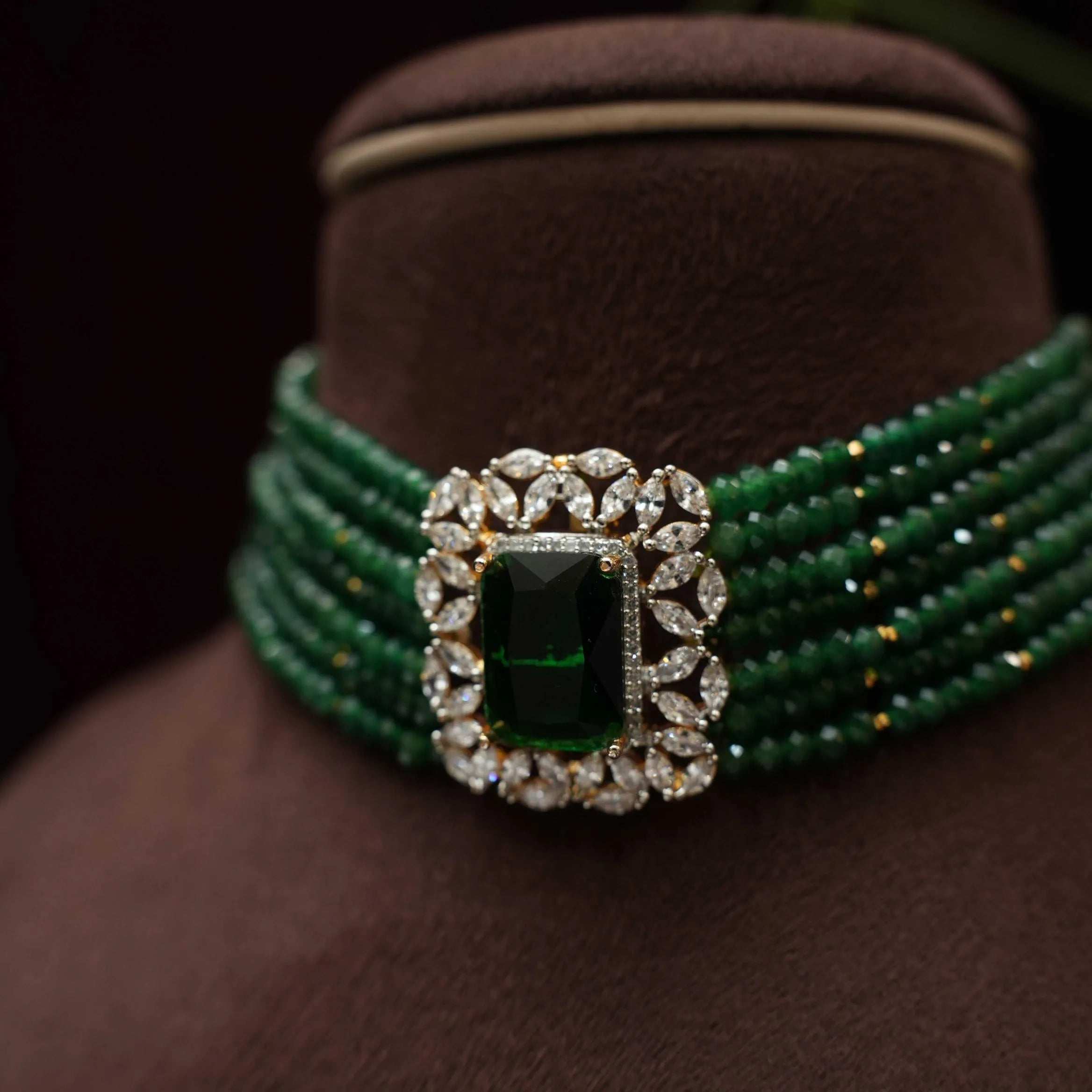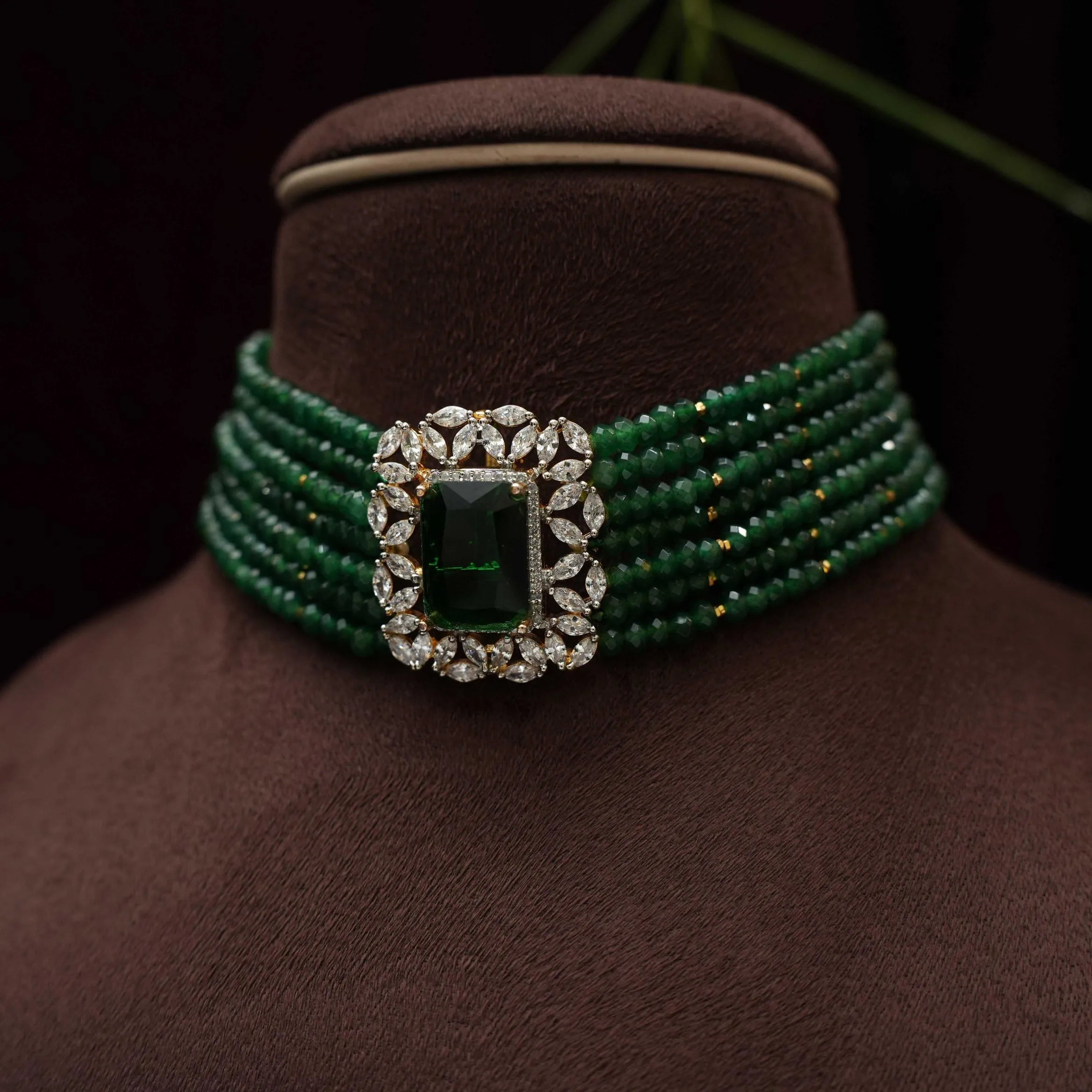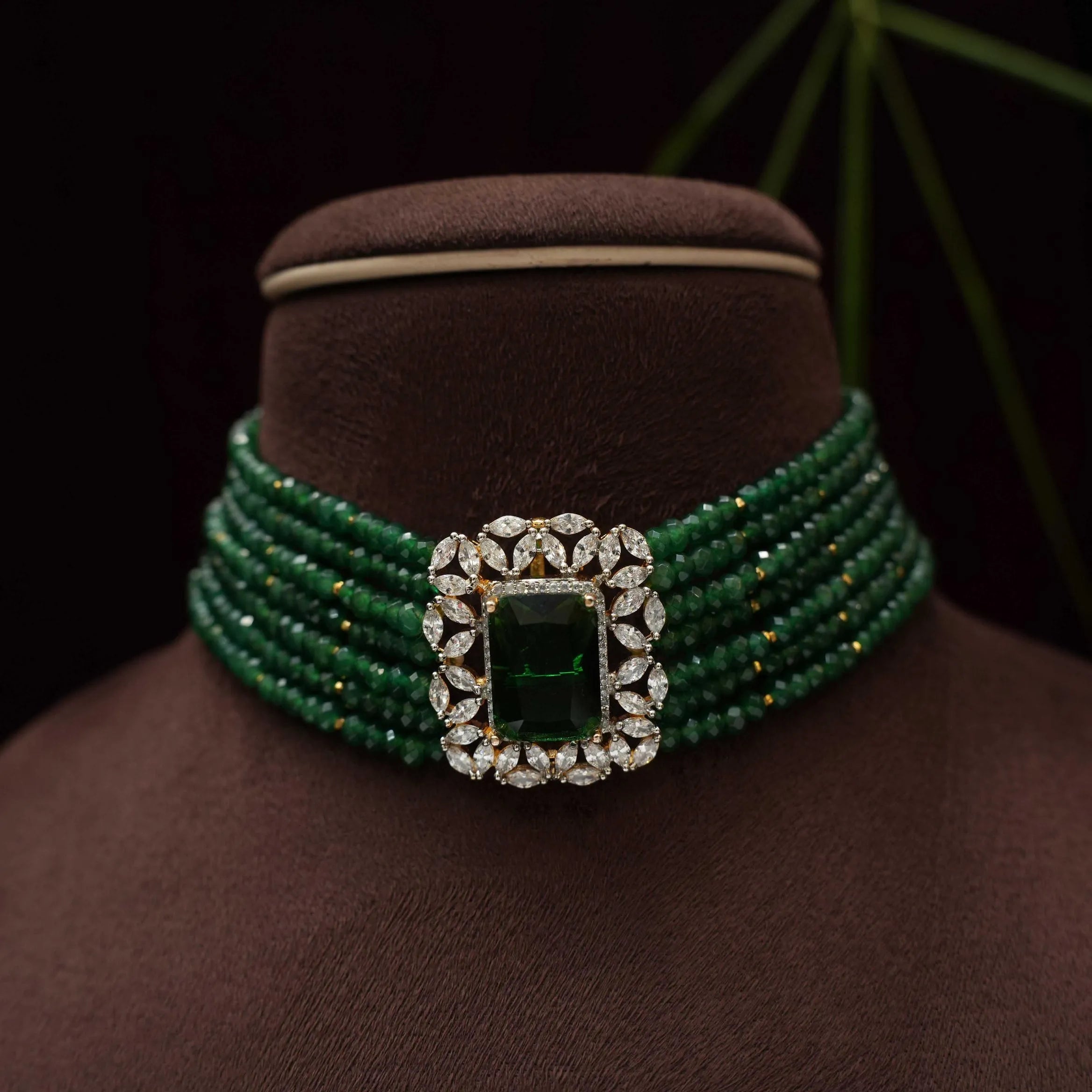 An elegant choker handcrafted in green beads paired to polki pendant. This set comes with a pair of ear stud.