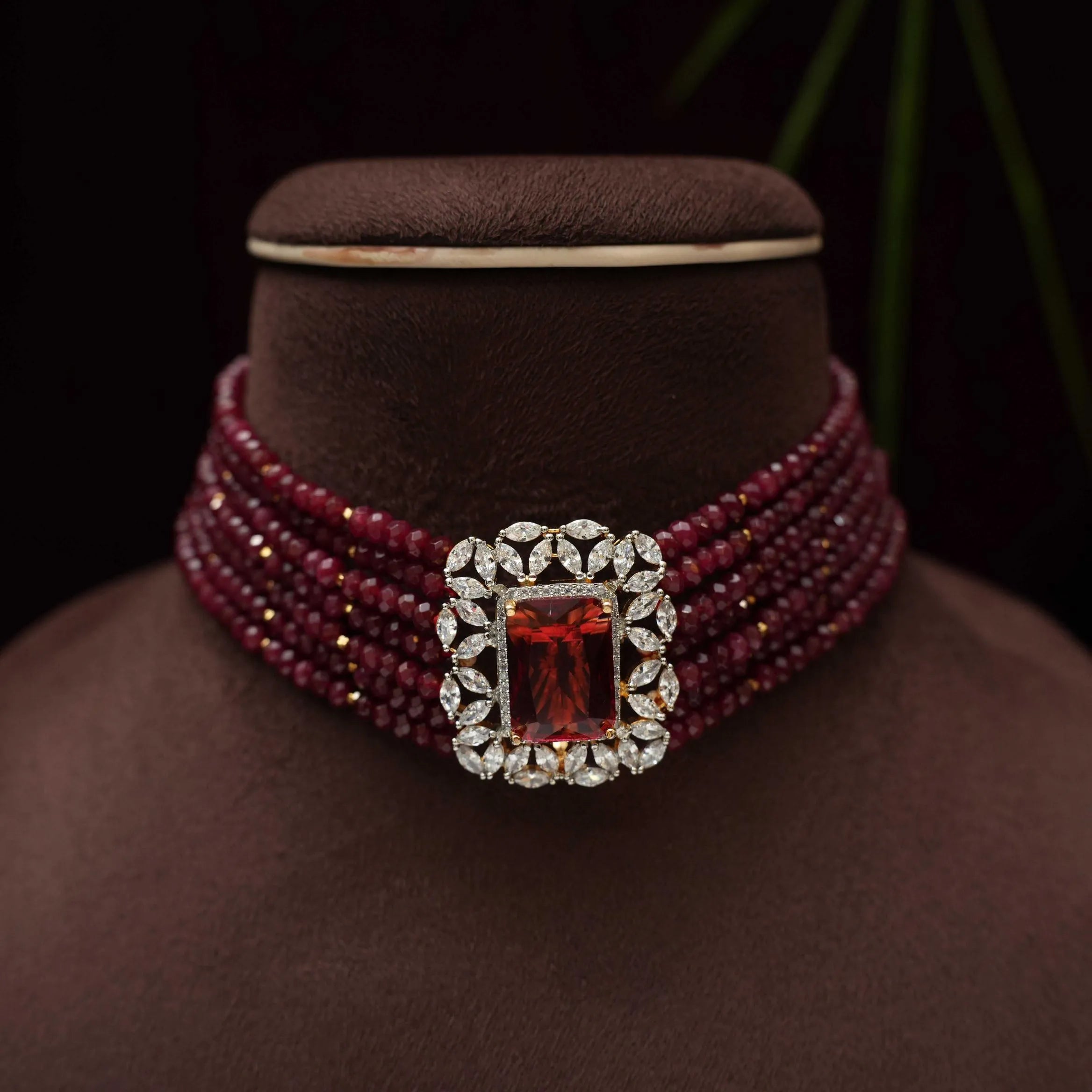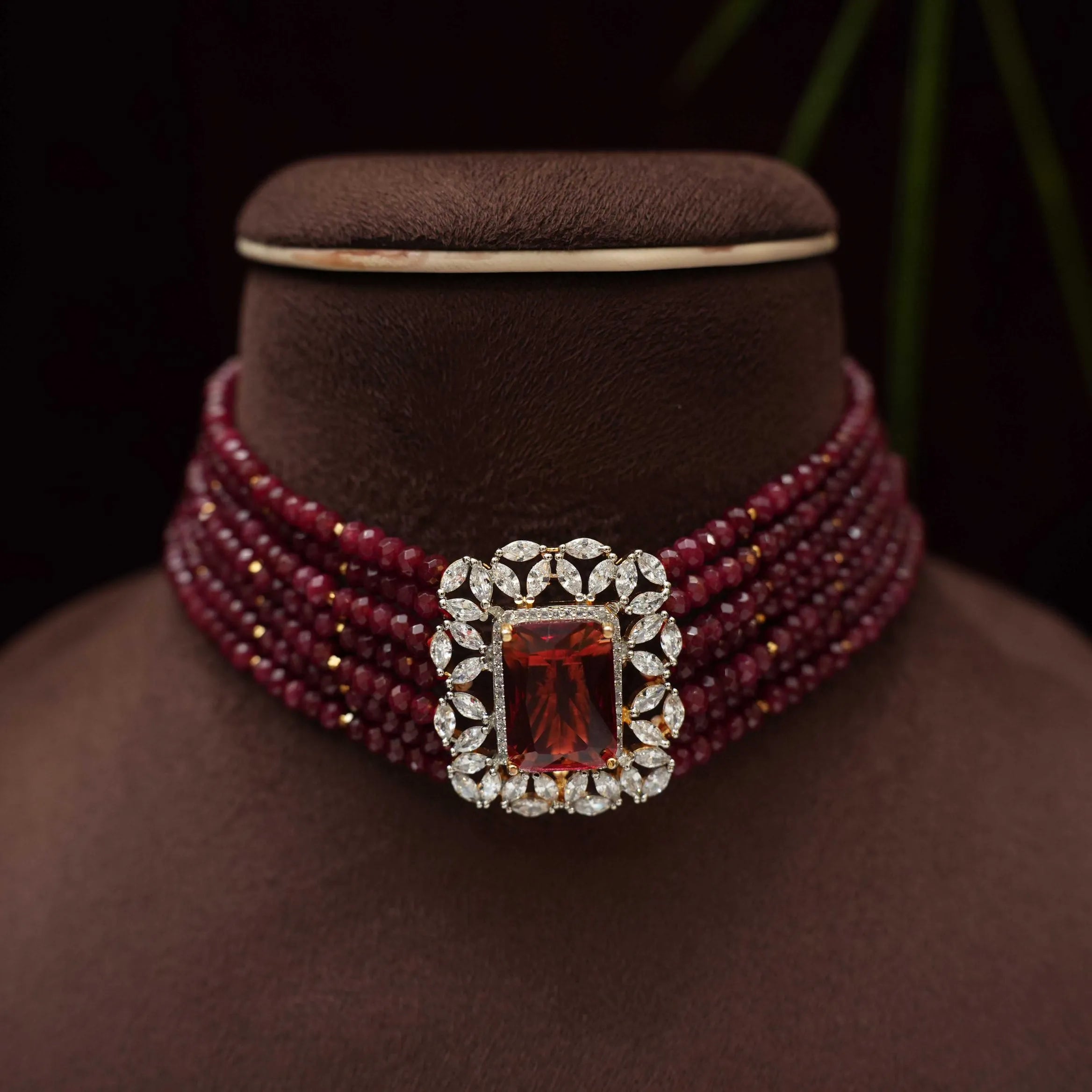 An elegant choker handcrafted in red beads paired to polki pendant. This set comes with a pair of ear stud.