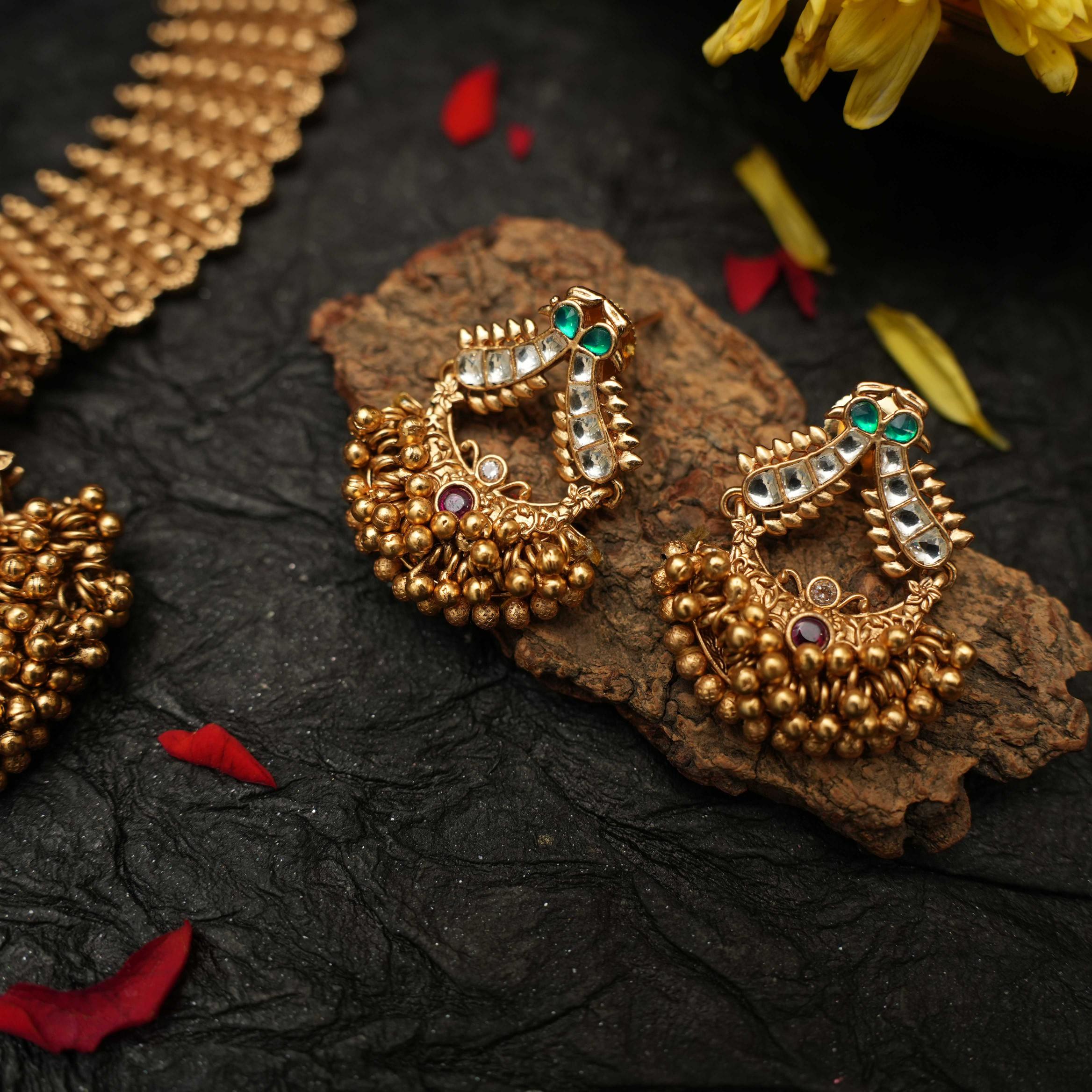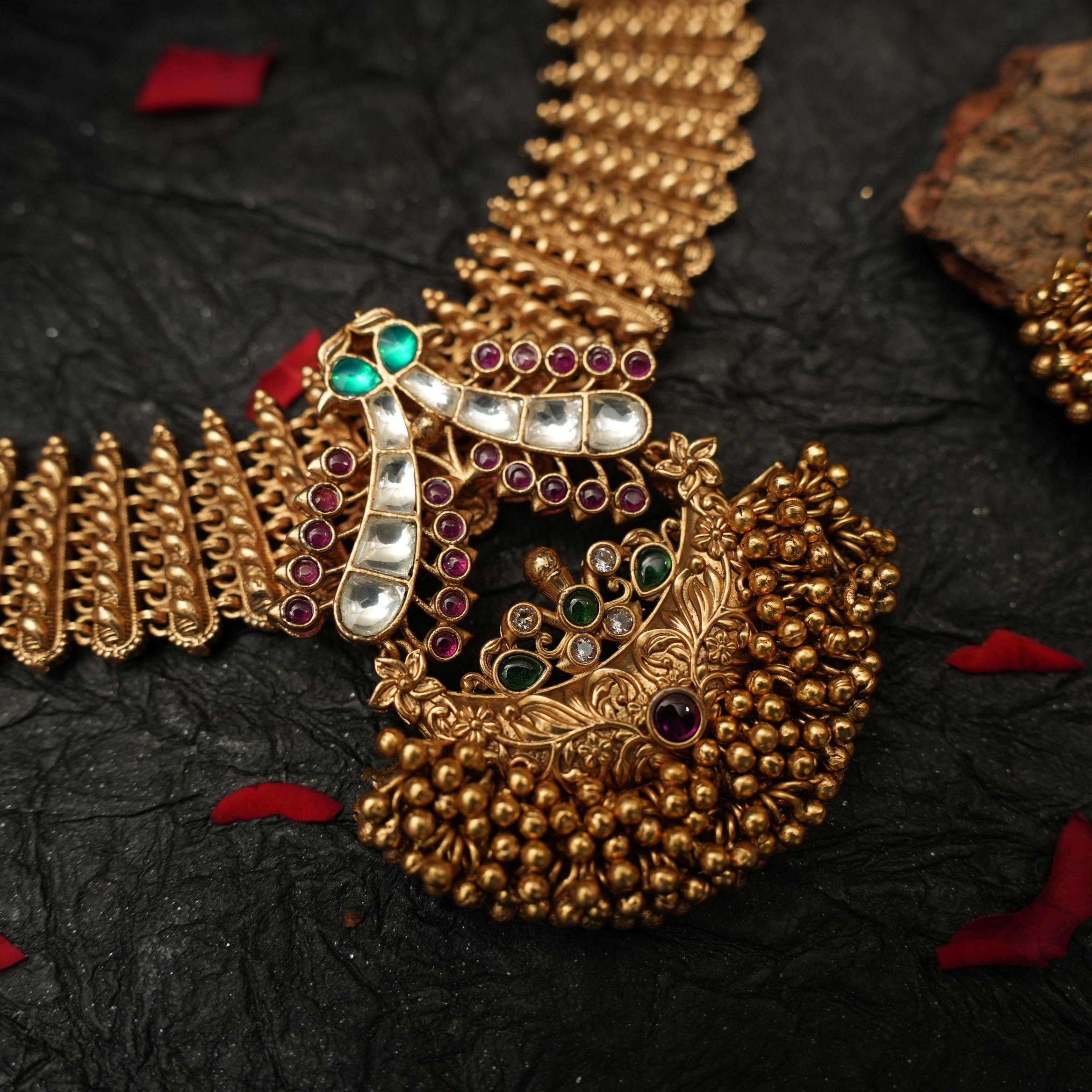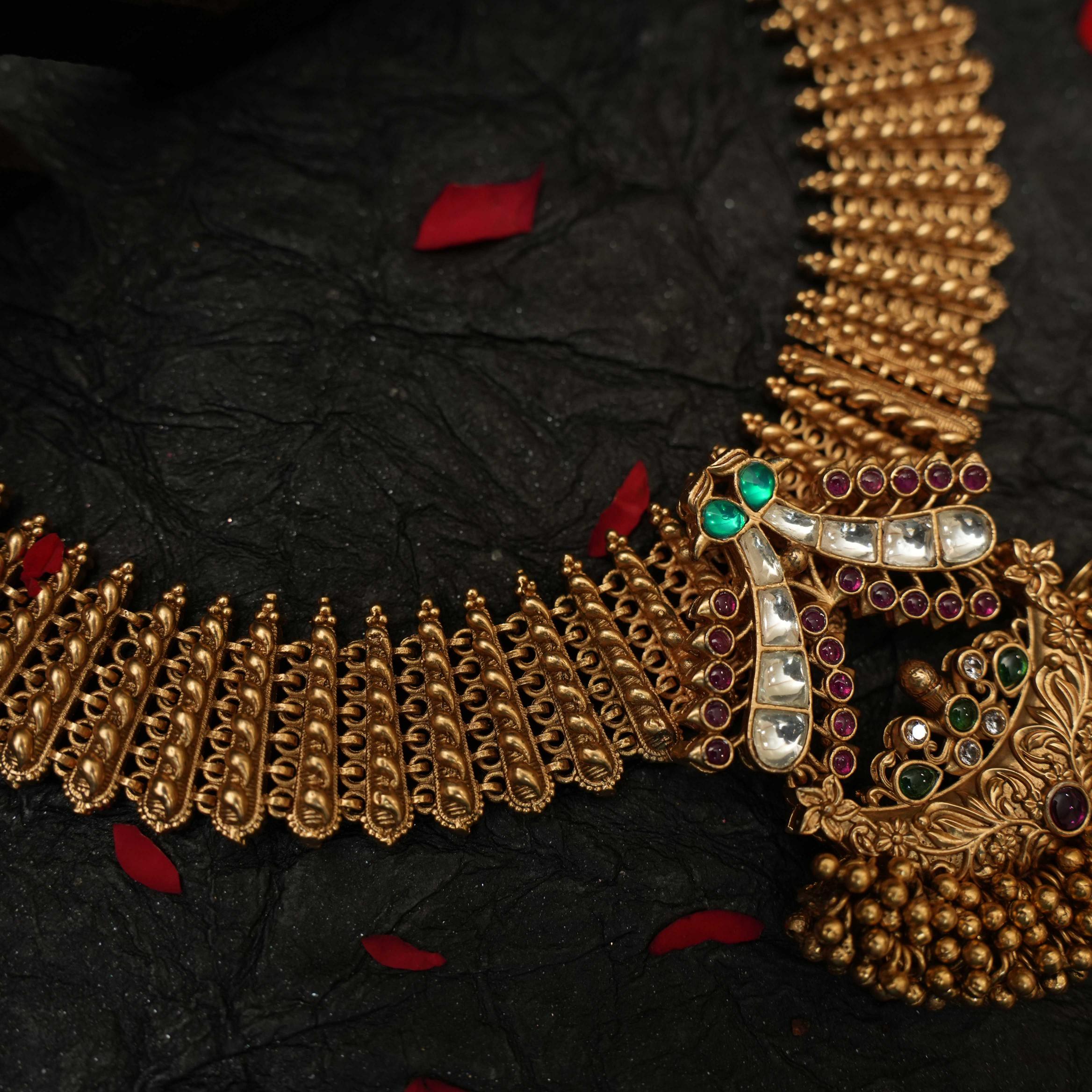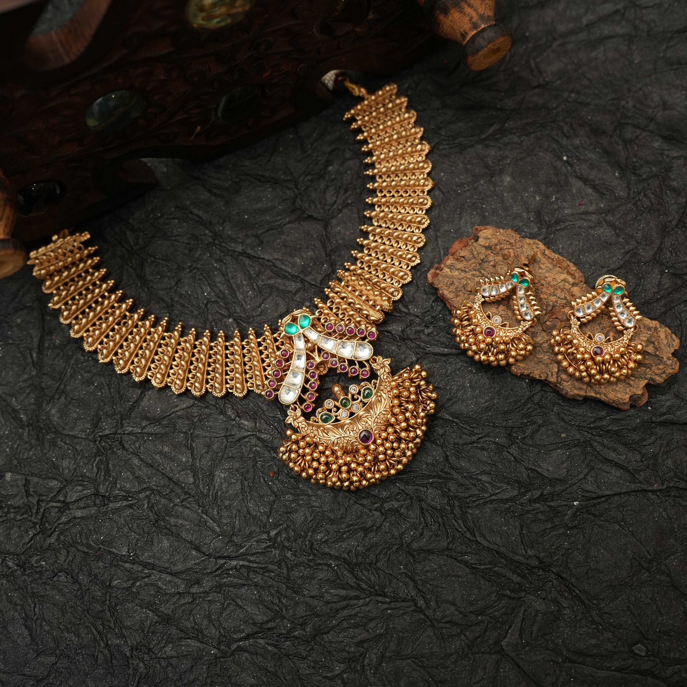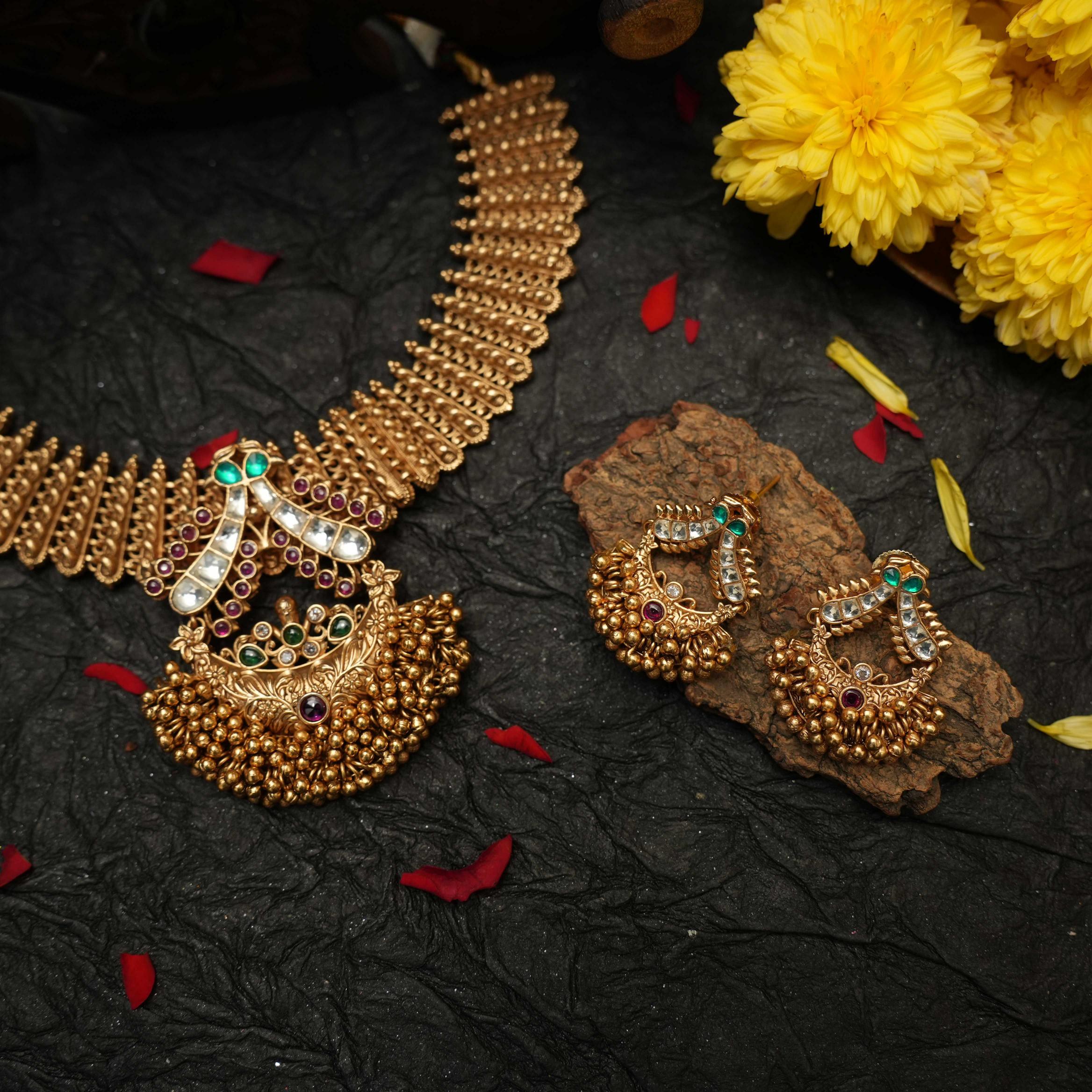 A statement antique necklace in traditional motifs studded with kemp stones. This set complements a pair of earrings.