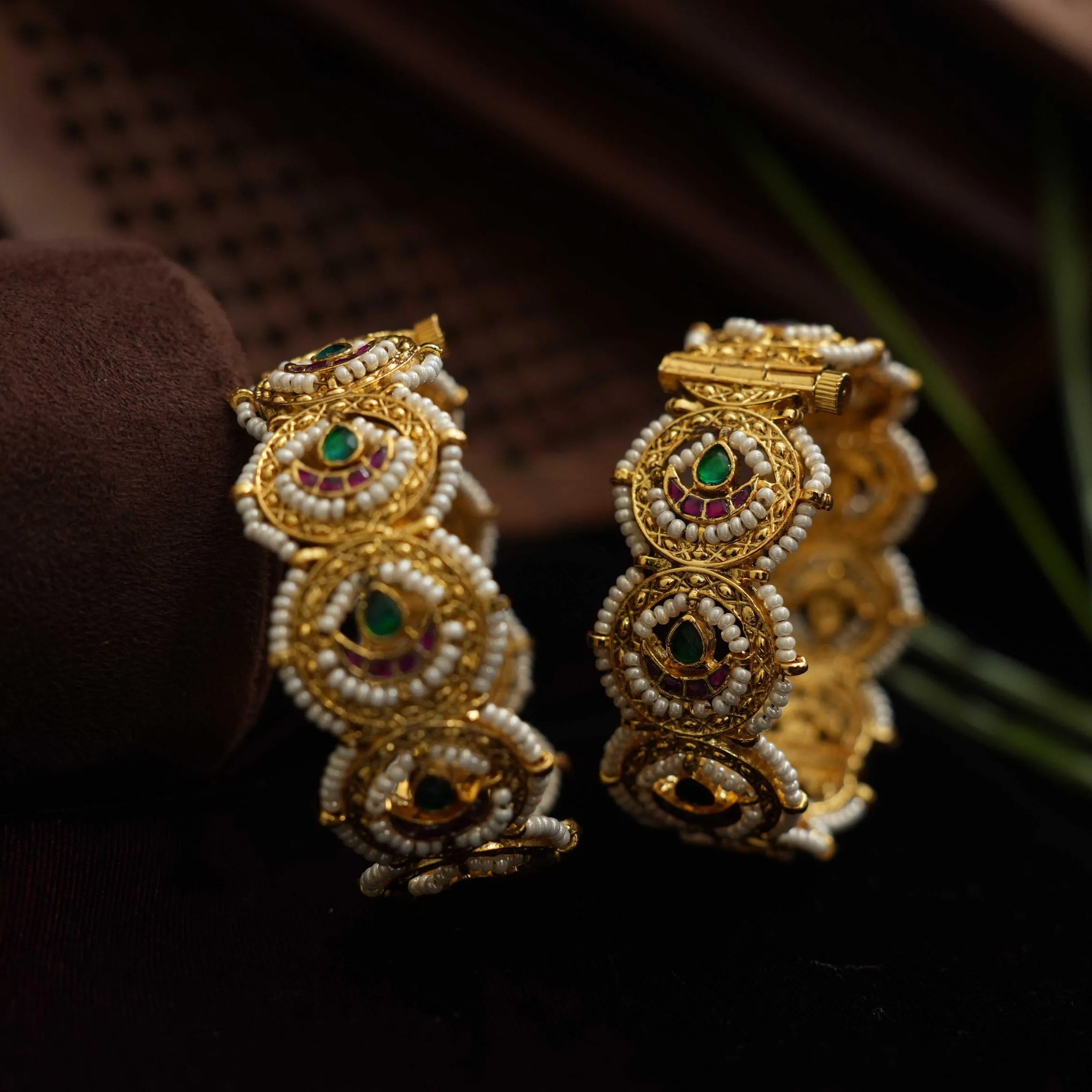 A stunning pair of kada bangle in chand motif studded with polki stones & pearls.