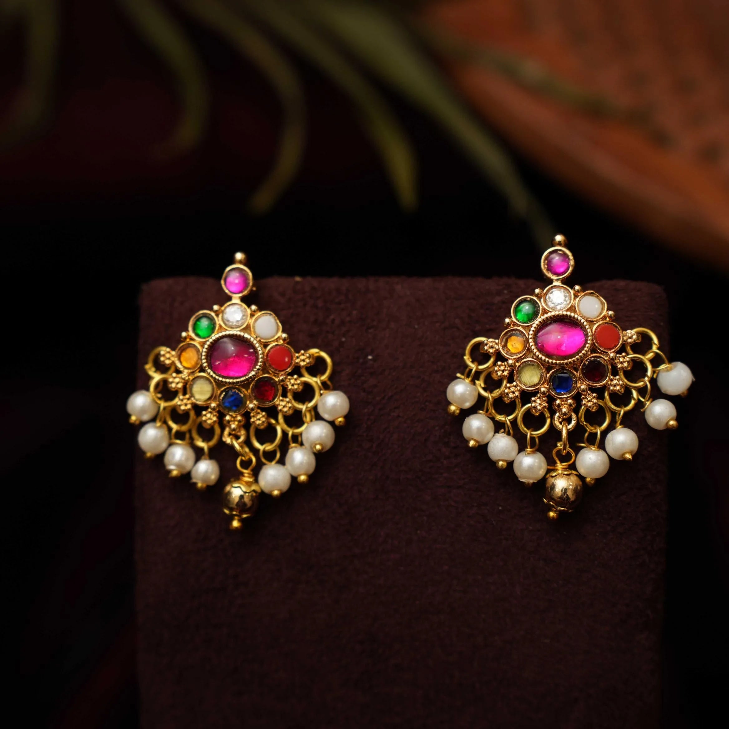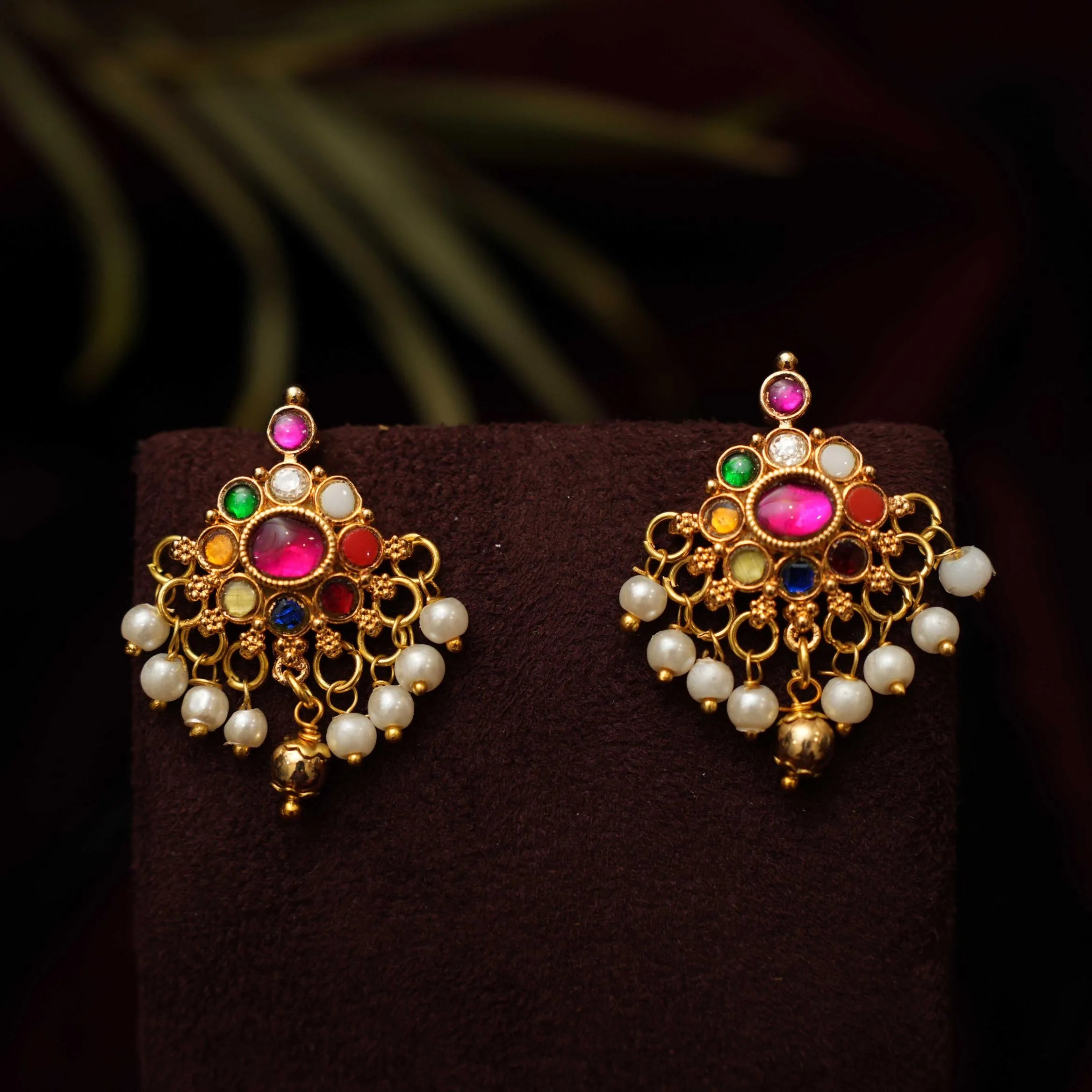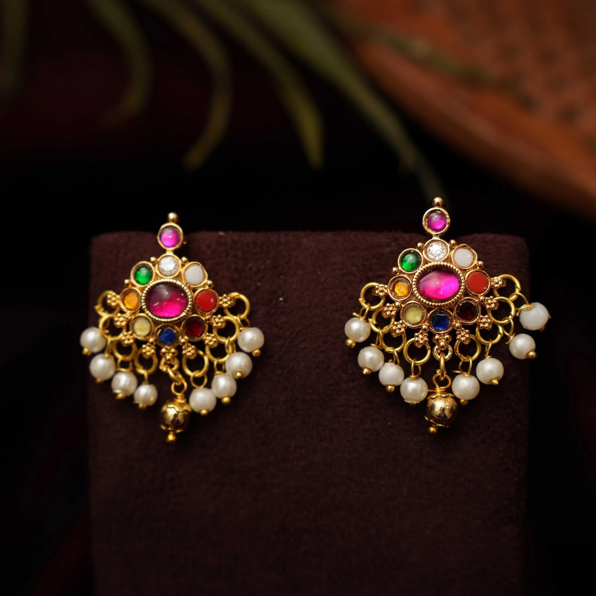 A classic earrings in chand and Goddess Lakshmi motif studded with kemp stones & pearls.