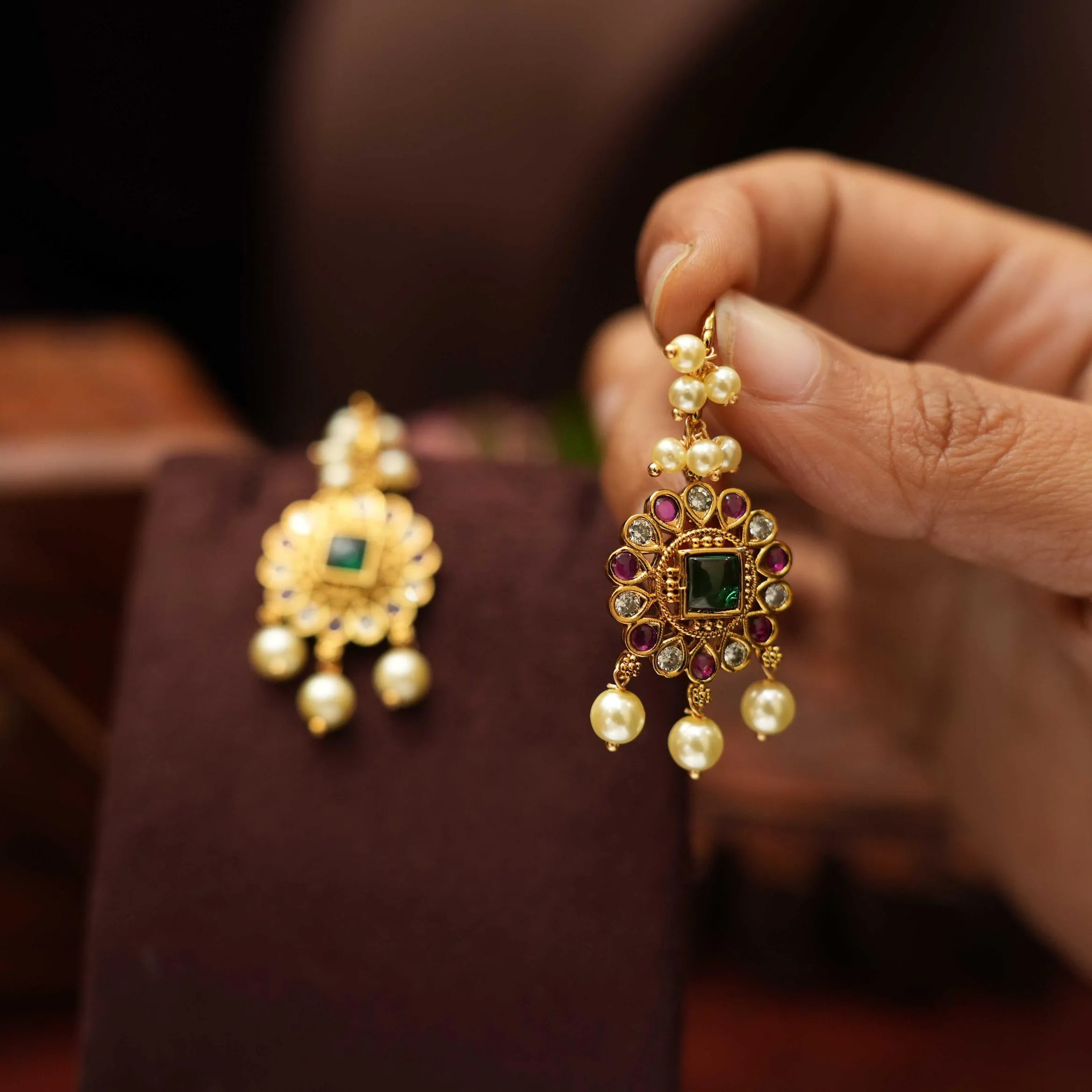 A beautiful antique designer earrings adorn with green and white stones highlighted by pearls.
