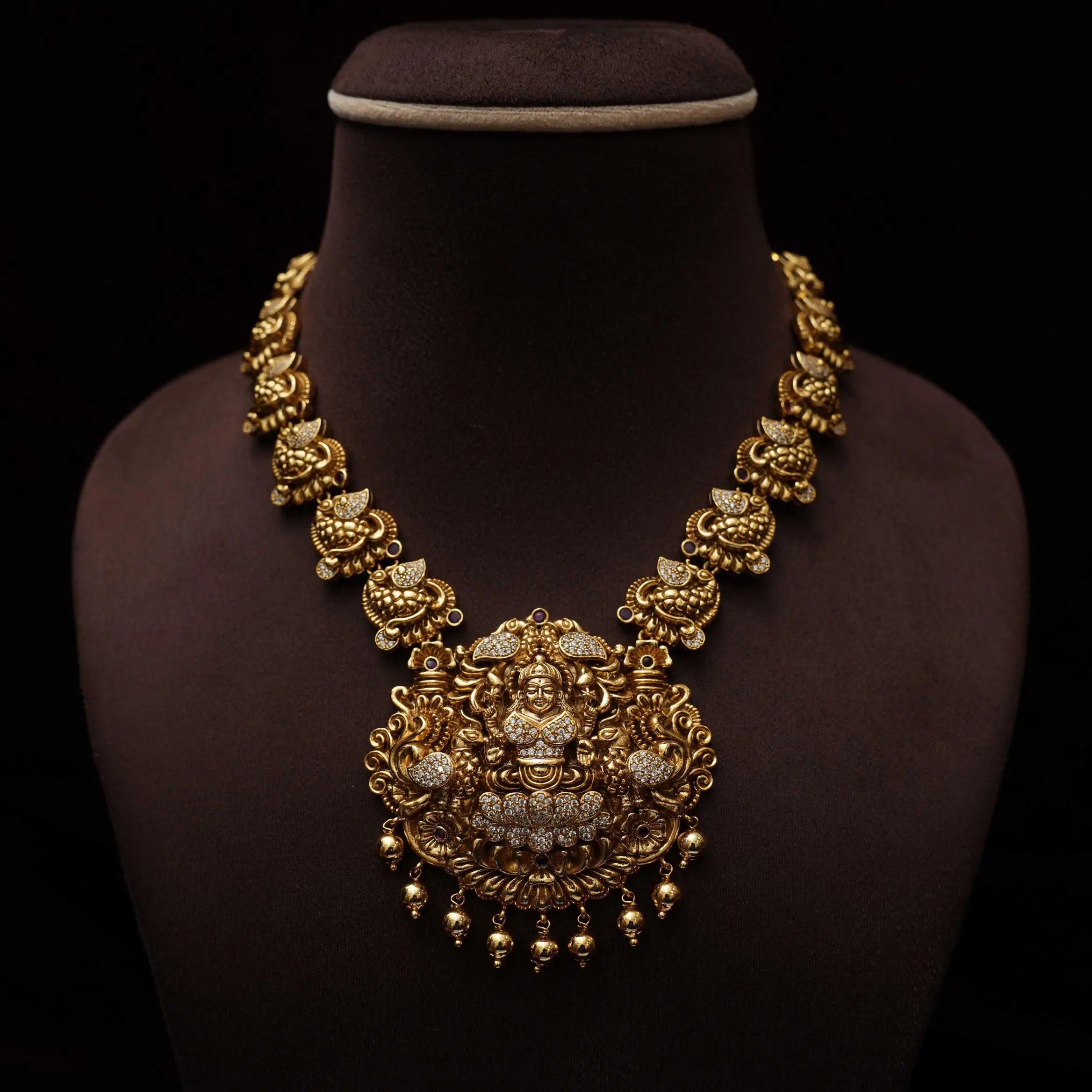 This choker-style necklace is a traditional Indian jewelry piece that stands out for its intricate design and regal elegance. Crafted in a rich golden tone, it features detailed embossed motifs—likely inspired by temple deities from South Indian art—arranged in a row along the upper section. Below these motifs are delicate strands of small white pearls, followed by a row of gold beads that add texture and depth to the piece. The combination of ornate detailing and layered embellishments makes this necklace an ideal choice for special occasions such as weddings, cultural celebrations, or formal events. It beautifully merges heritage craftsmanship with luxurious appeal, making it not just an accessory, but a statement of tradition and artistry.