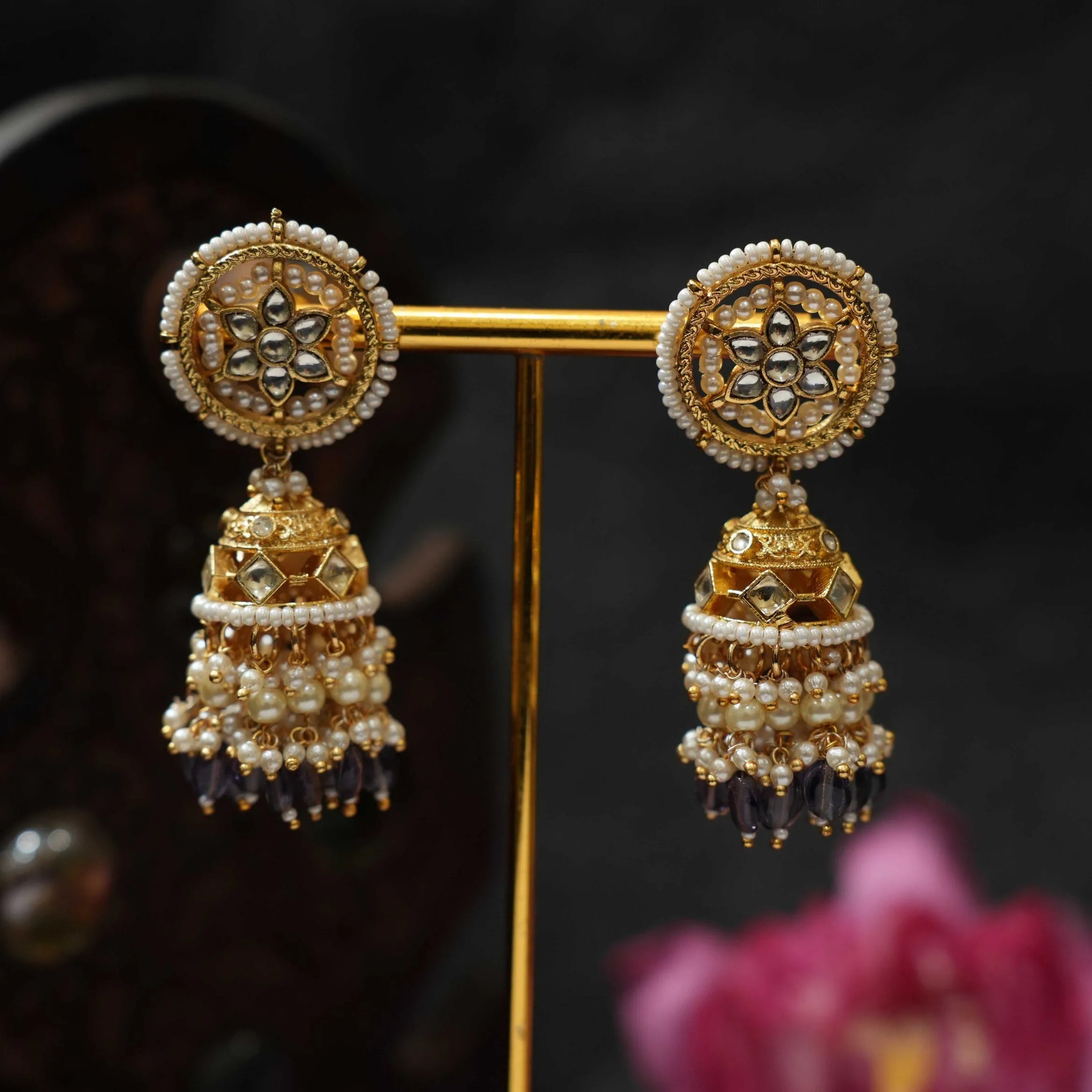 A classic jhumka earrings studded with polki stones, pearls & purple beads.