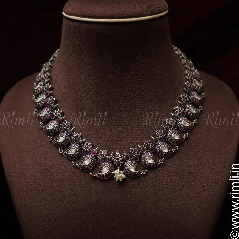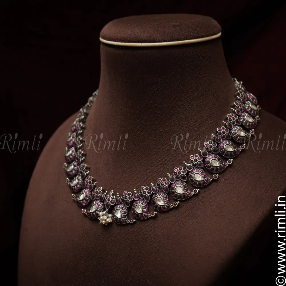 Adorn yourself with grace in our beautiful 92.5 oxidized silver mango necklace, featuring a traditional design and adorned with pearls. This piece captures the essence of cultural richness, adding a touch of elegance and sophistication to your ensemble.