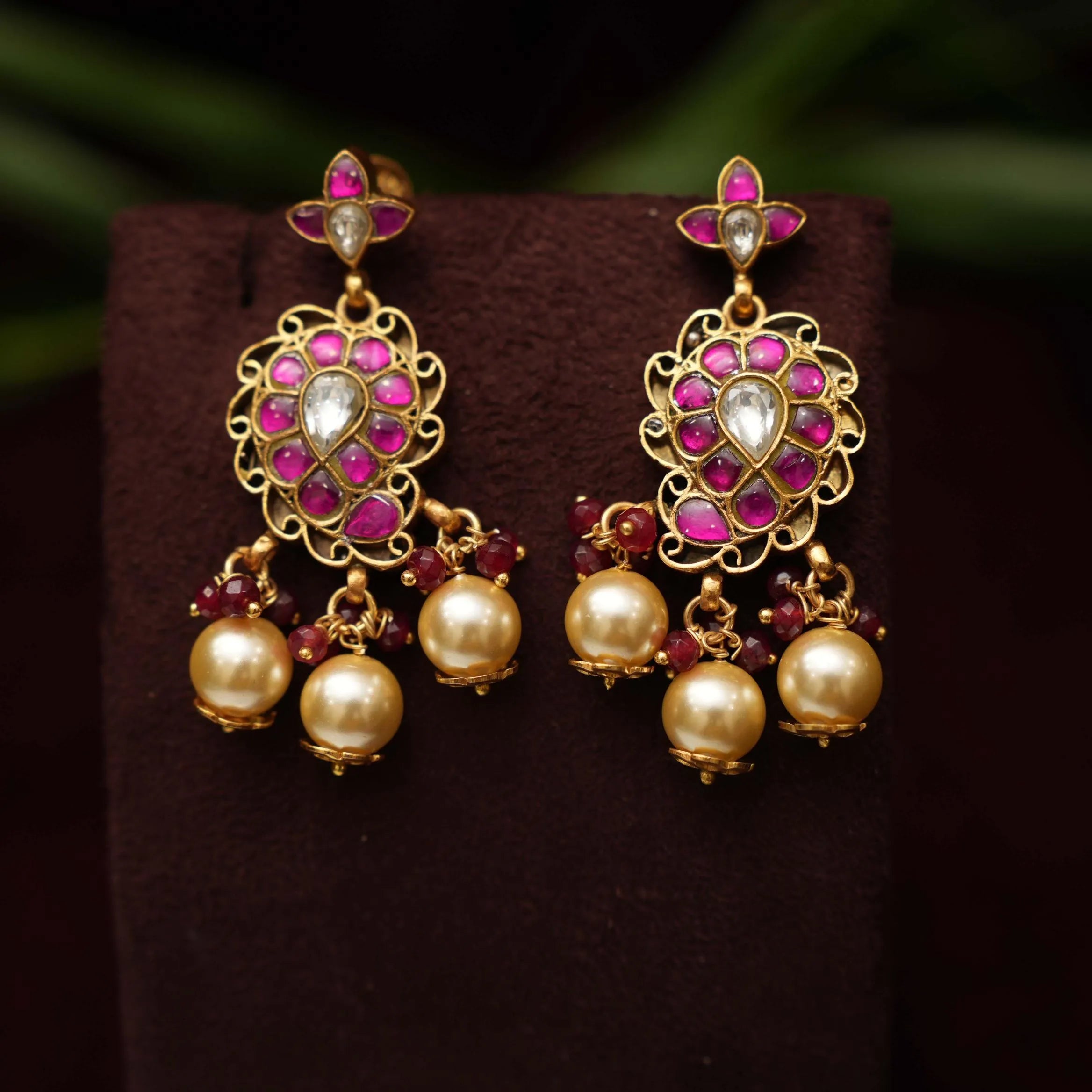 A classic silver designer earrings in floral & mango motif studded with stones, beads & pearls.