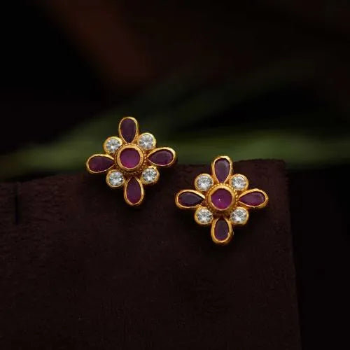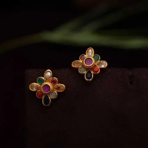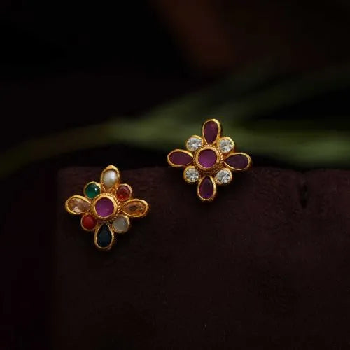 A simple & classic reversible silver ear stud studded with navaratna and red stones.
