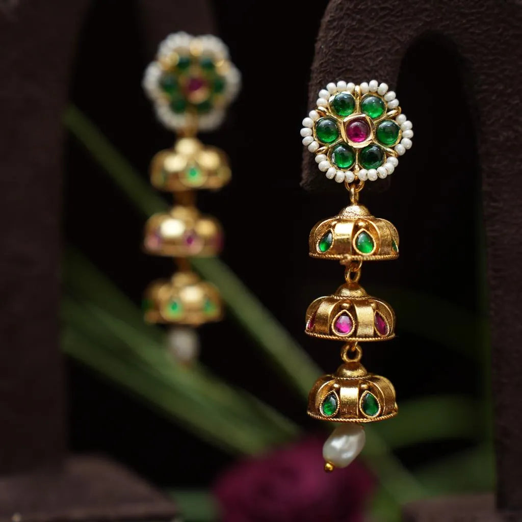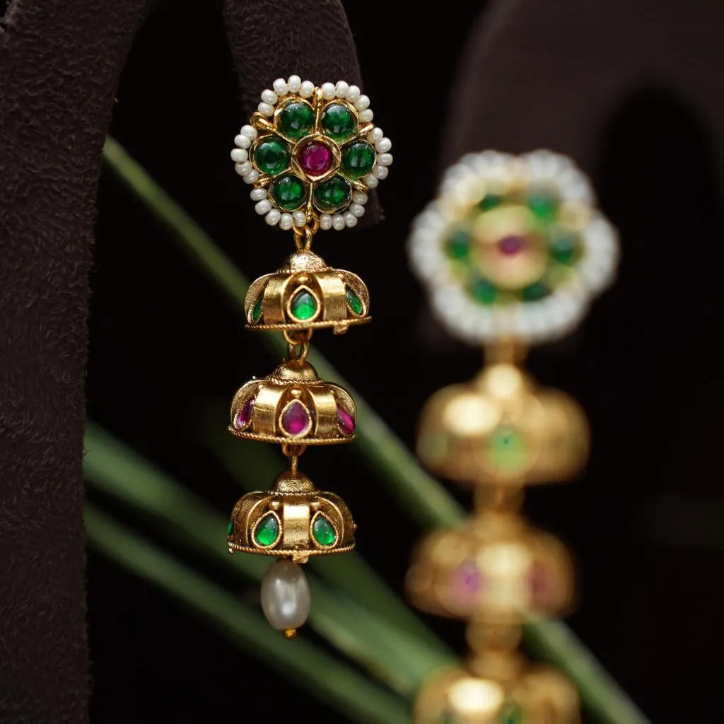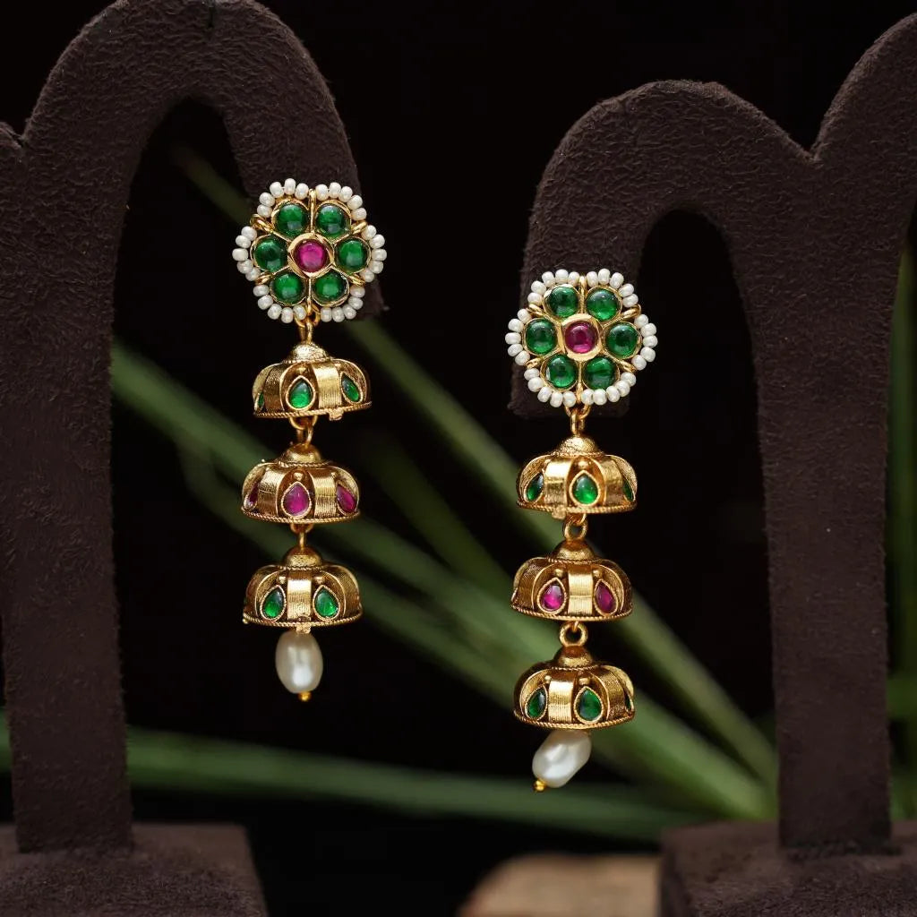 A beautiful handcrafted floral-motif earrings featuring jhumkas accented with elegant pearls.