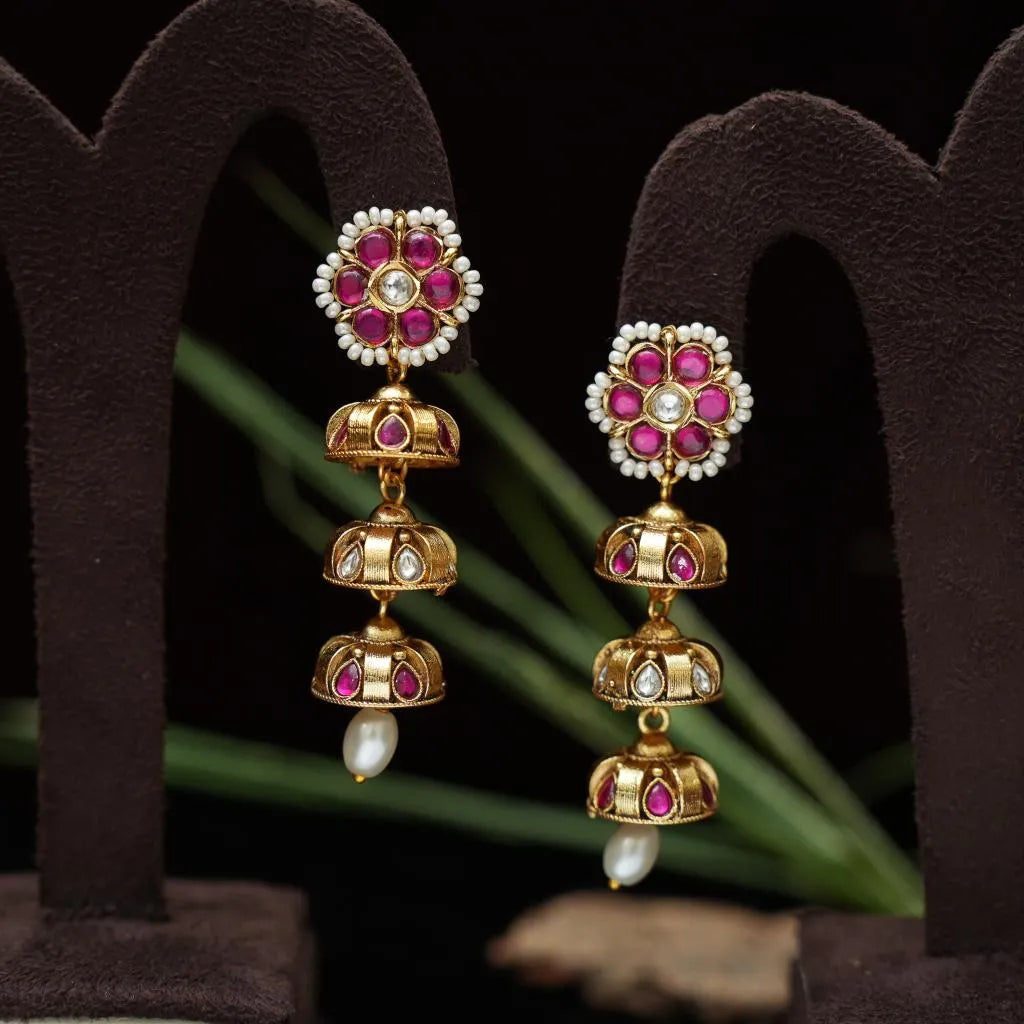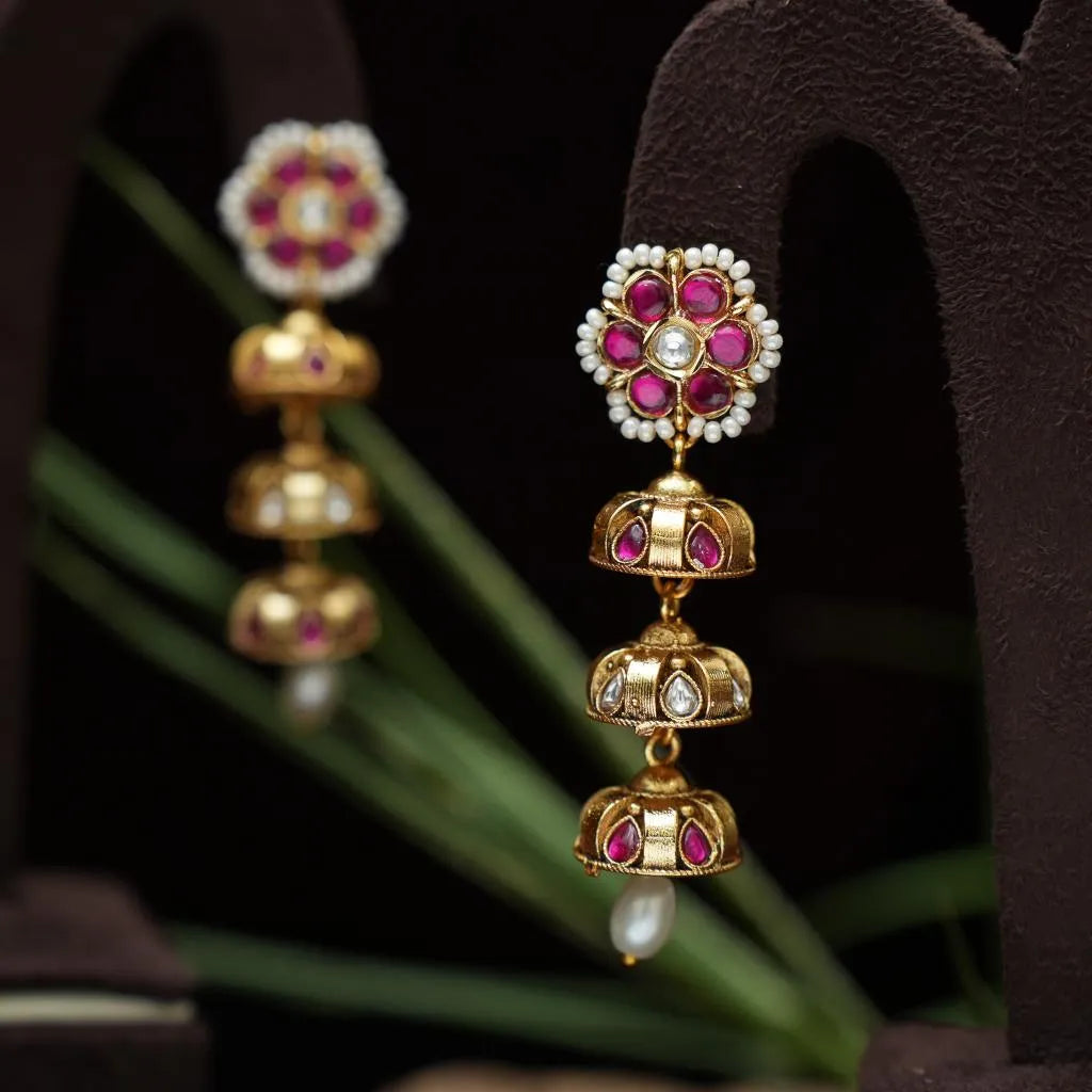 A beautiful handcrafted floral-motif earrings featuring jhumkas accented with elegant pearls.