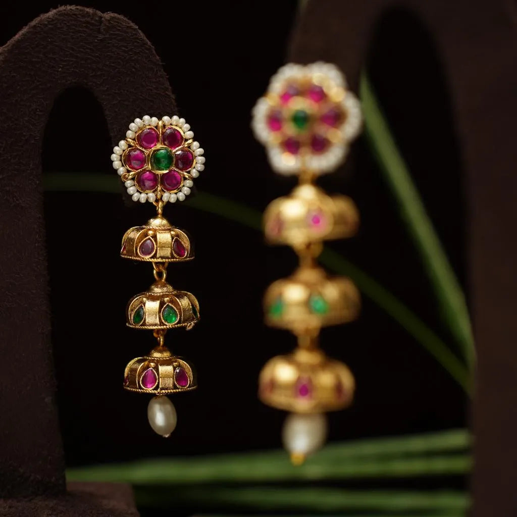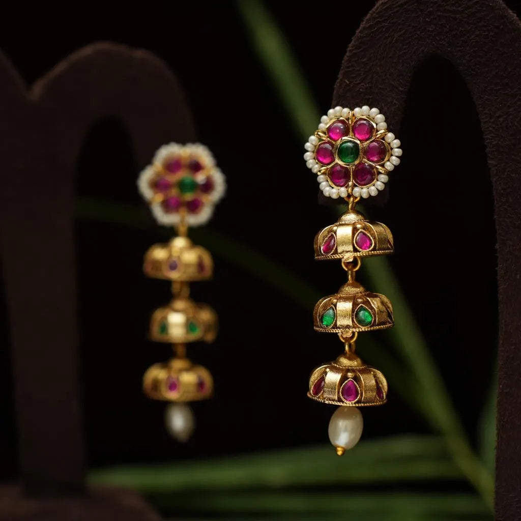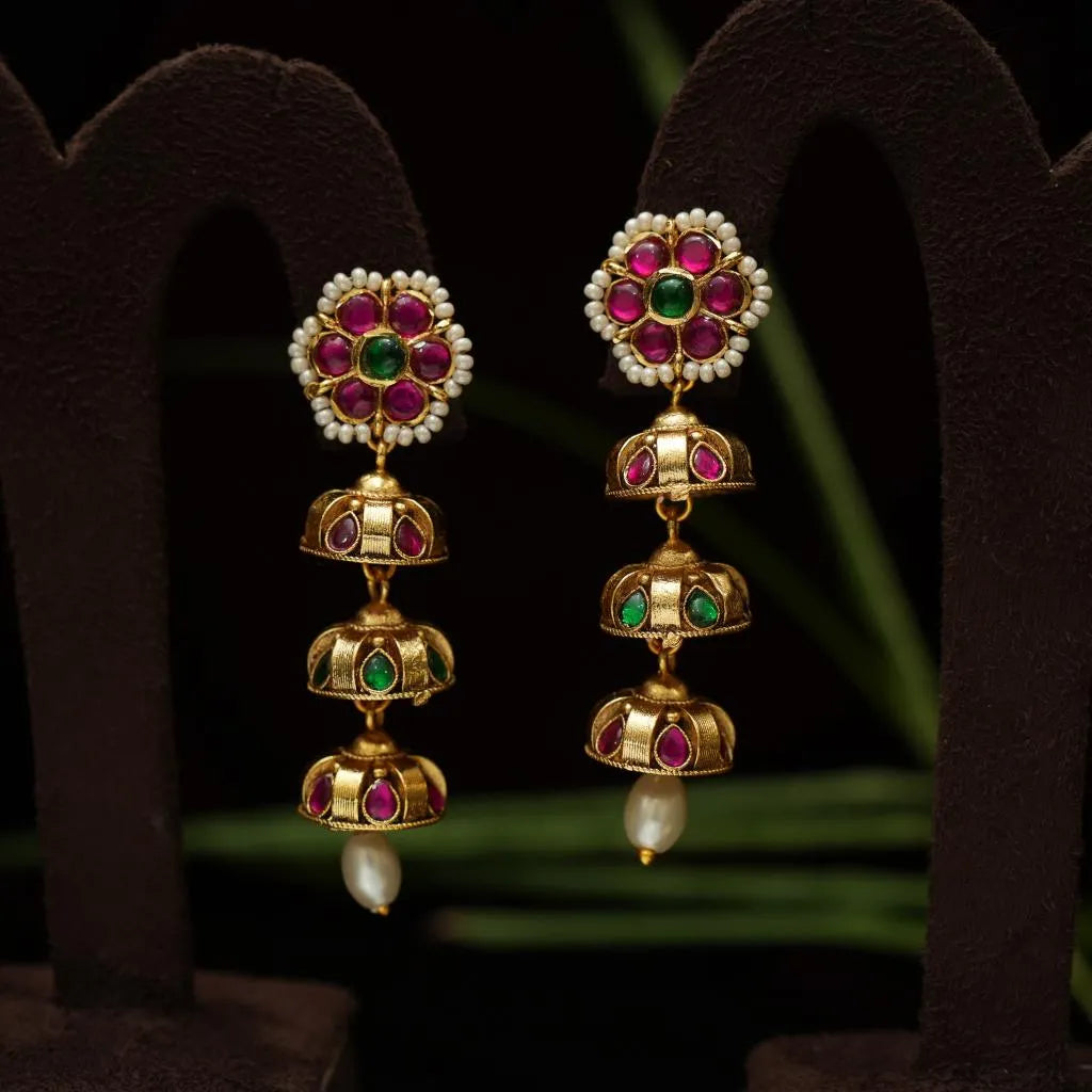 A beautiful handcrafted floral-motif earrings featuring round shaped jhumka accented with elegant pearls.