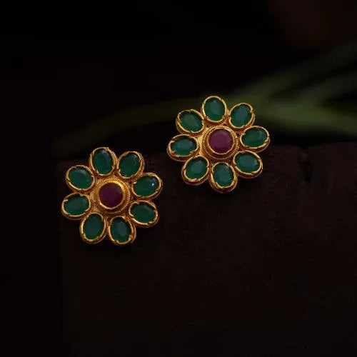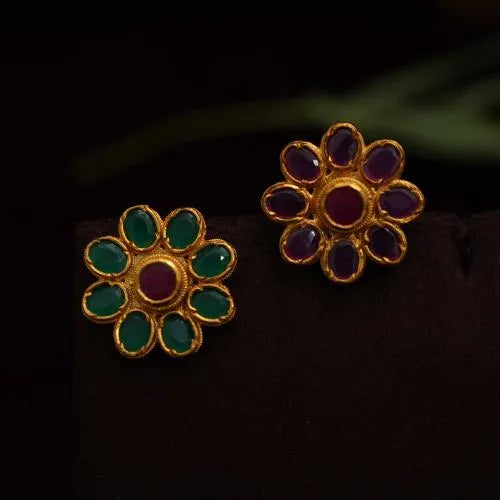 A classic silver reversible ear stud in floral motif studded with red and green kemp stones.