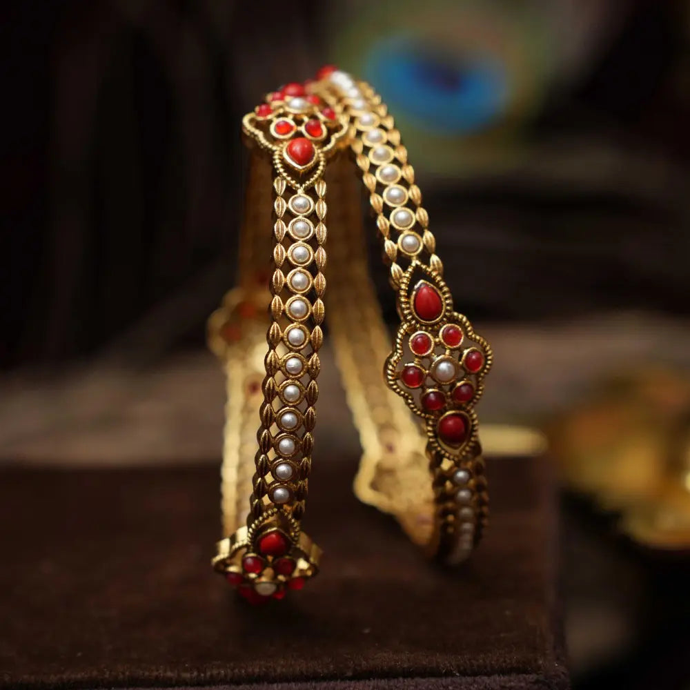 An elegant pair of antique bangles adorned with pearl & coral like red stones.