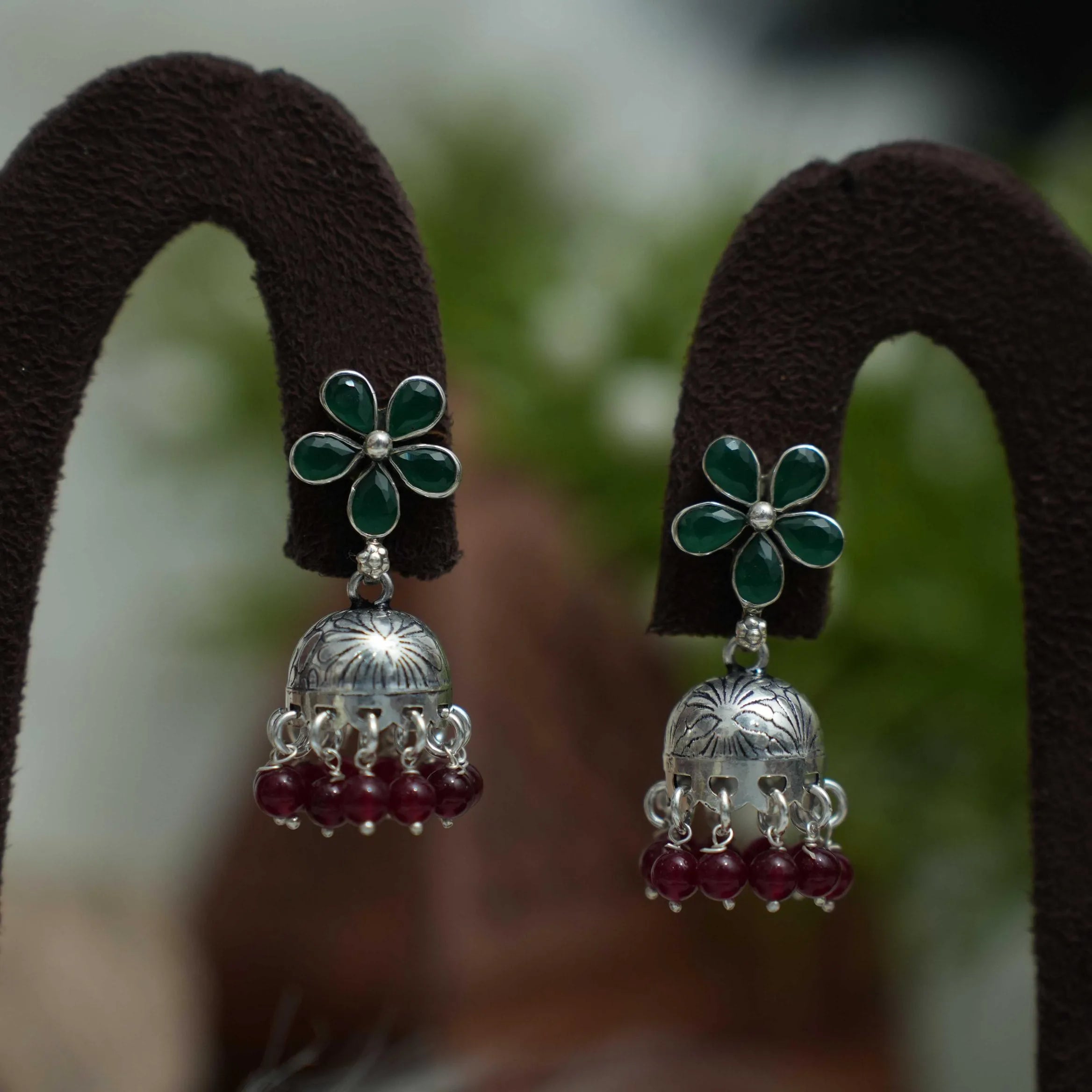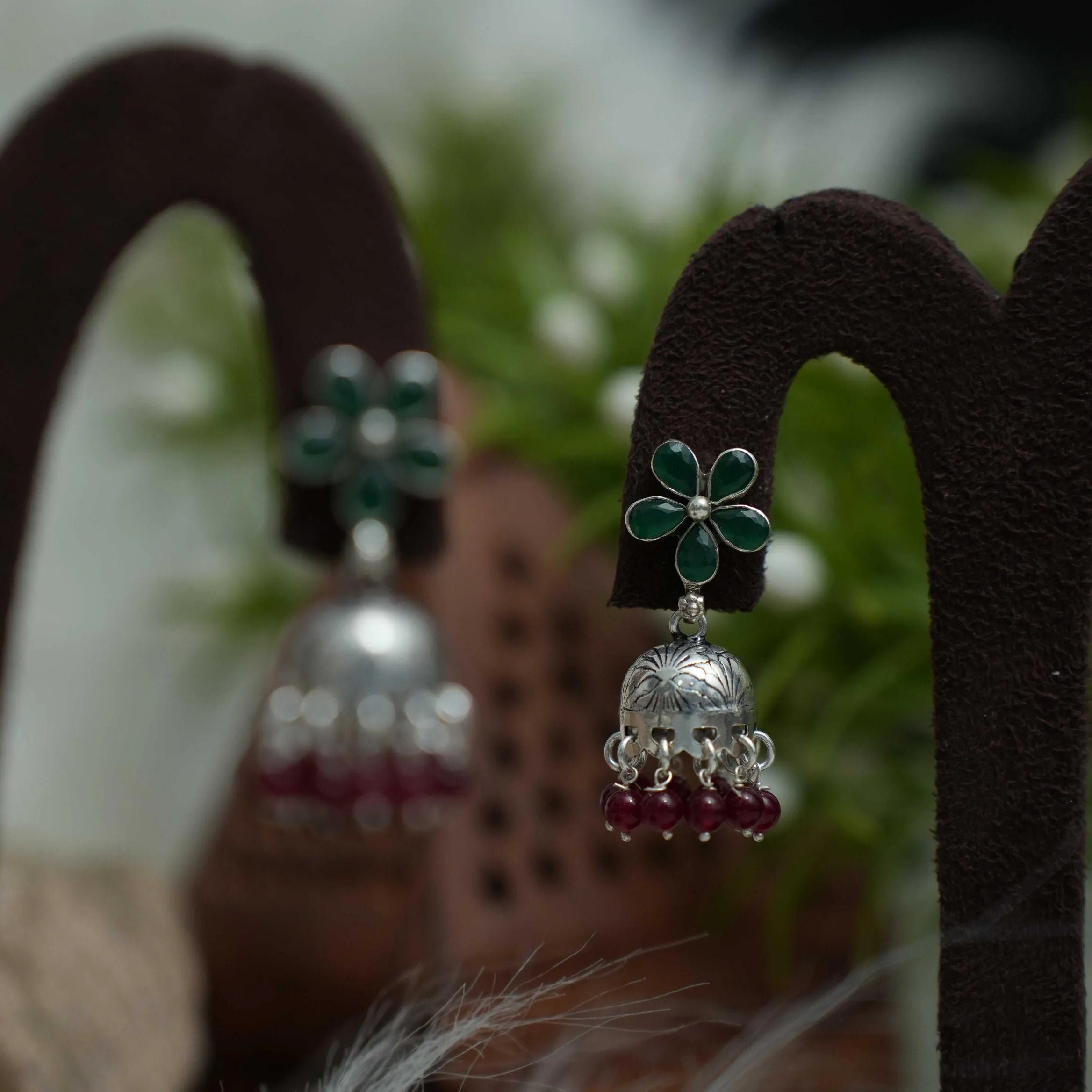 A classic silver jhumka earrings adorn with green stones and red beads.