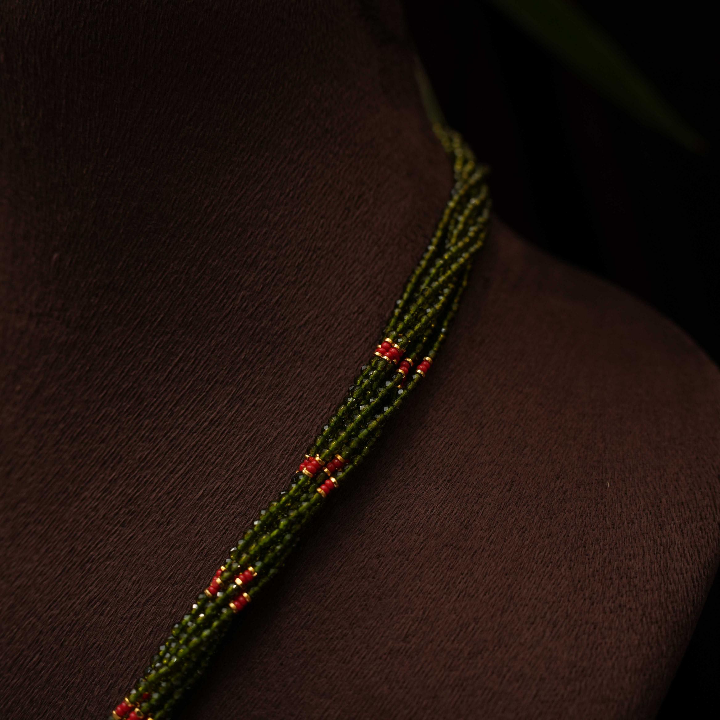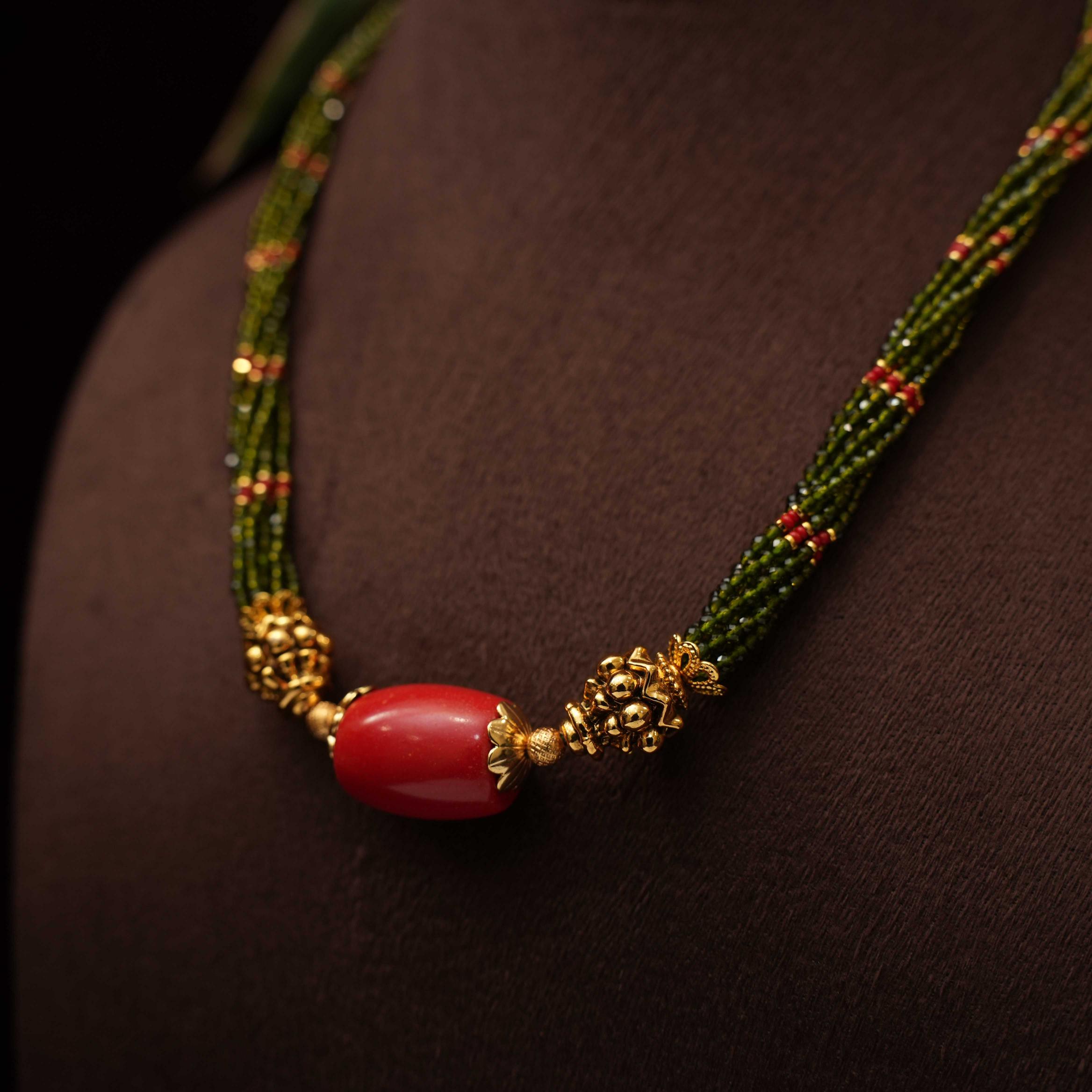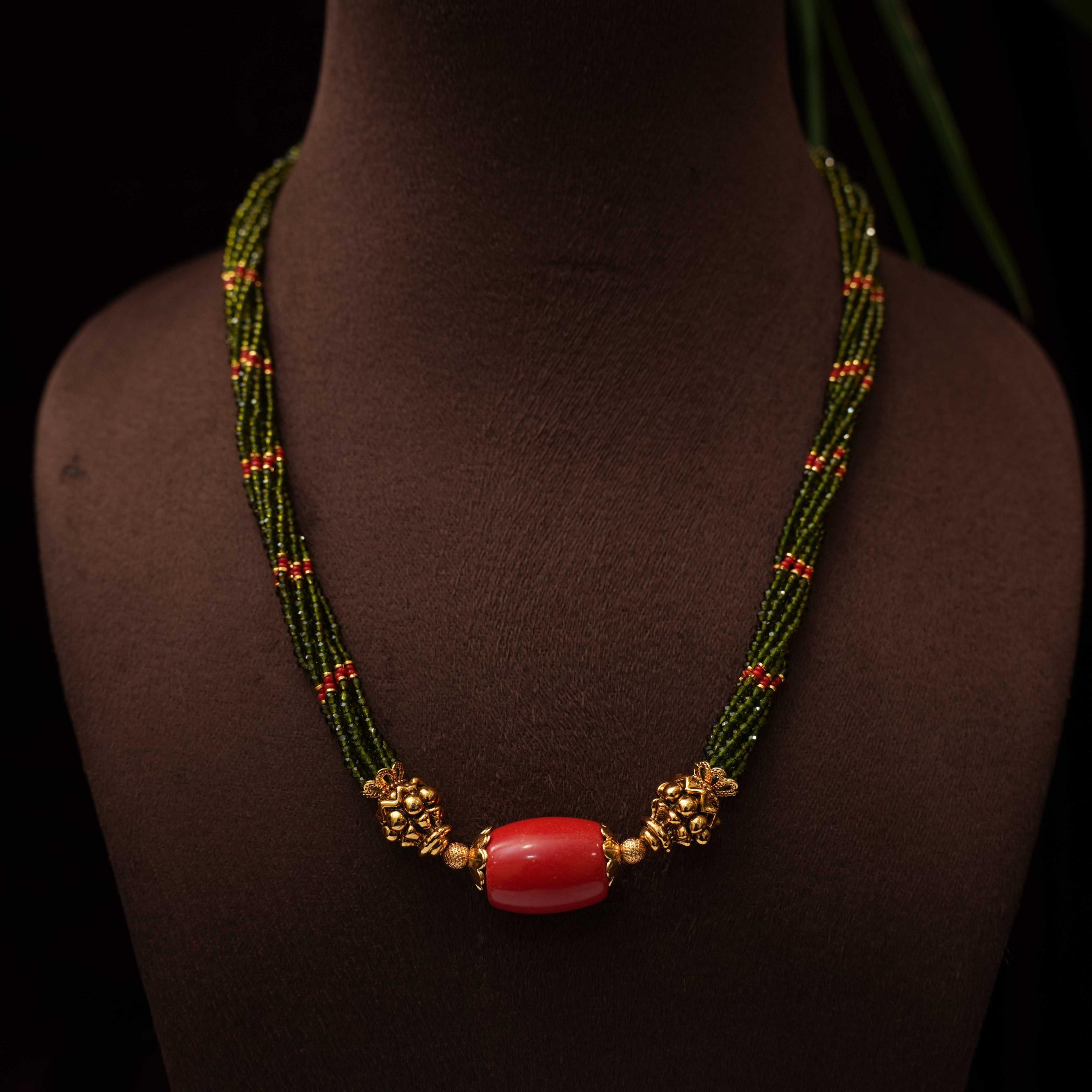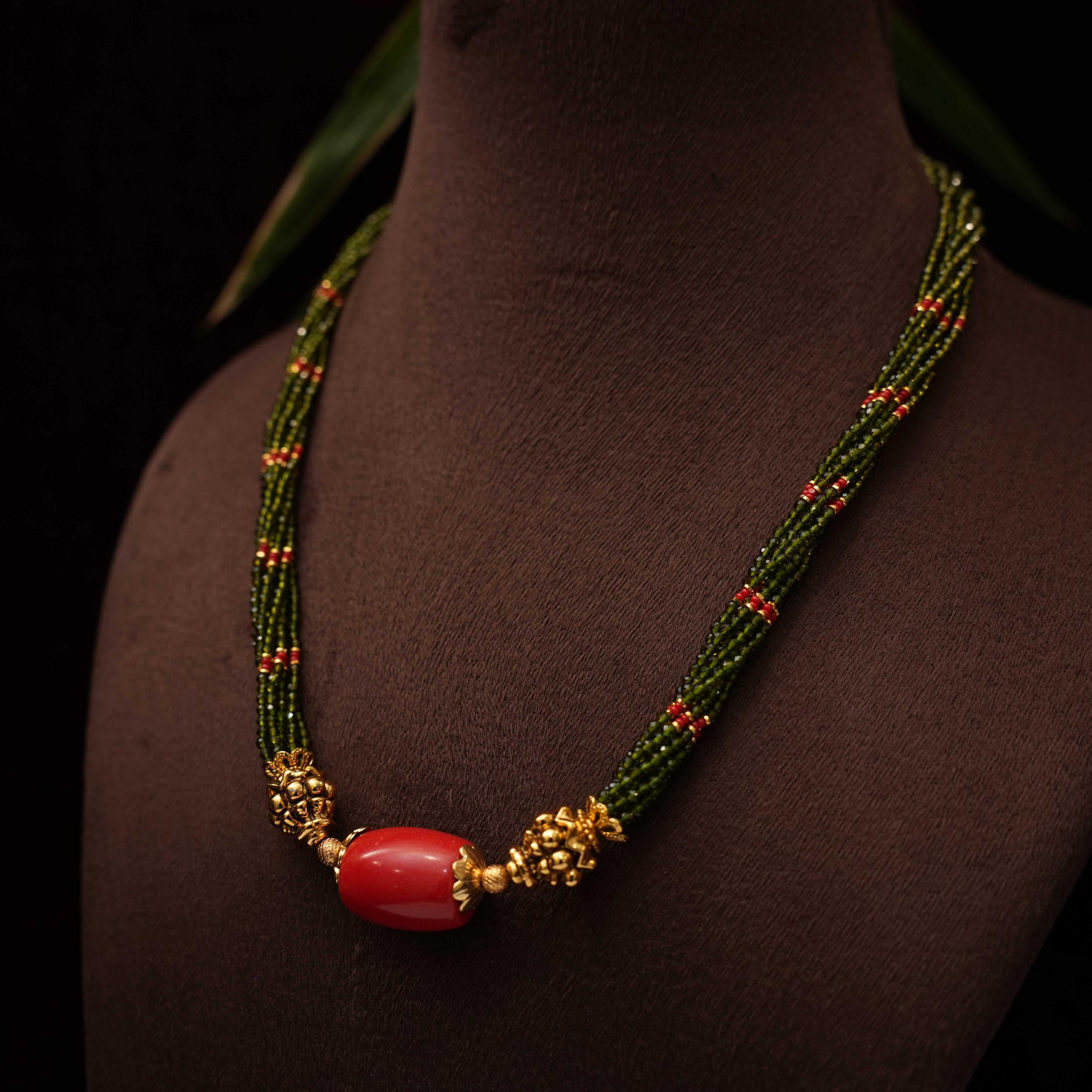 A classic beaded necklace in olive green beads paired to coral and antique balls.