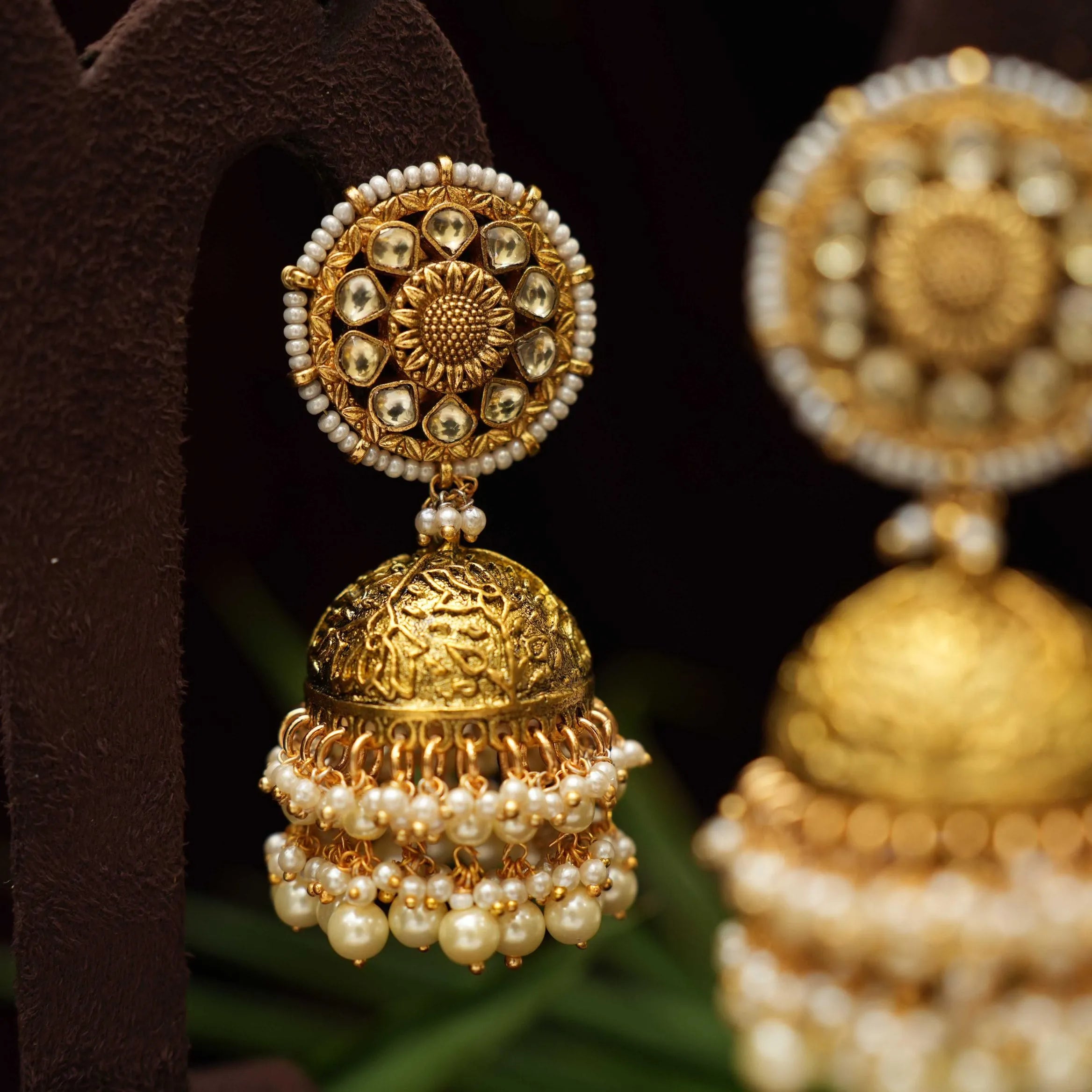 An elegant jhumka earrings in round motif studded with polki stones & pearls.