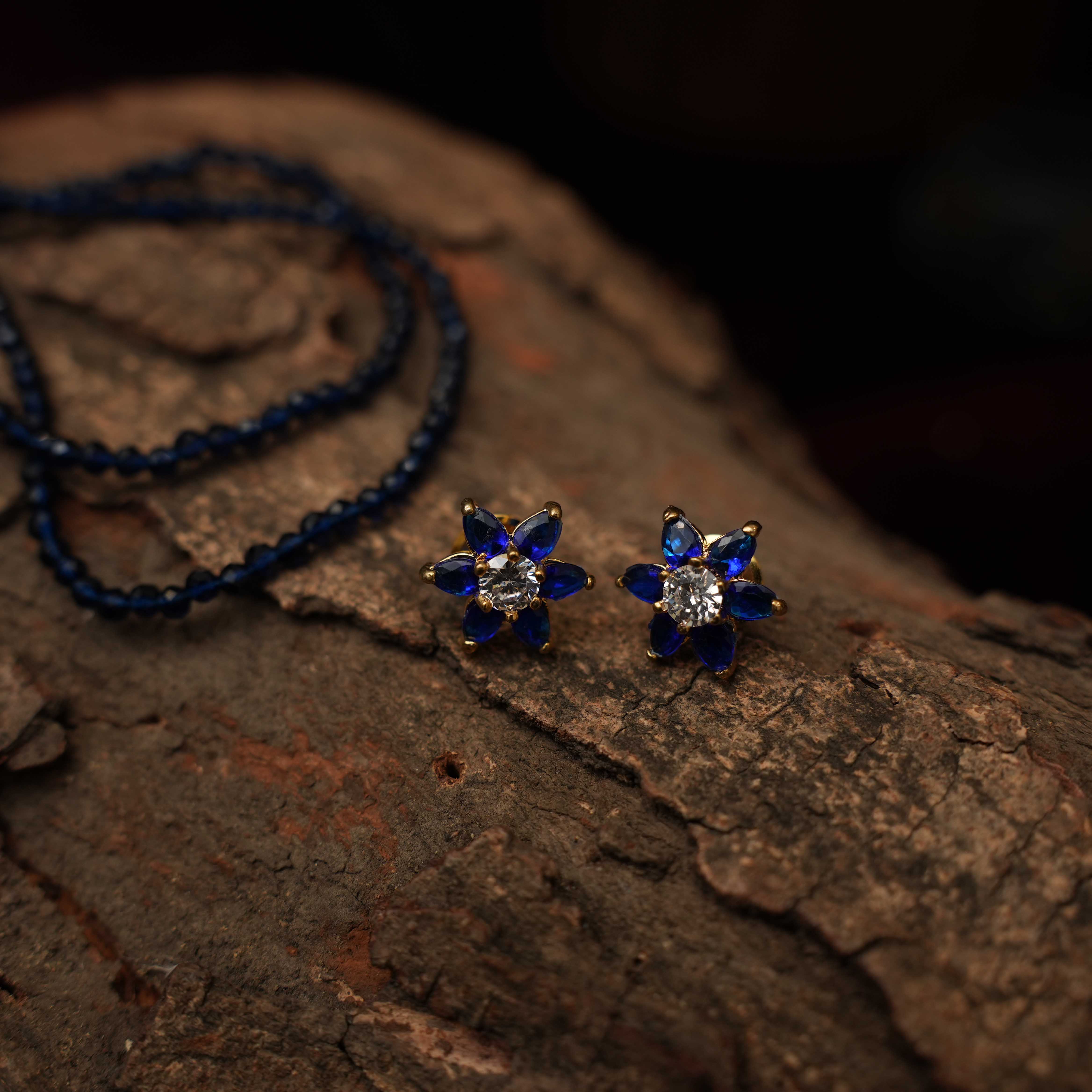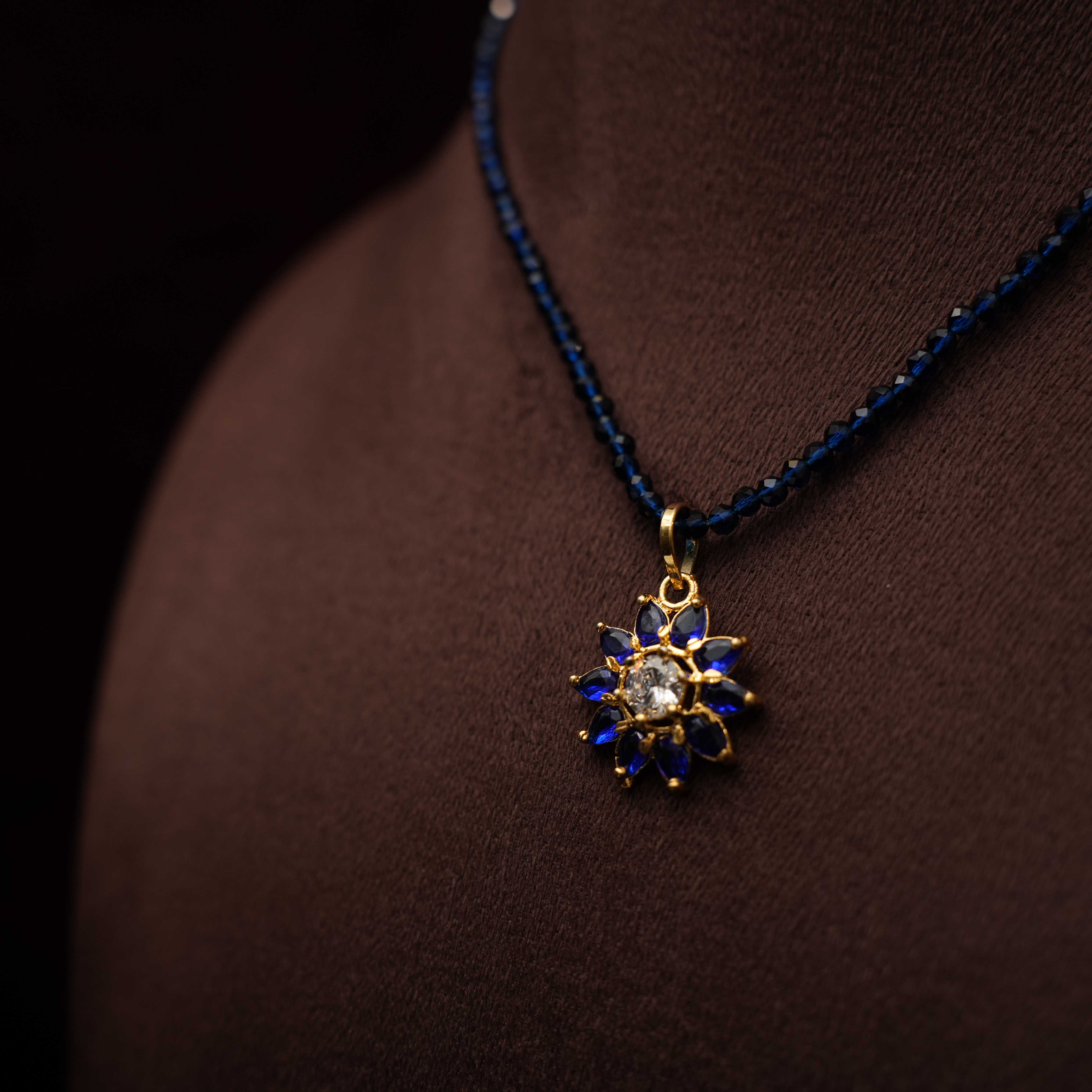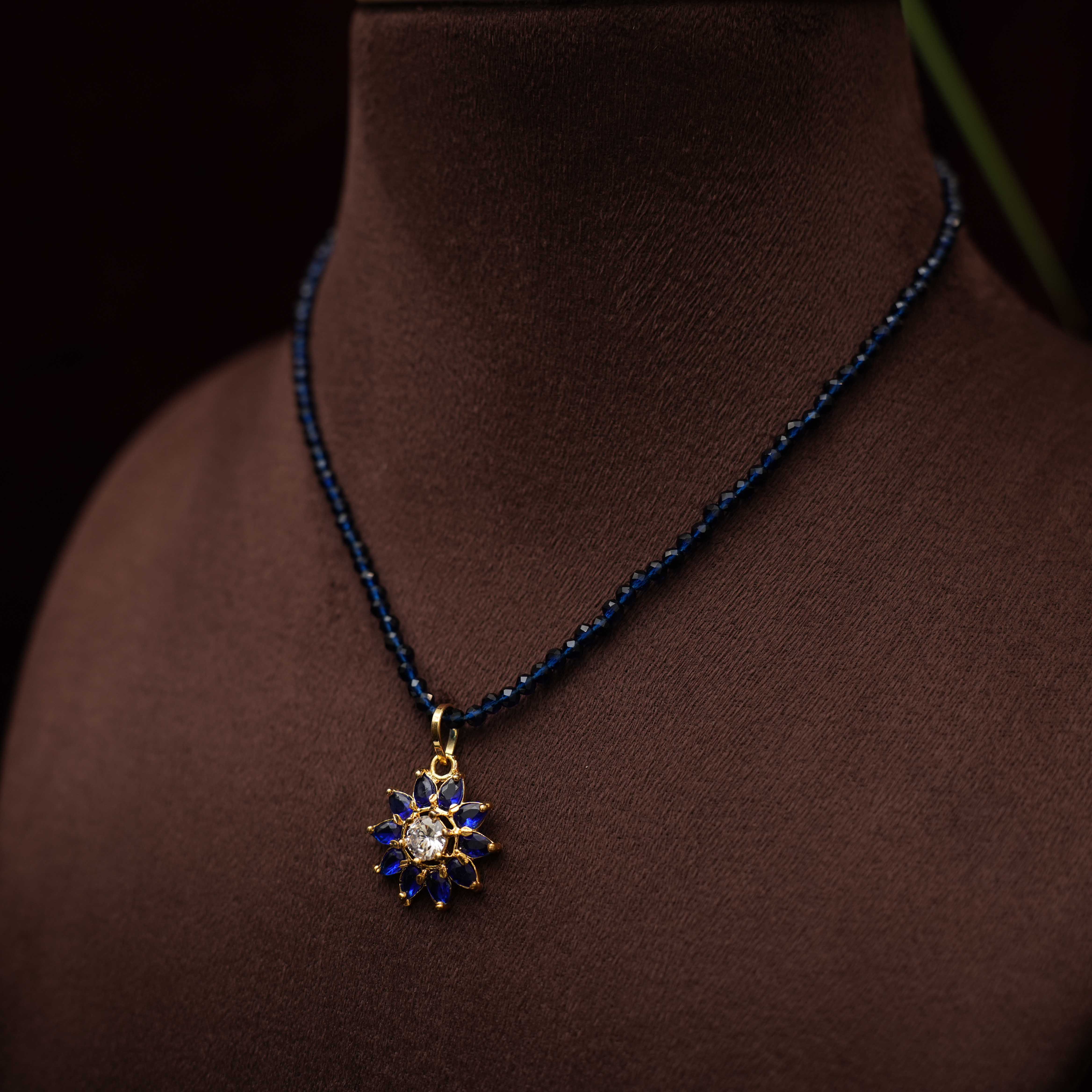 A classic blue beaded necklace paired to matching pendant and pair of earrings