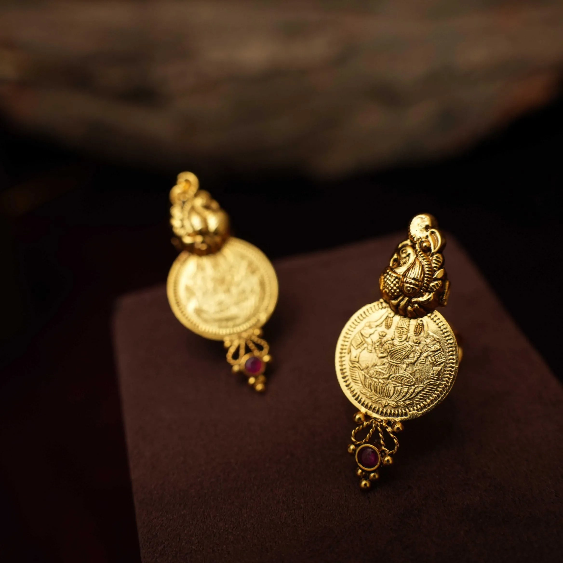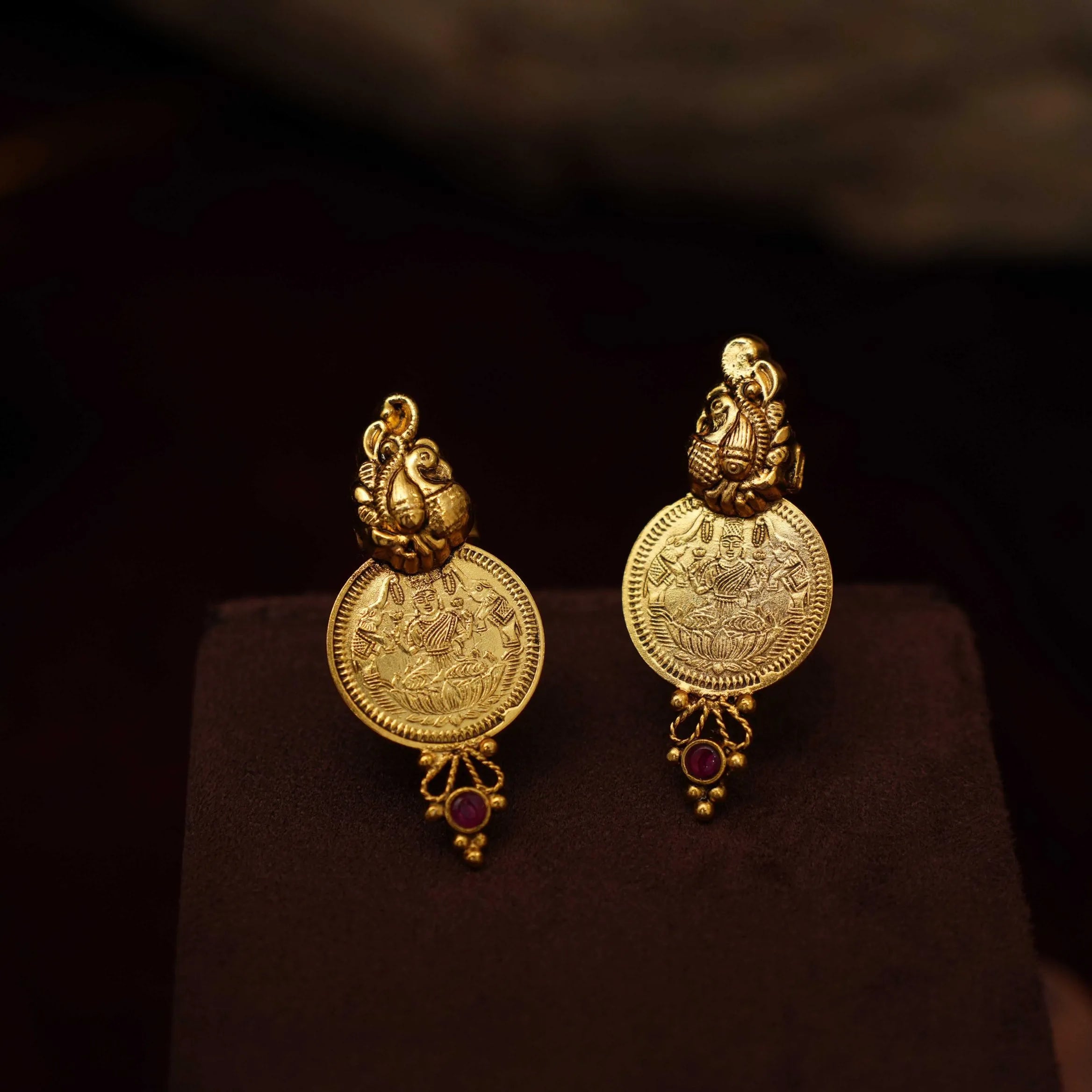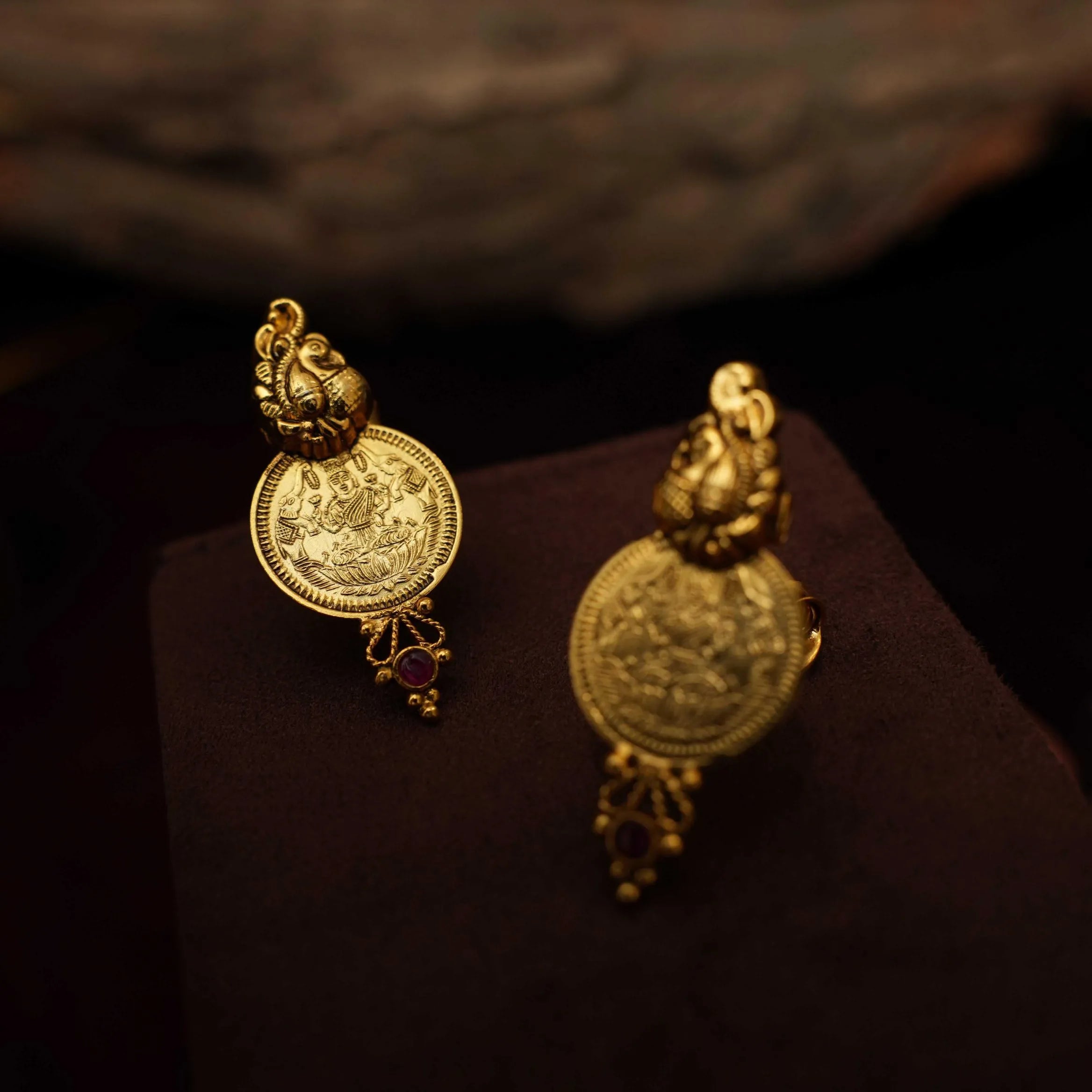 A traditional silver coin earrings in Goddess Lakshmi and peacock motif studded with kemp stone.