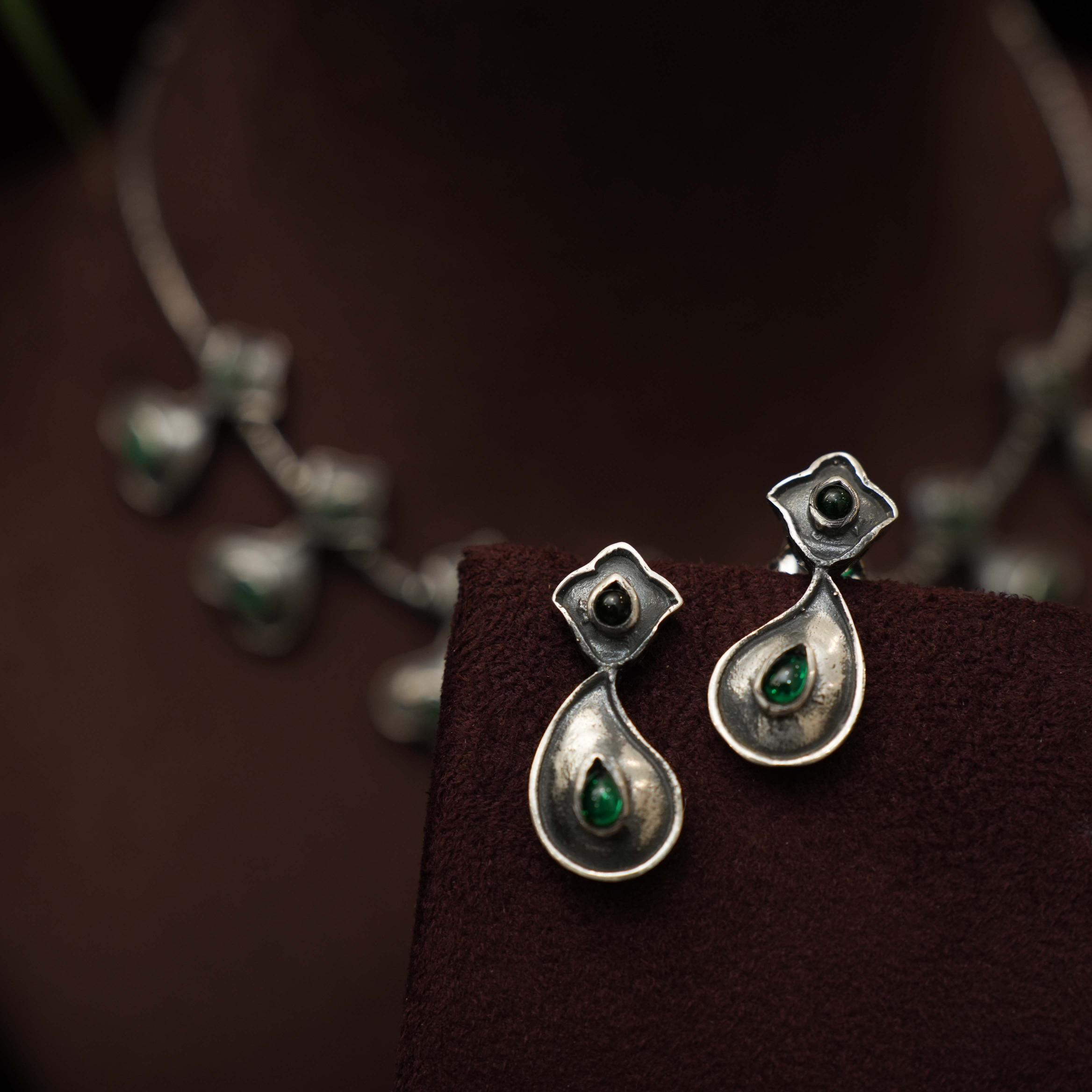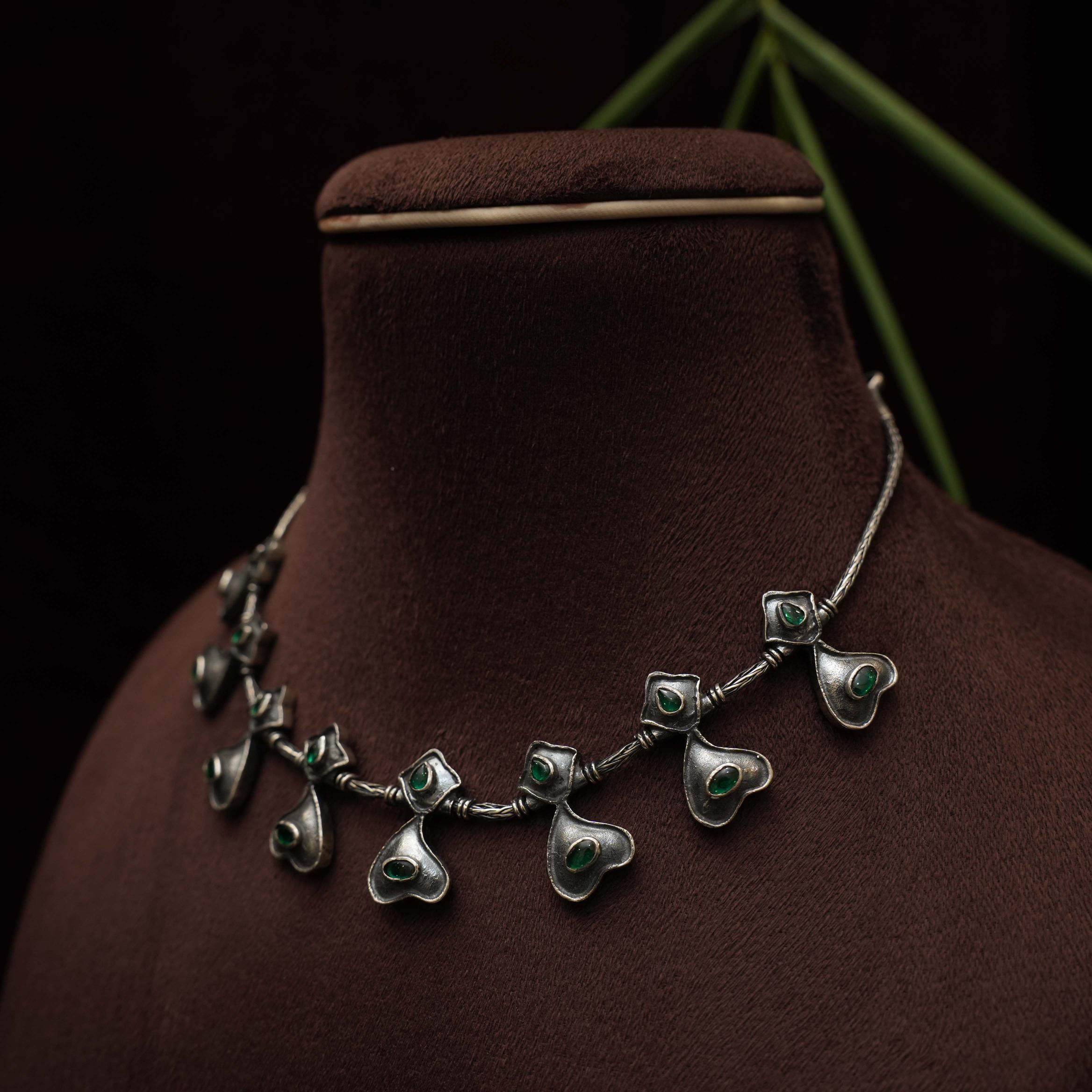 A contemporary silver necklace handcrafted in tribal design. This set comes with a pair of earrings.