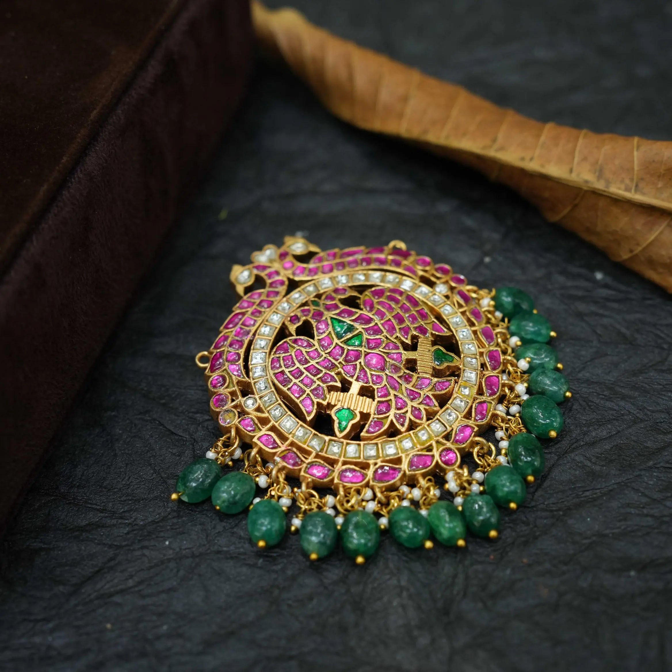 A statement and stunning pendant handcrafted in iruthalai pakshi motif studded with polki stones adorn with beads and pearls.