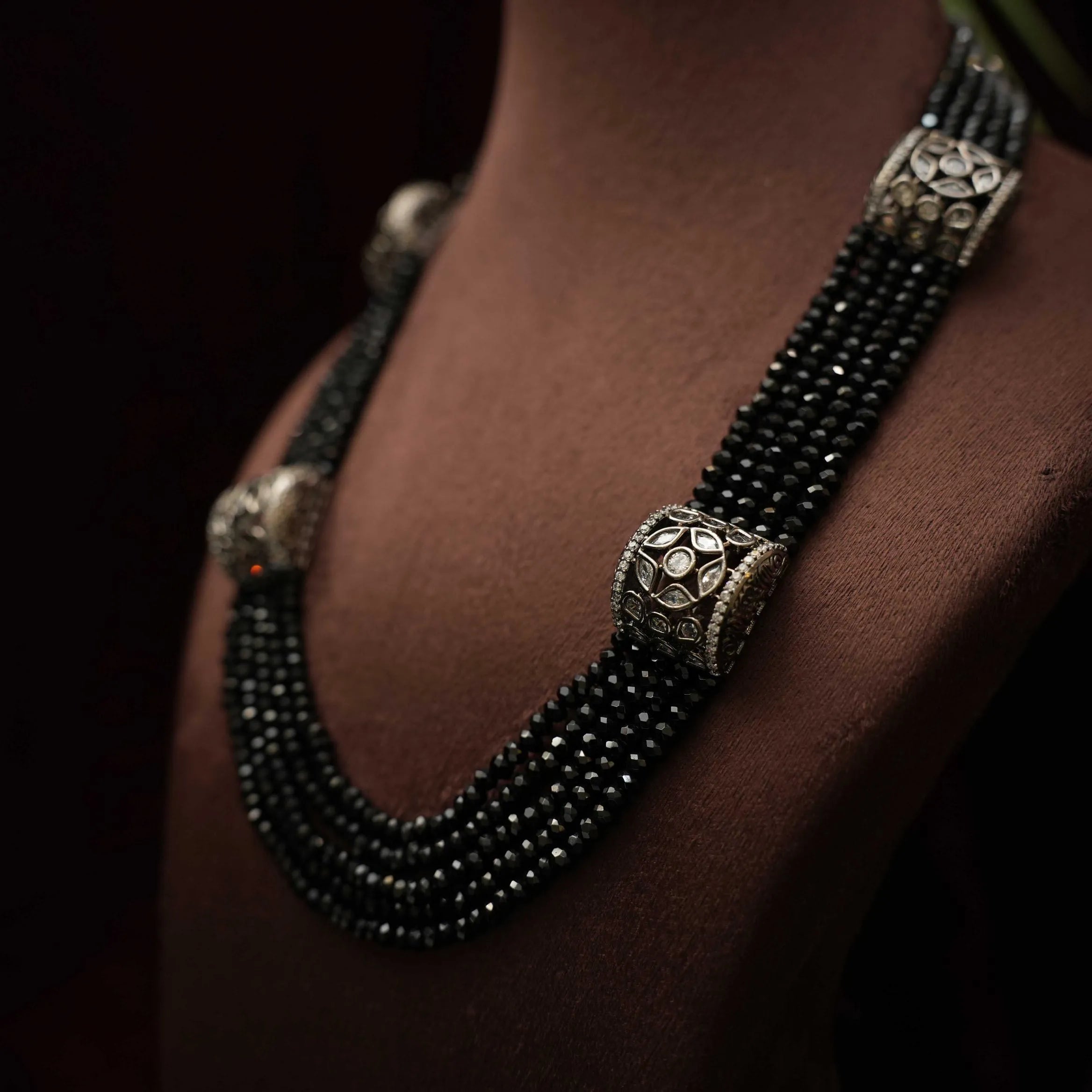 An elegant layered necklace handcrafted in black beads adorn with oxidized pendant. This set comes with a pair of earrings.