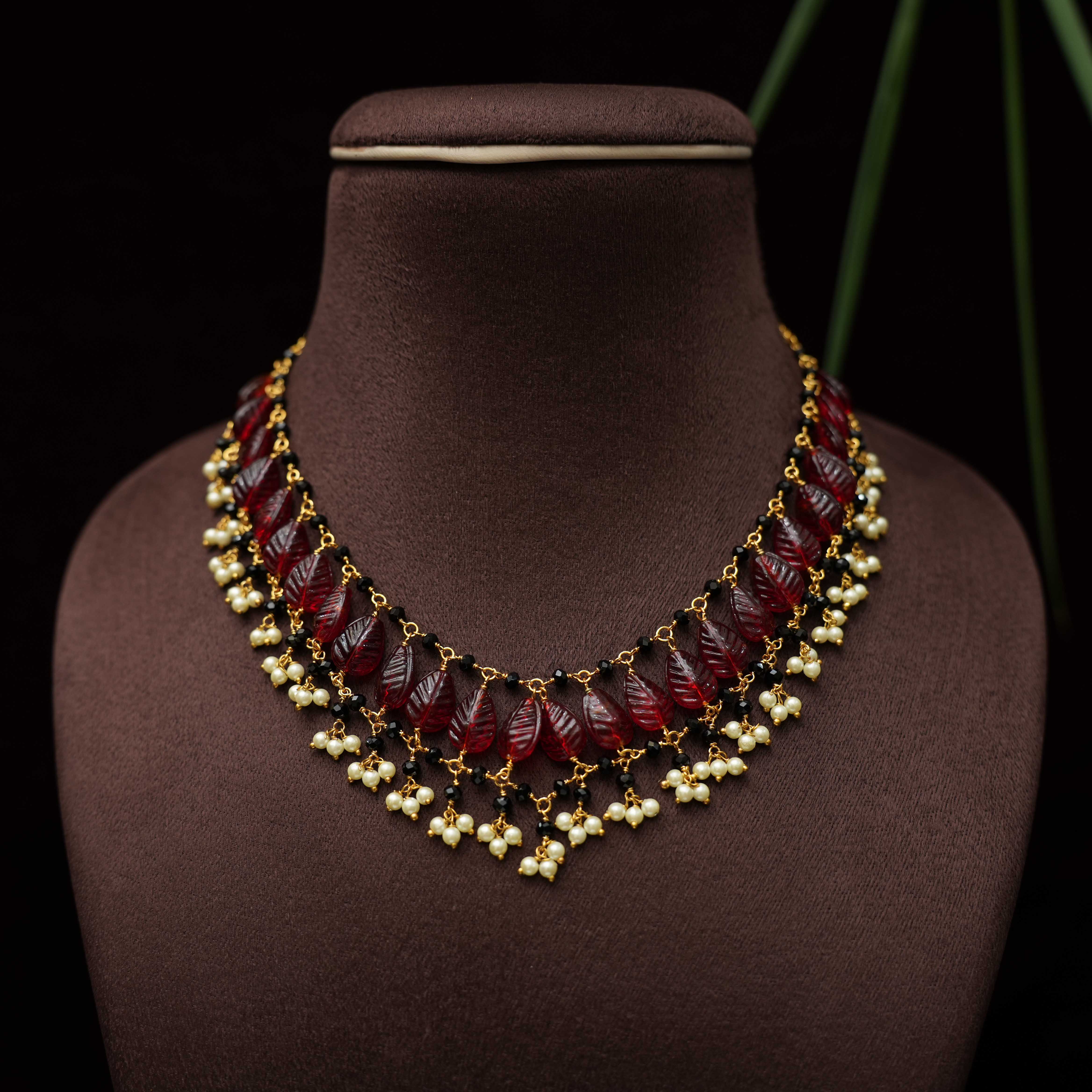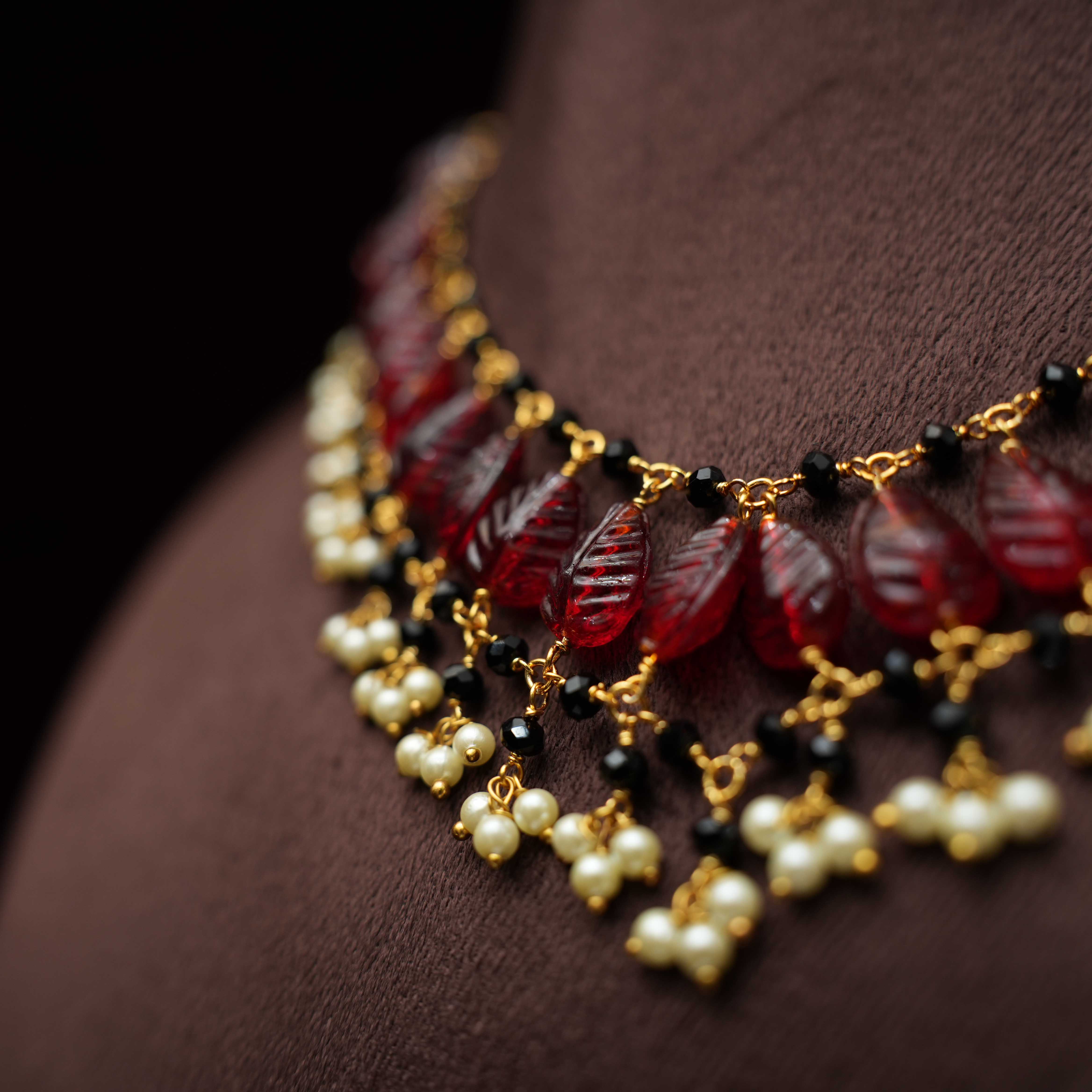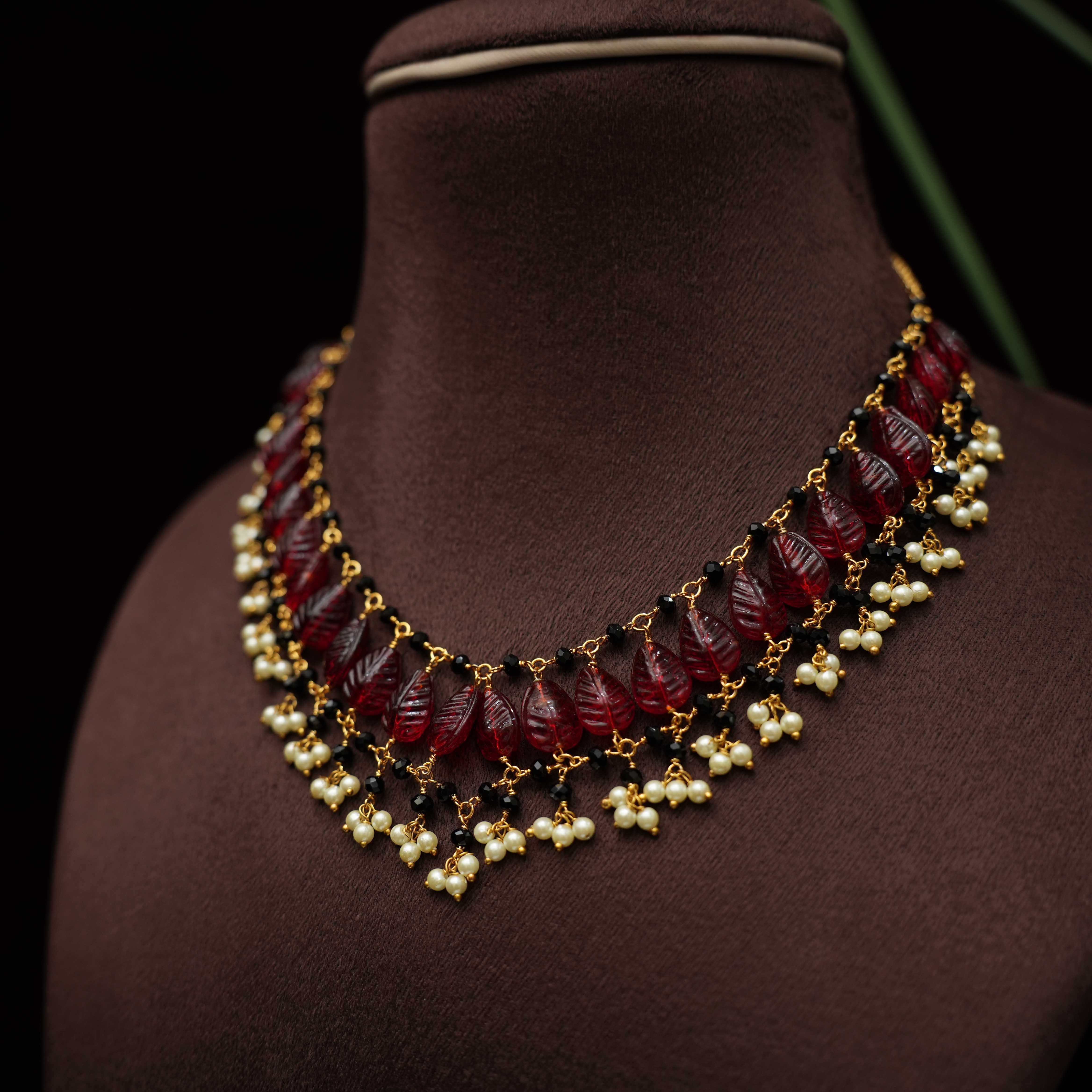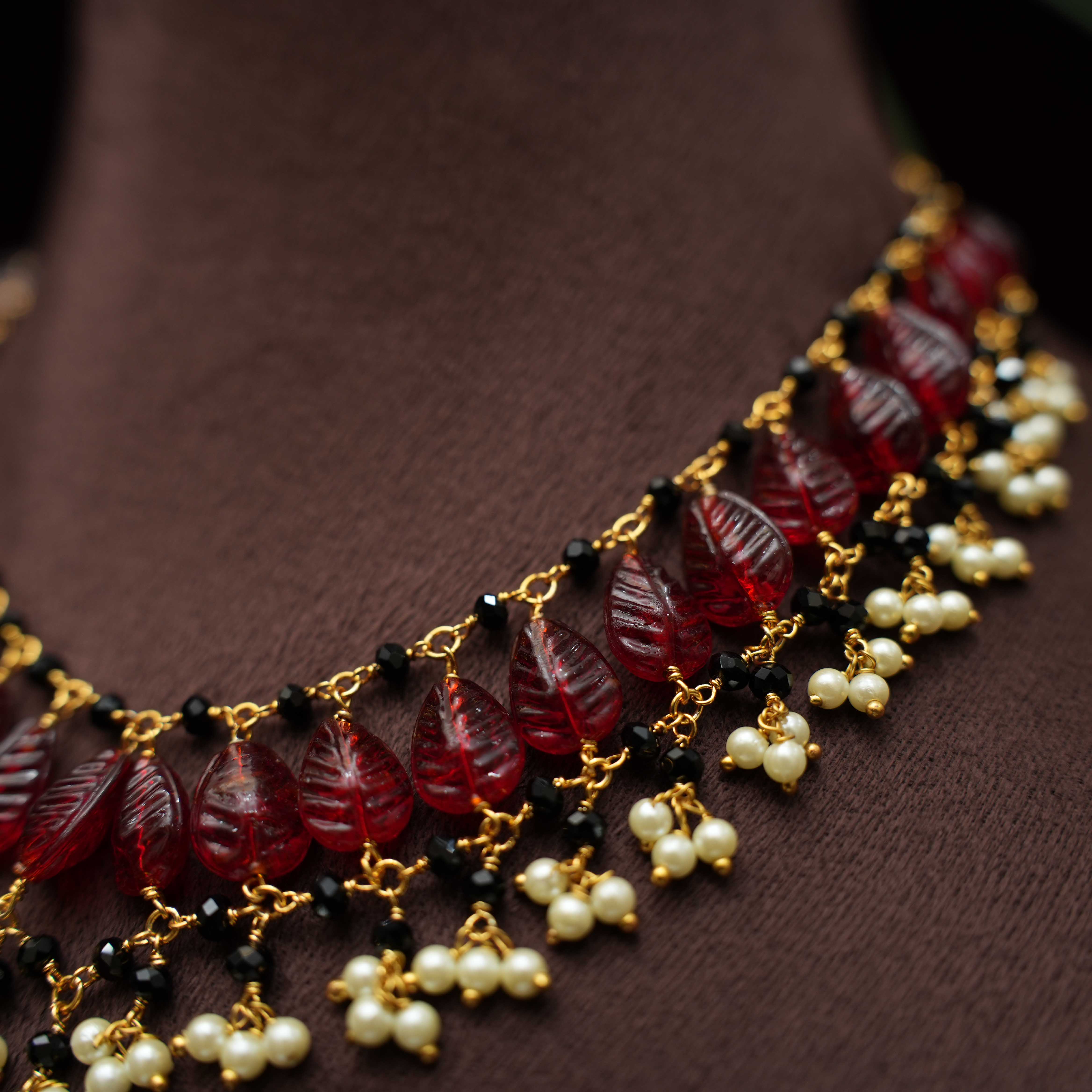 A beautiful red carved leaf shaped beads, black beads and tiny pearls choker that completes your look