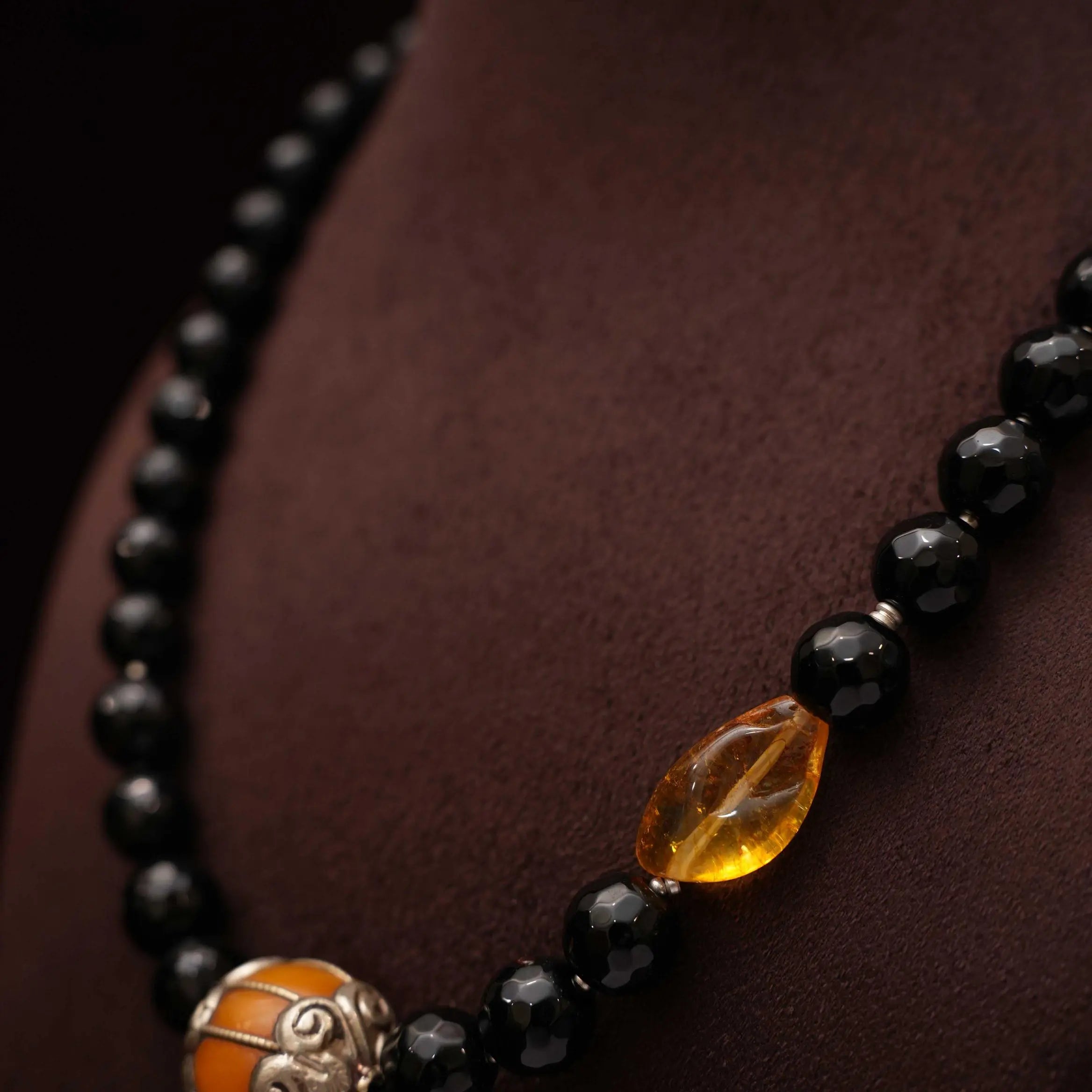 An elegant necklace handcrafted in black beads paired to designer pendant and orange baroque beads.