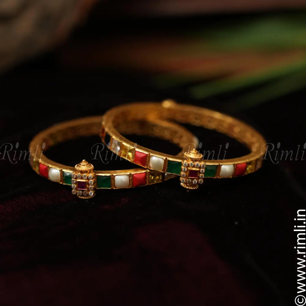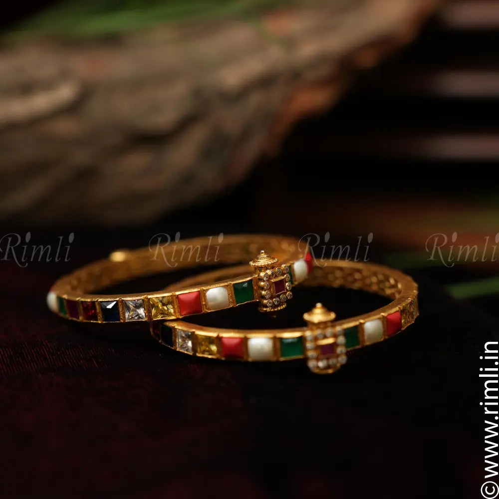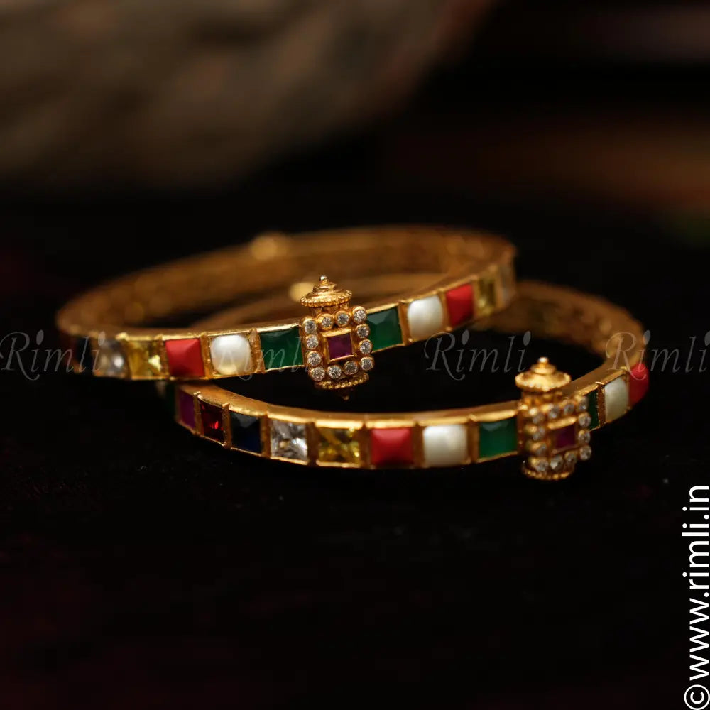 Indulge in timeless elegance with our 92.5 silver screw-type gold-plated pair of bangles. This exquisite piece is adorned with vibrant navratna stones, adding a touch of glamour and tradition to your ensemble. Elevate your style effortlessly.