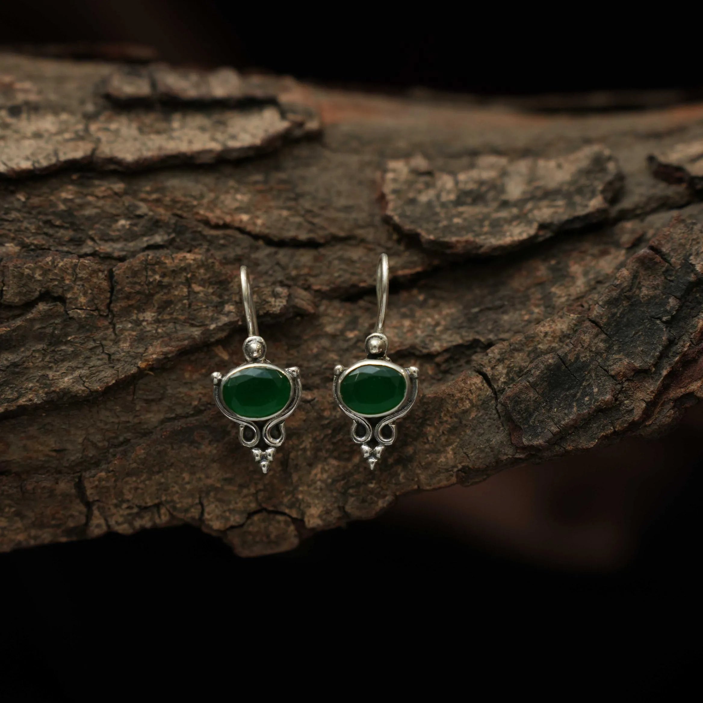 A simple silver oxidised hoop earrings studded with green stones.