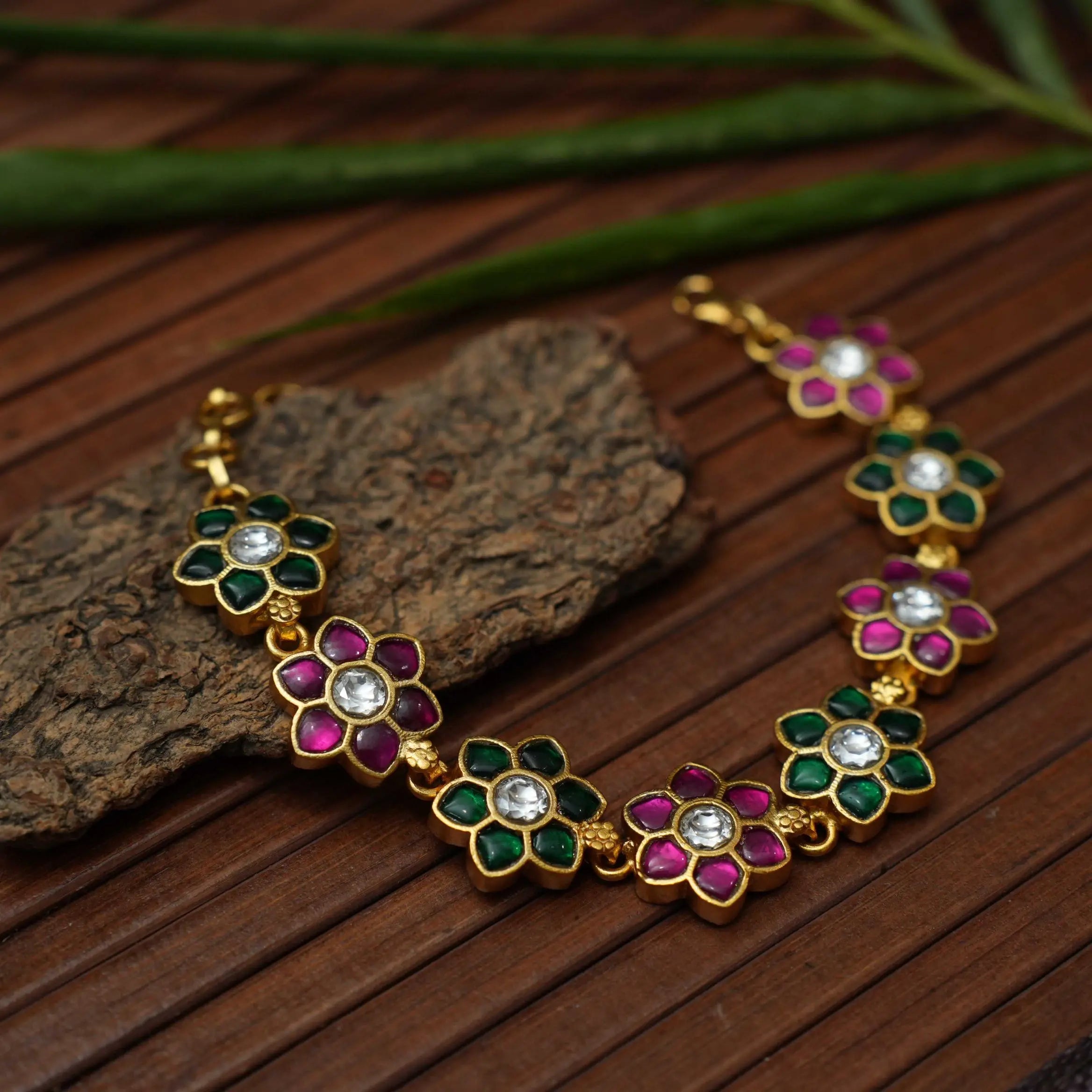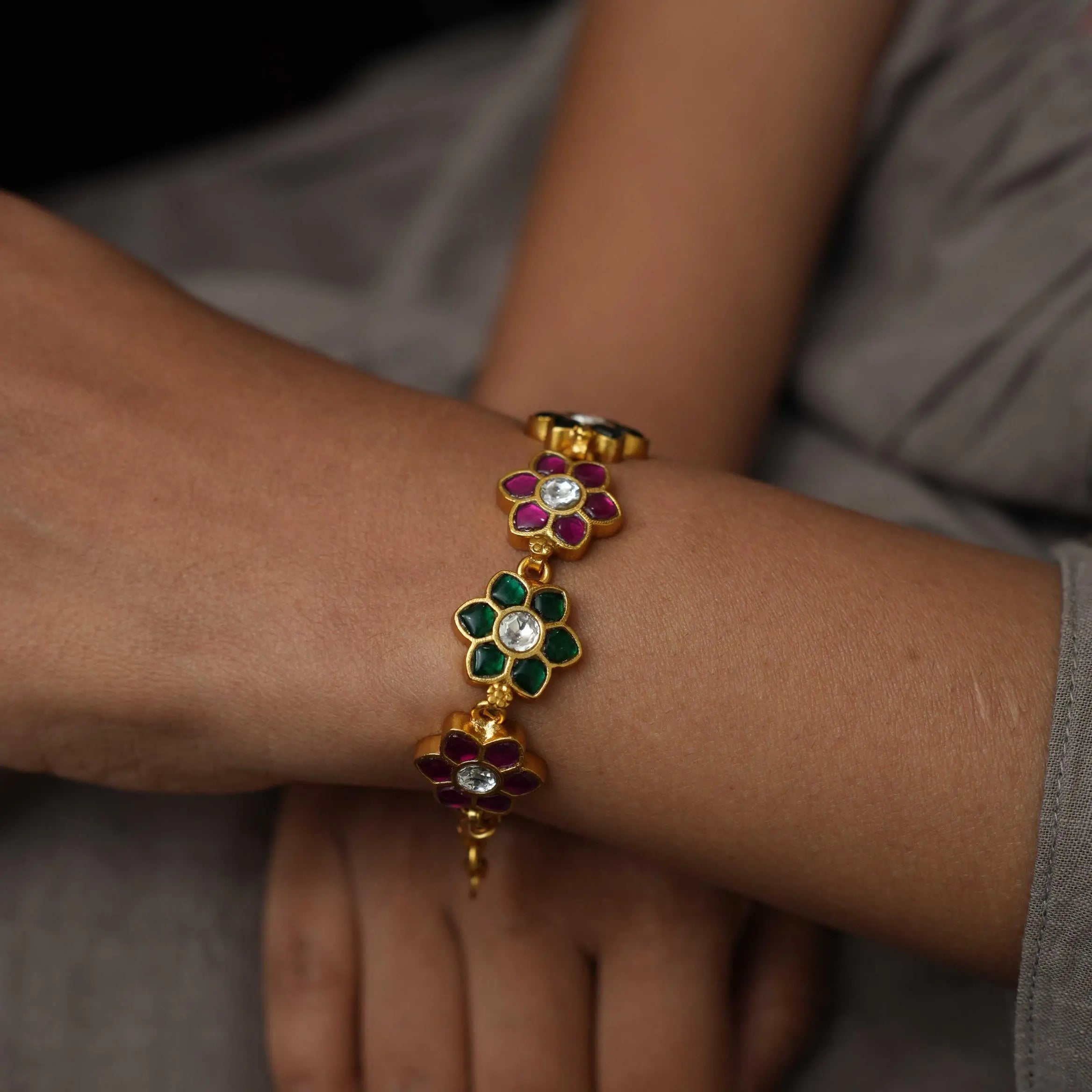 A stunning silver bracelet handcrafted in floral motif studded with multicolor stones.