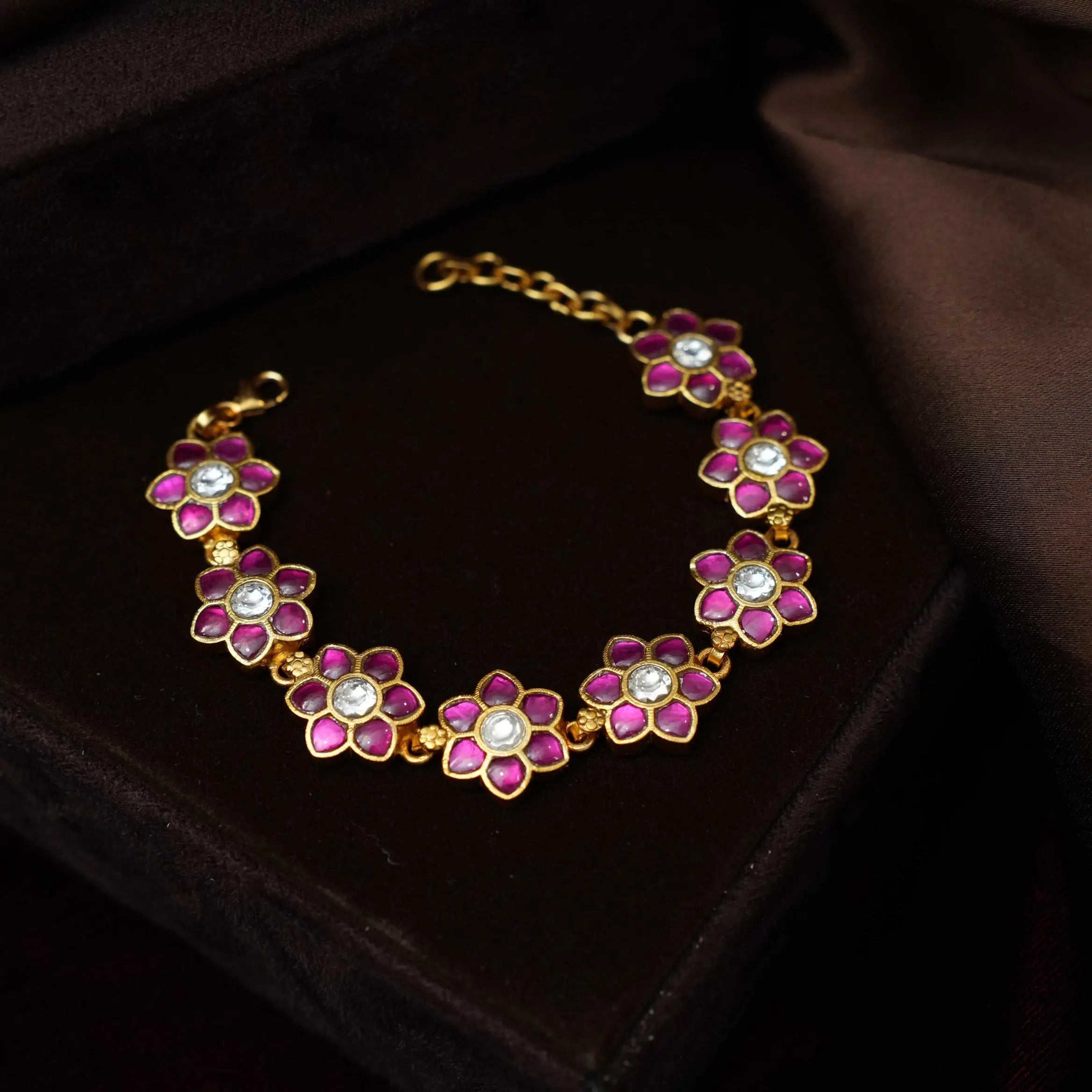 A stunning silver bracelet handcrafted in floral motif studded with vibrant red stones.