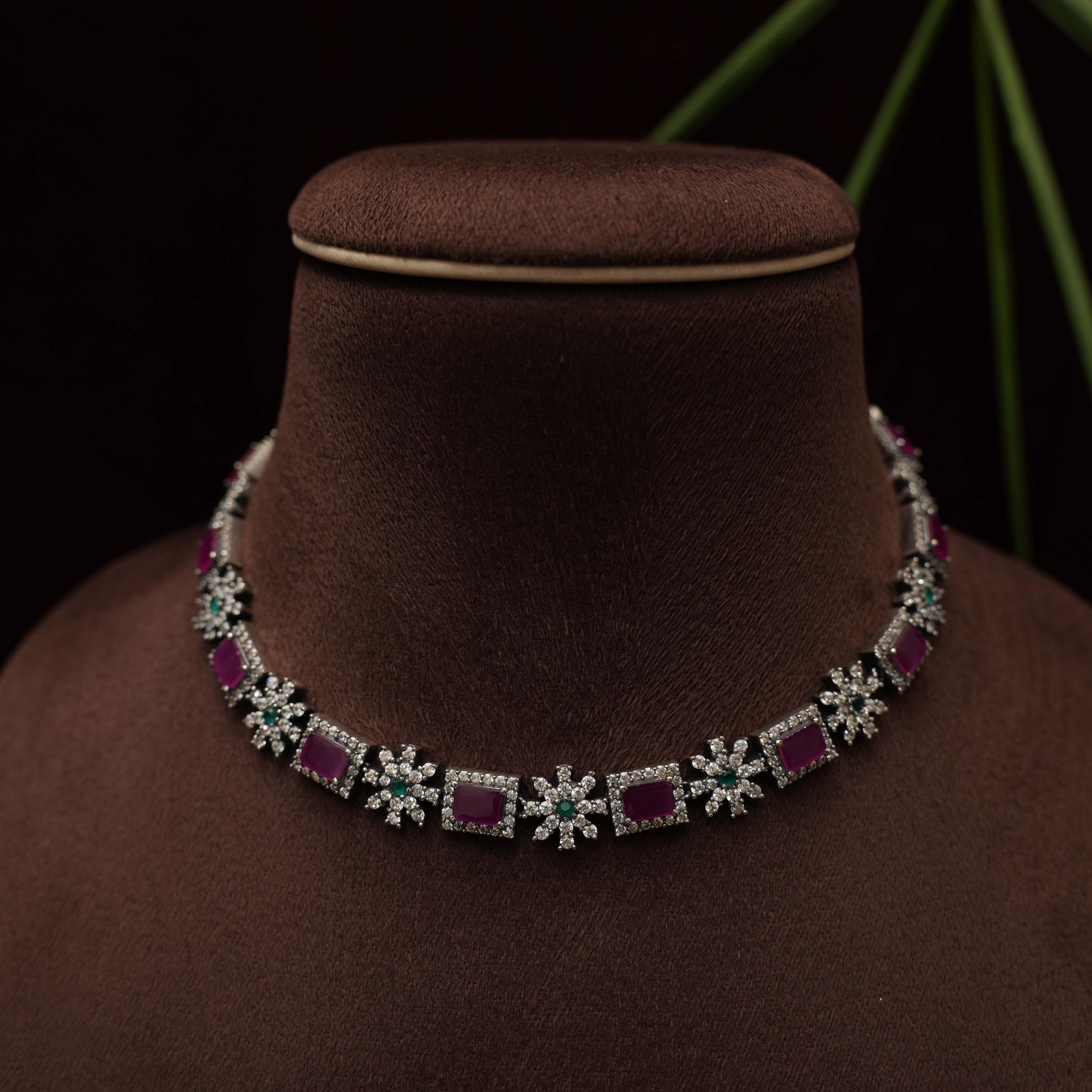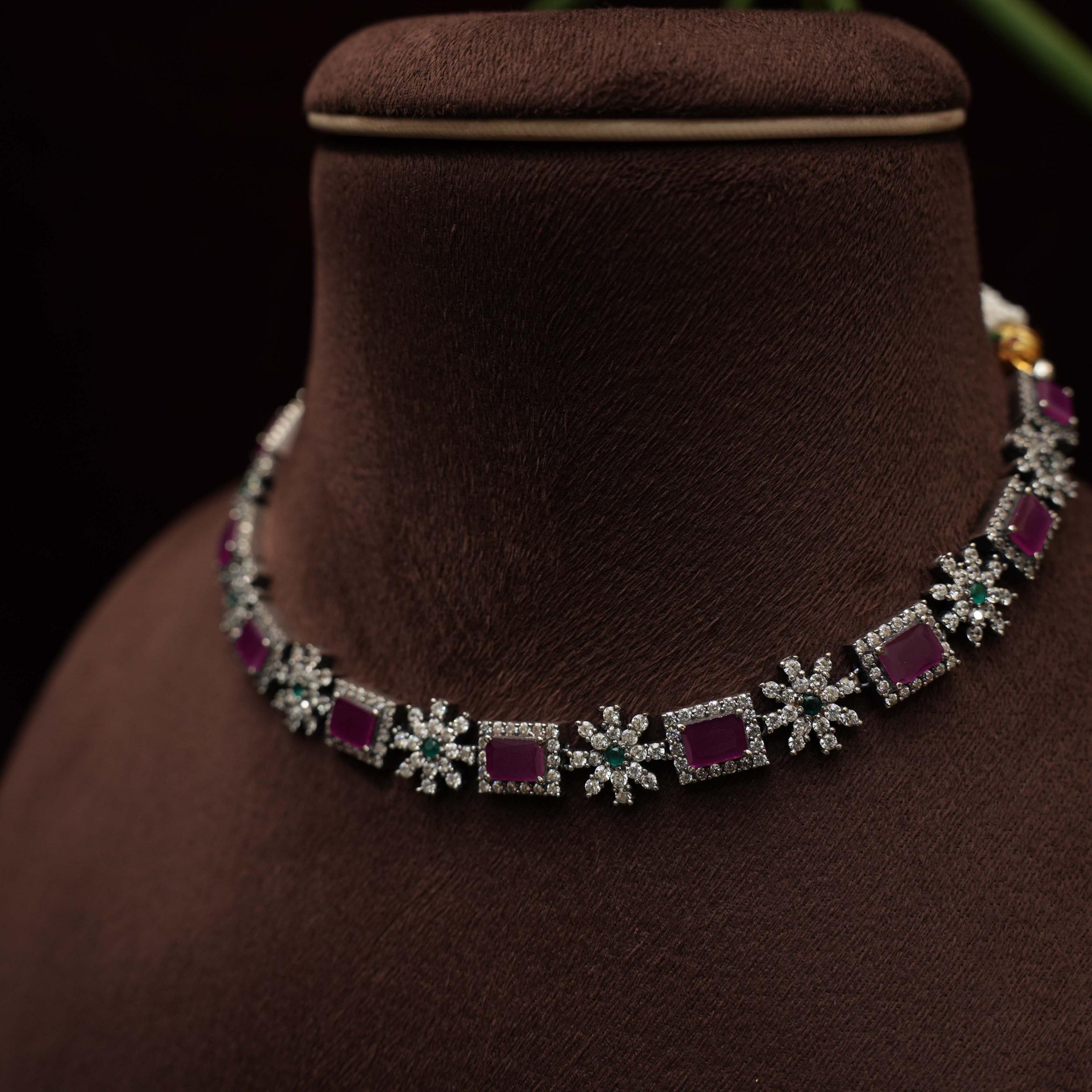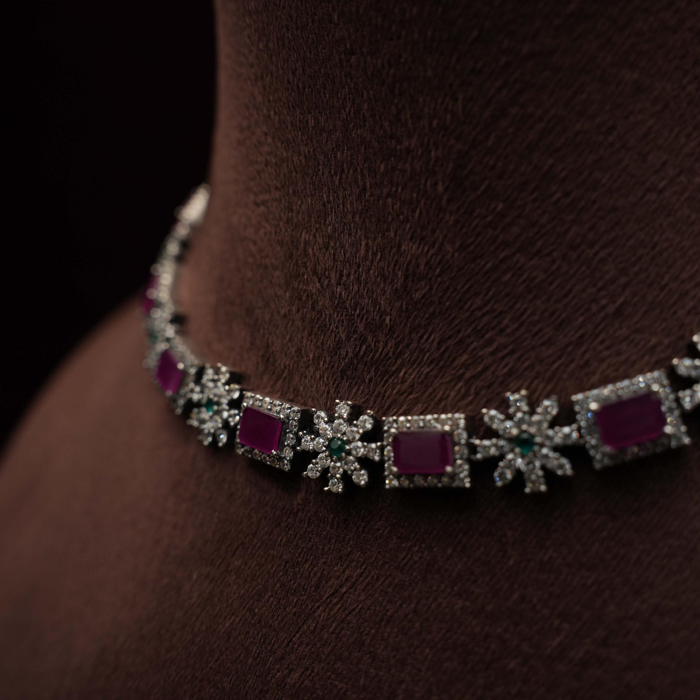 A simple & elegant silver oxidized necklace in floral motif studded with red & white stones.