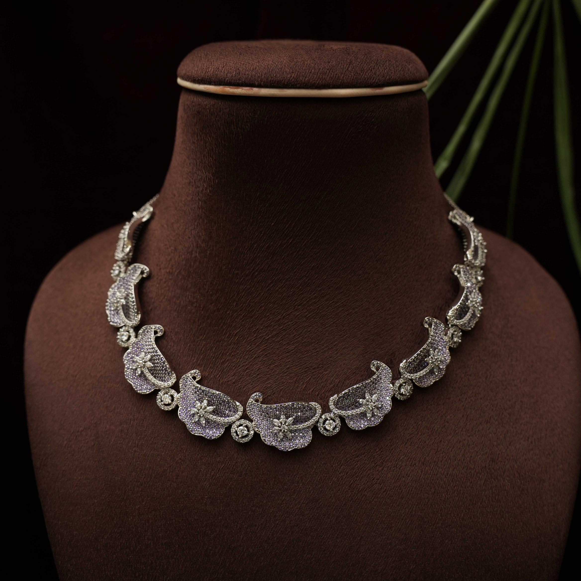 A designer necklace in leaf motif handcrafted with fine zircon stones. This set comes with a pair of earrings.