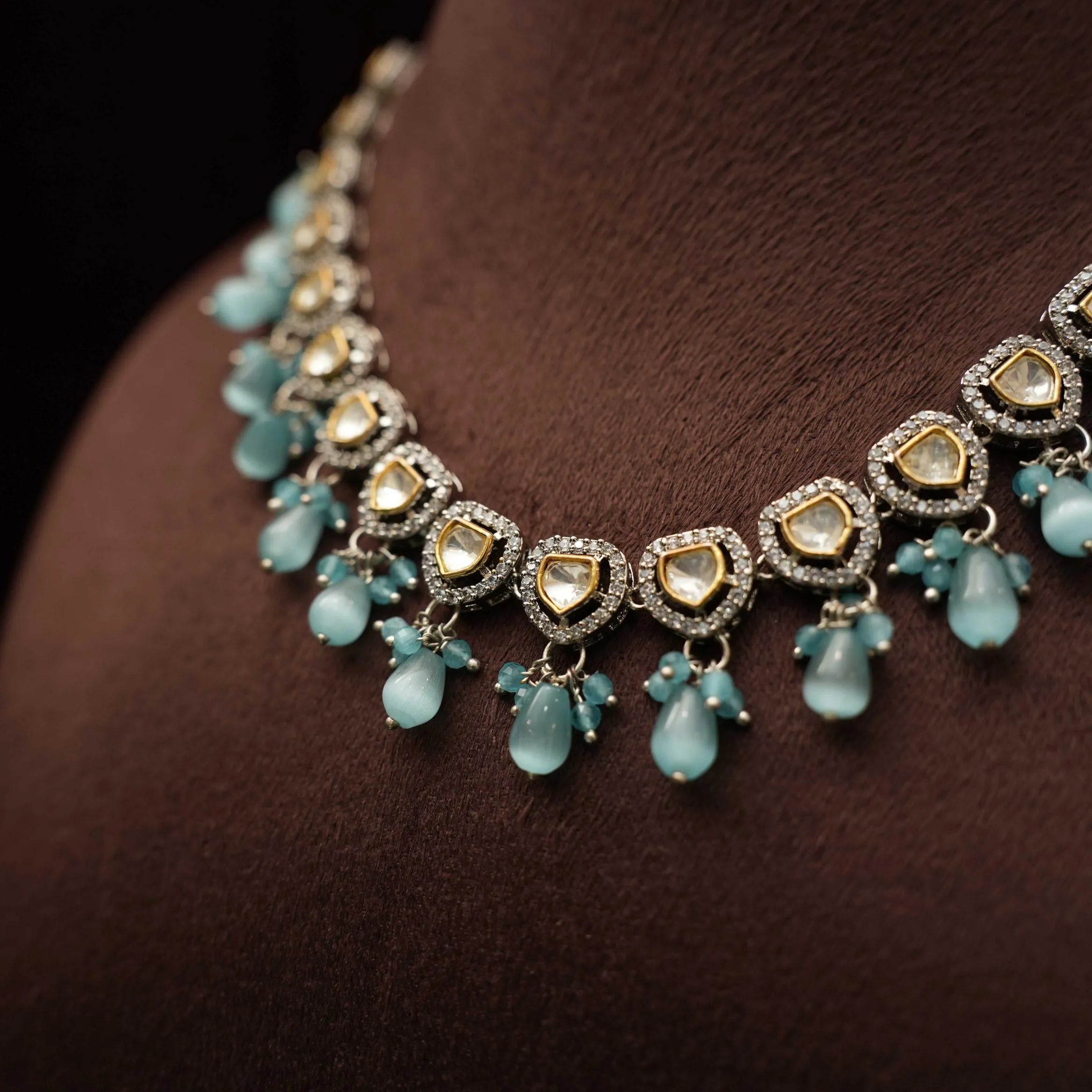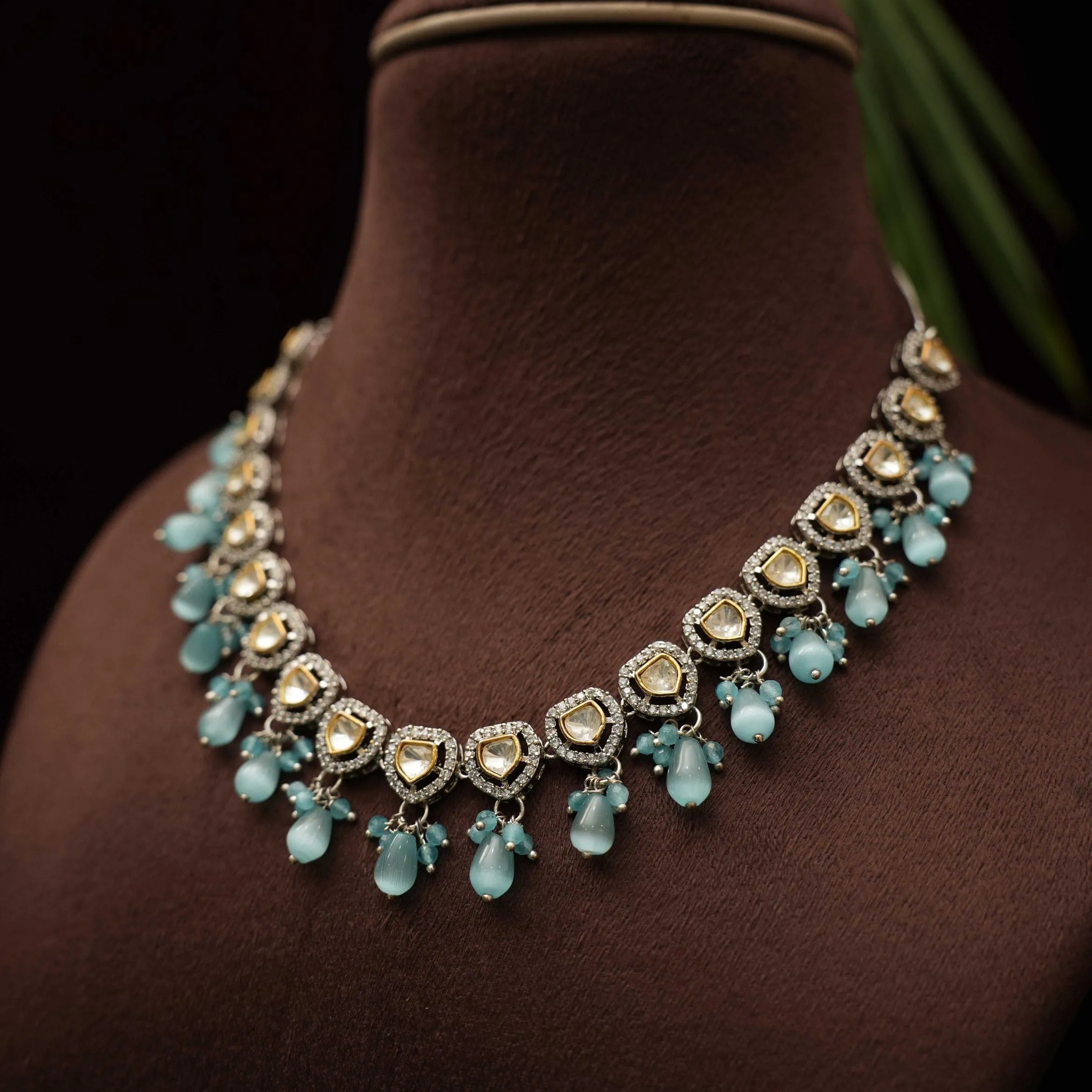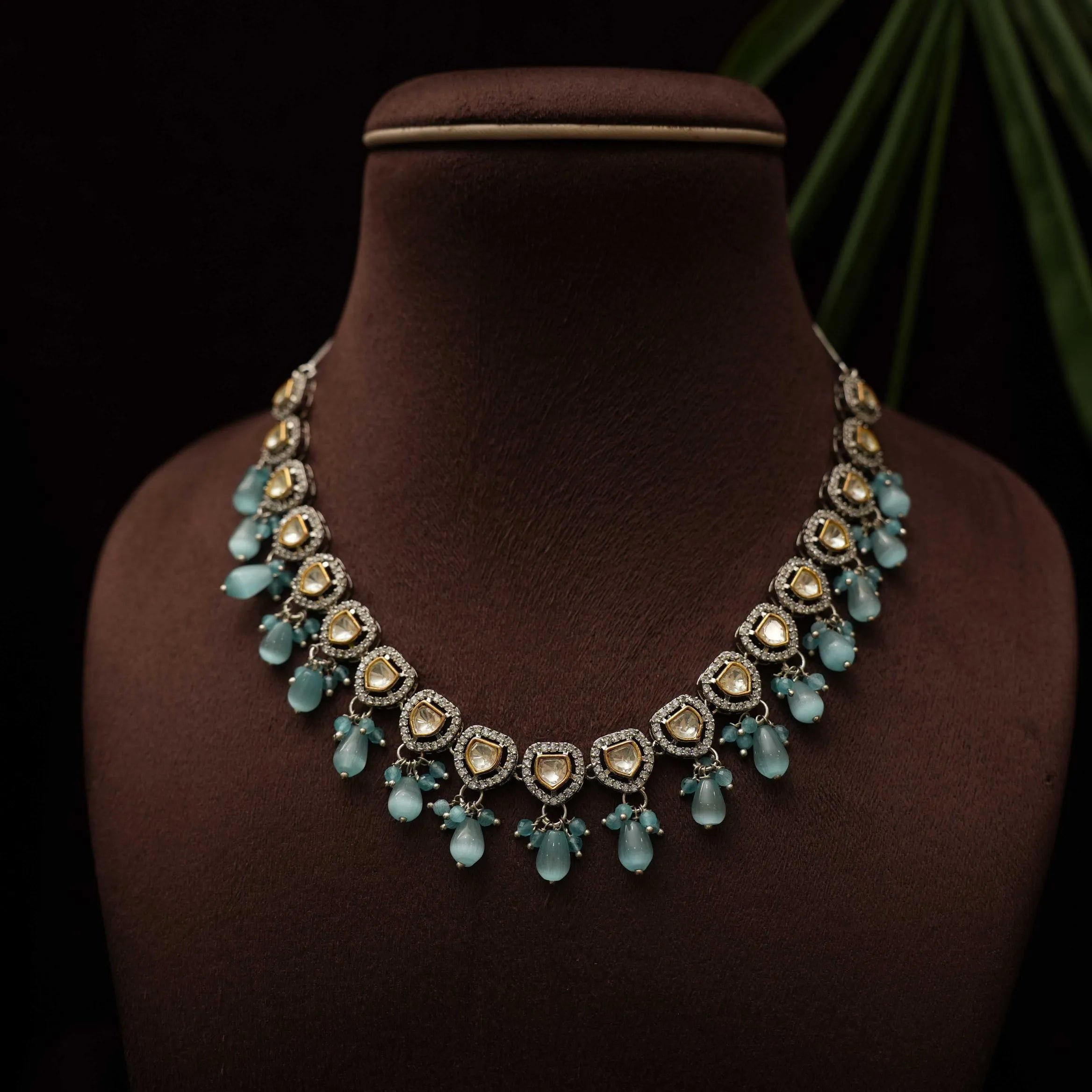 A beautiful necklace handcrafted in Victorian Kundan stones adorn with pastel pink beads. This set comes with a pair of earrings.
