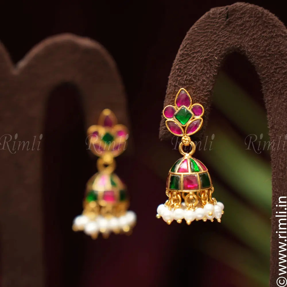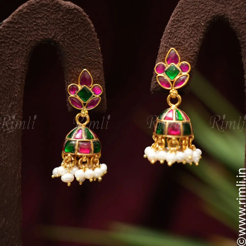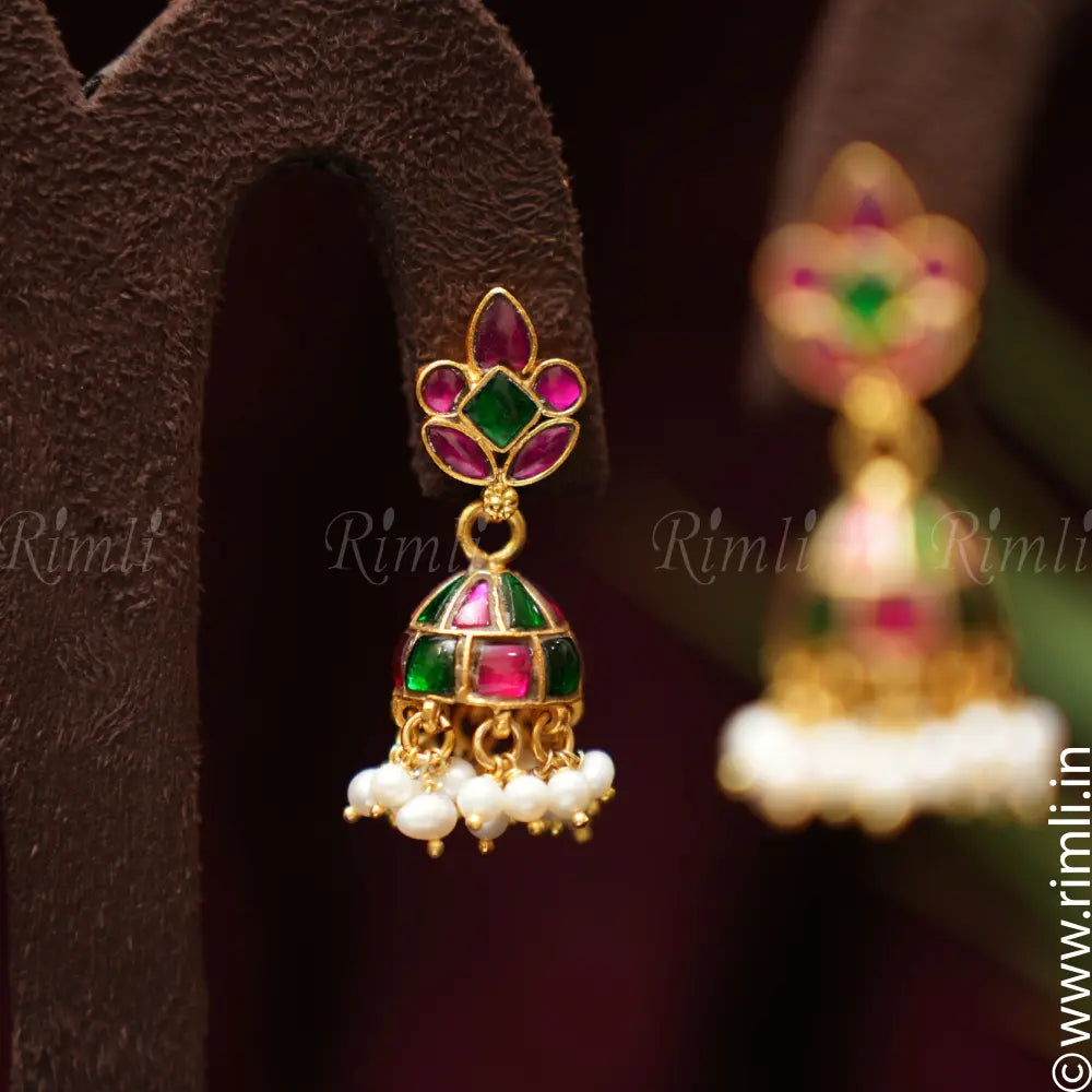 Embrace sophistication with our 925 gold-plated silver jhumka, featuring vibrant red and green stones accented by lustrous pearls. This meticulously crafted piece exudes timeless charm and adds a touch of glamour to your look.