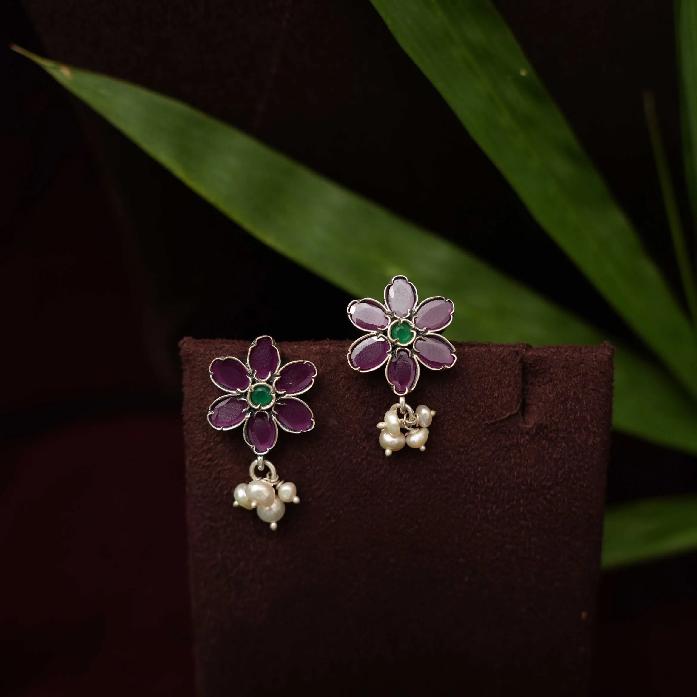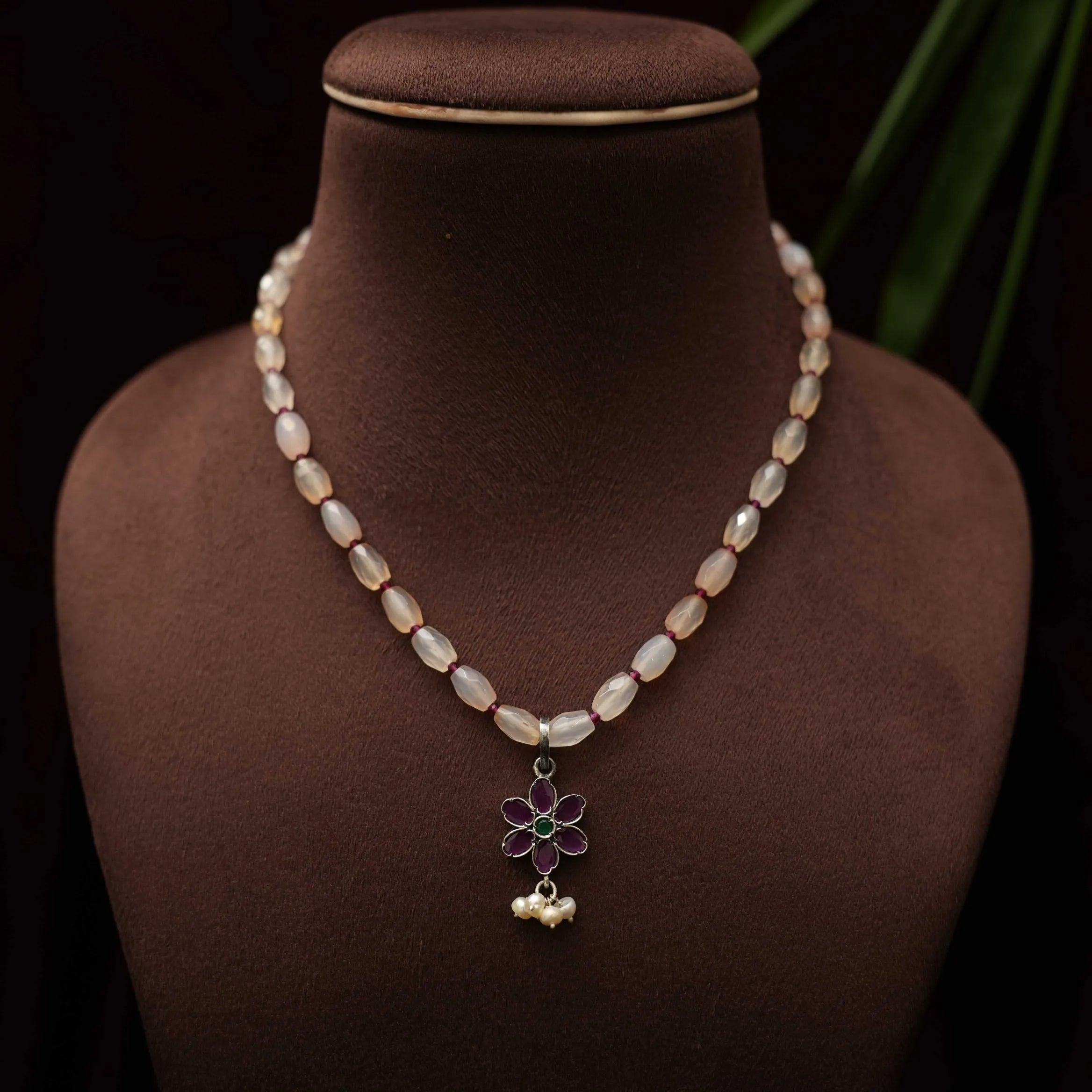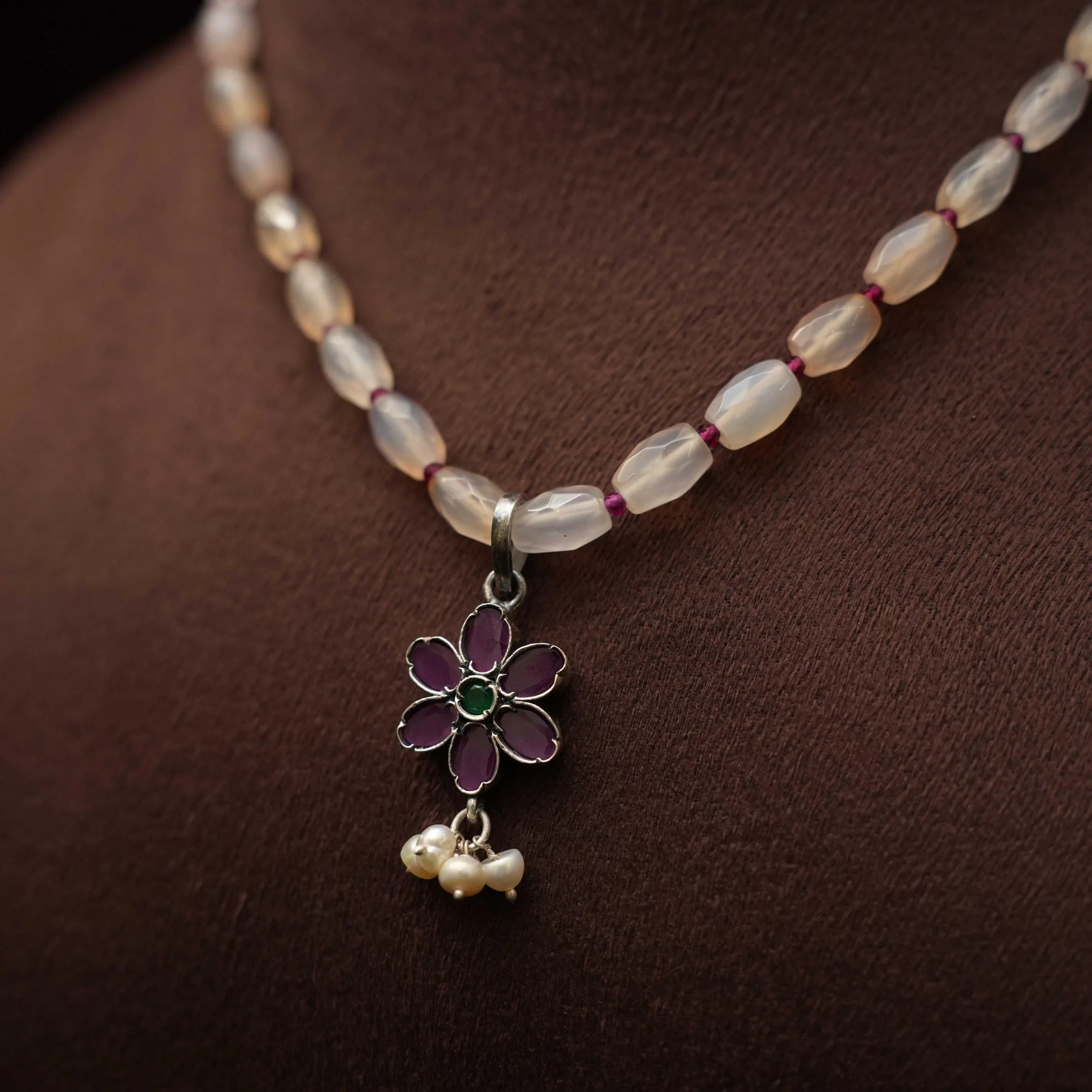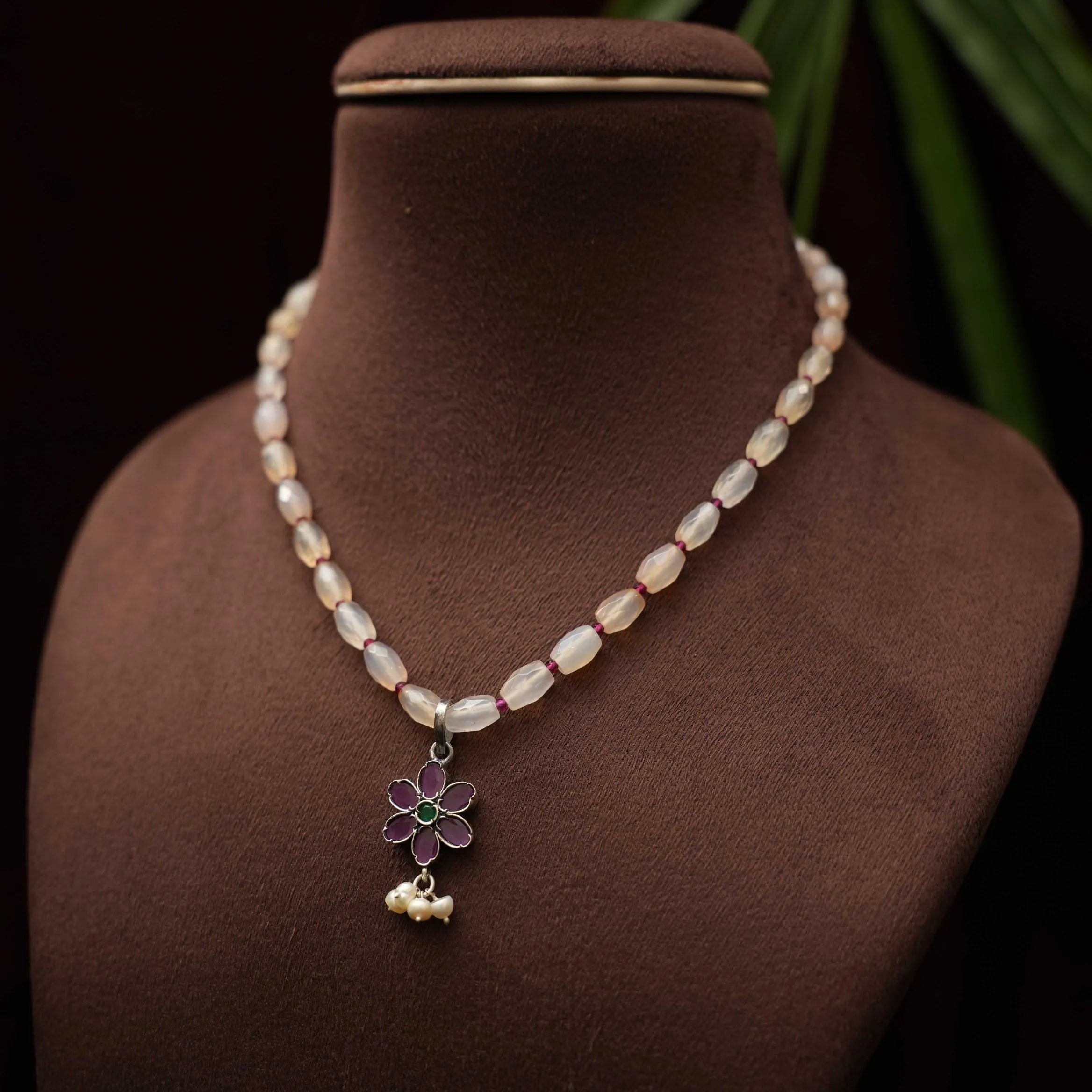 A beautiful necklace handcrafted in pastel pink beads paired to floral silver pendant. This set comes with a pair of earrings. This set comes with a pair of earrings.