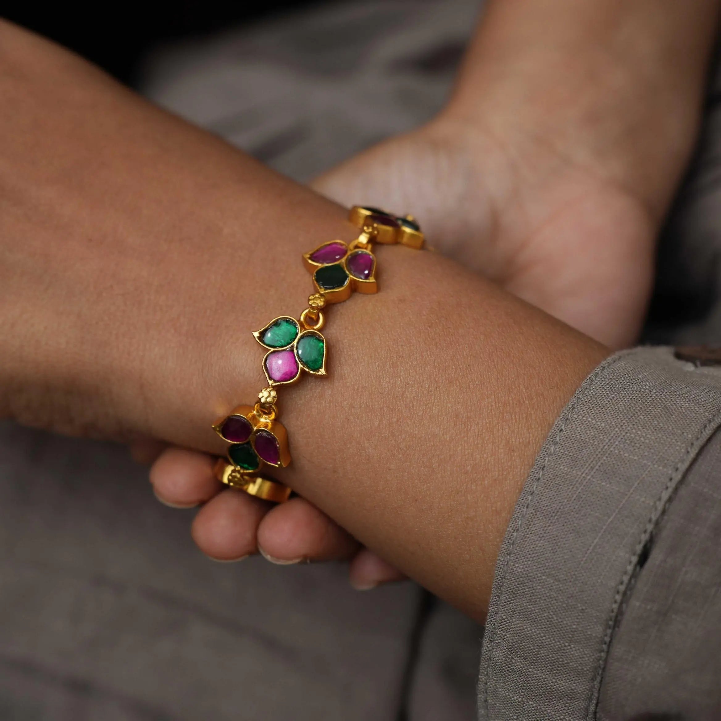 A beautiful silver bracelet handcrafted in floral motif studded with multicolor stones.