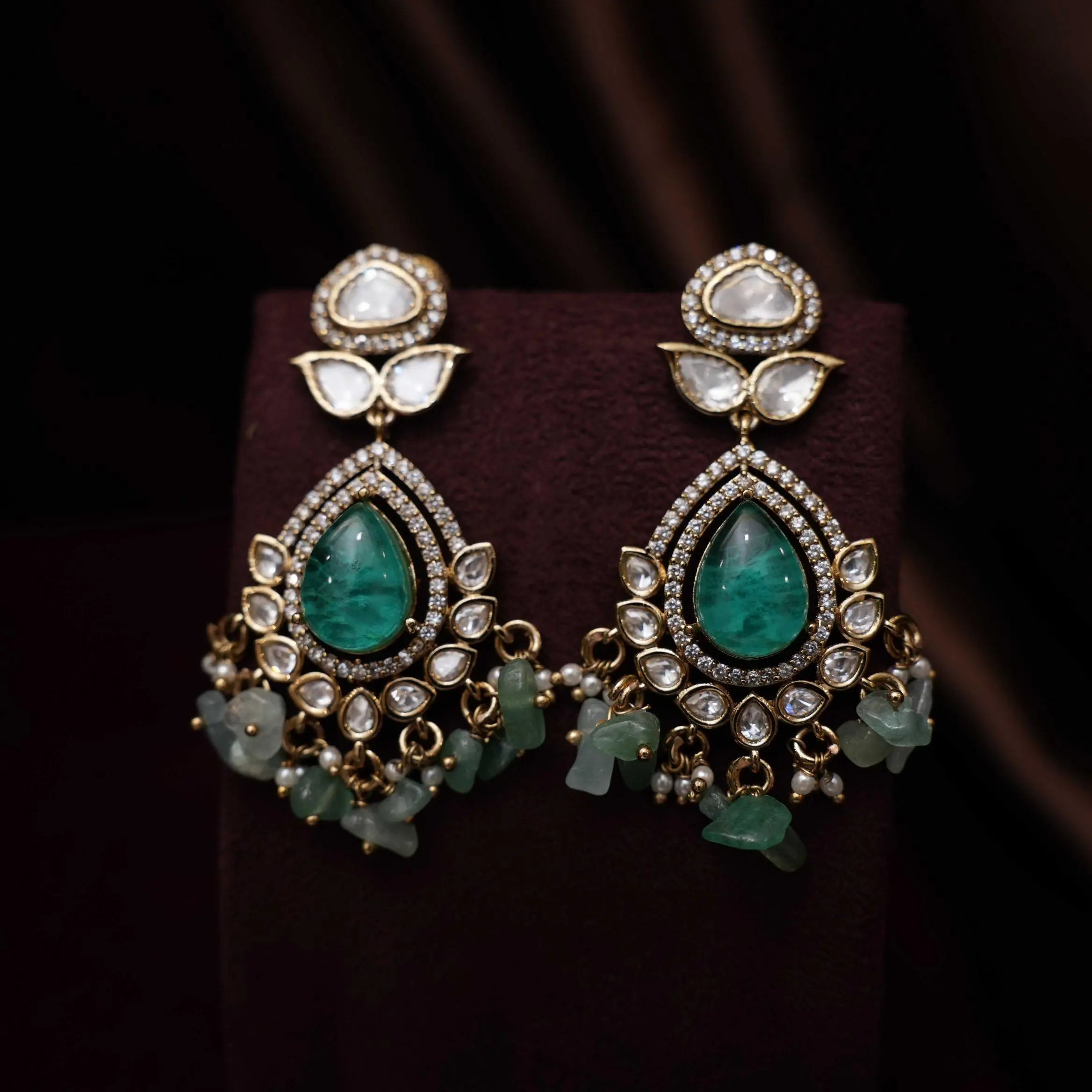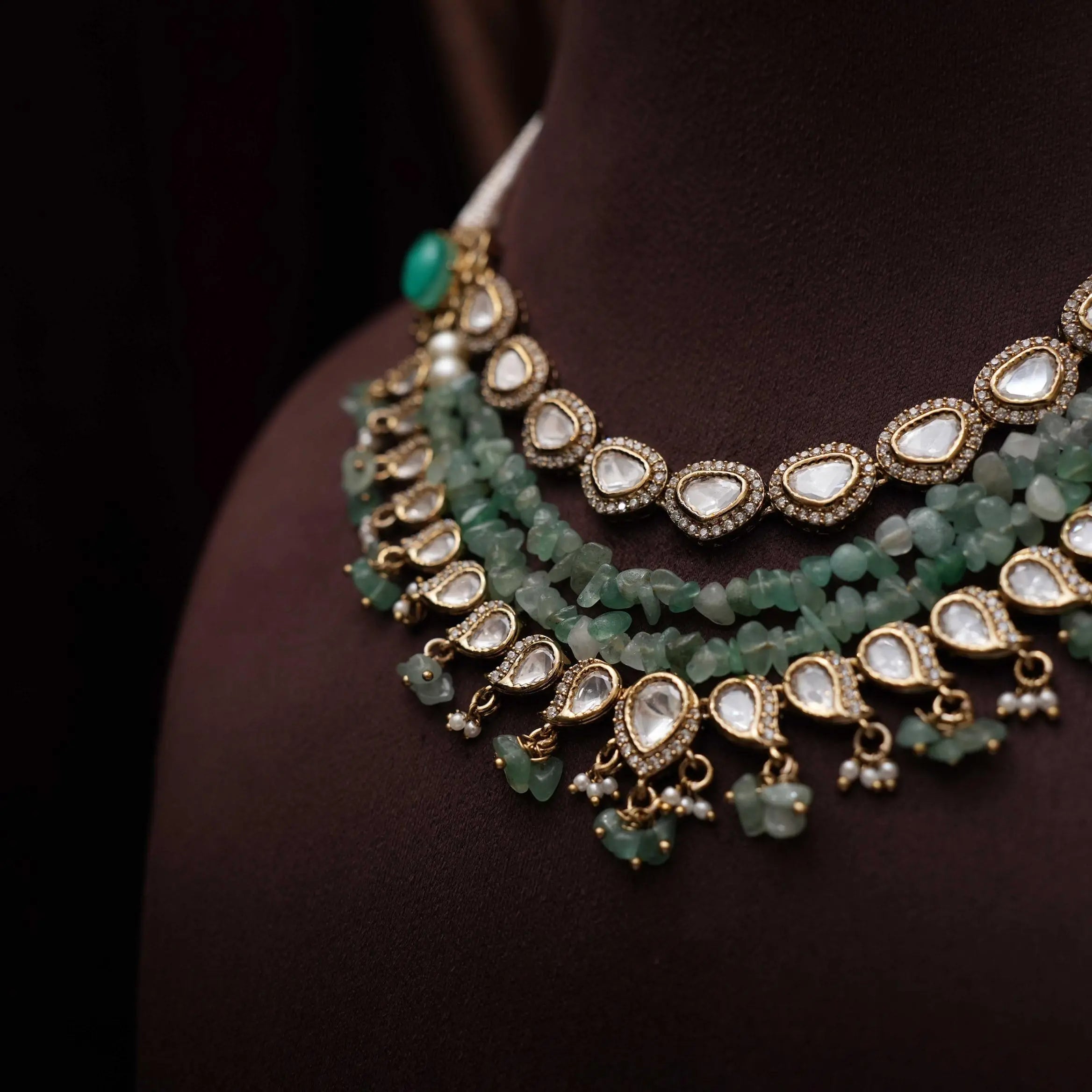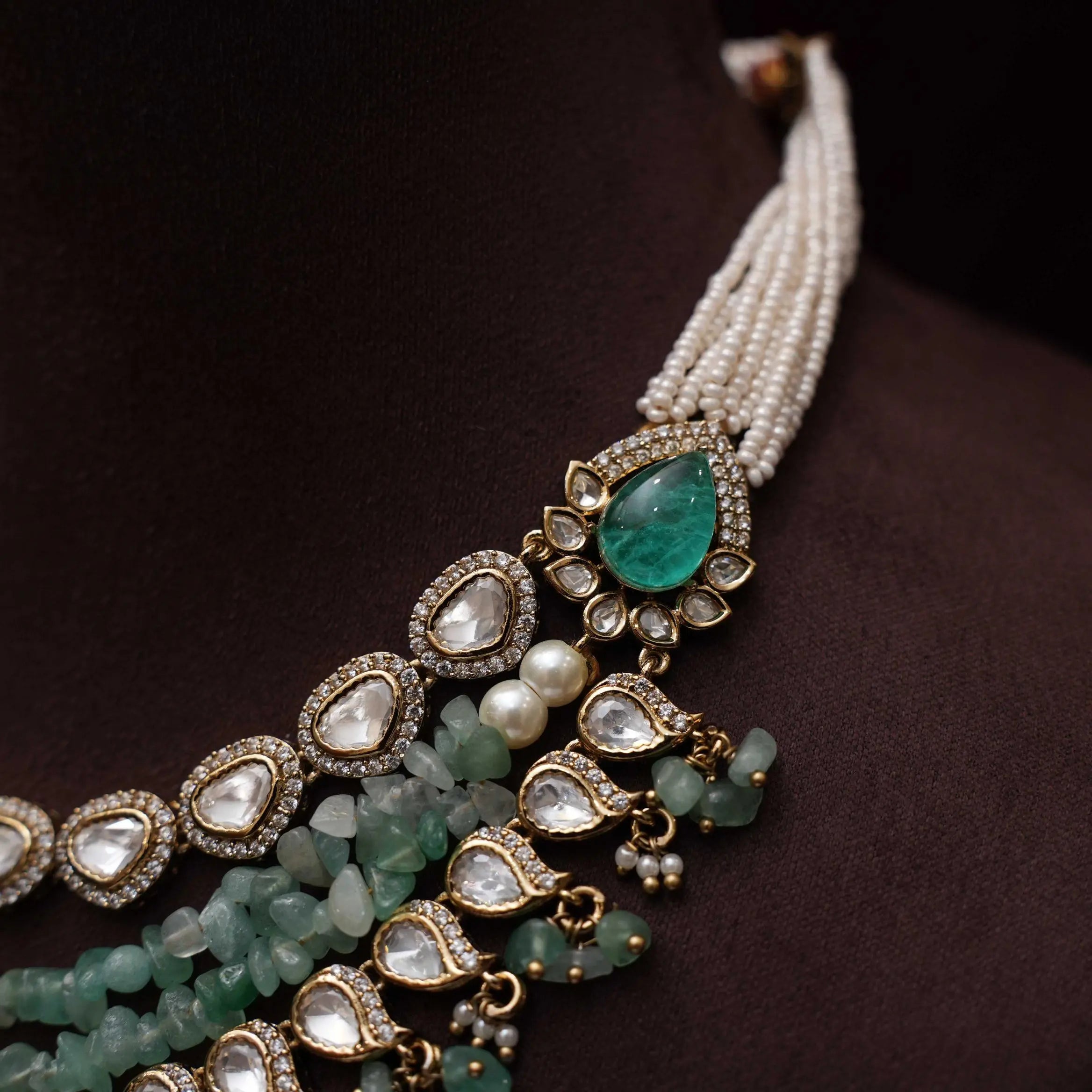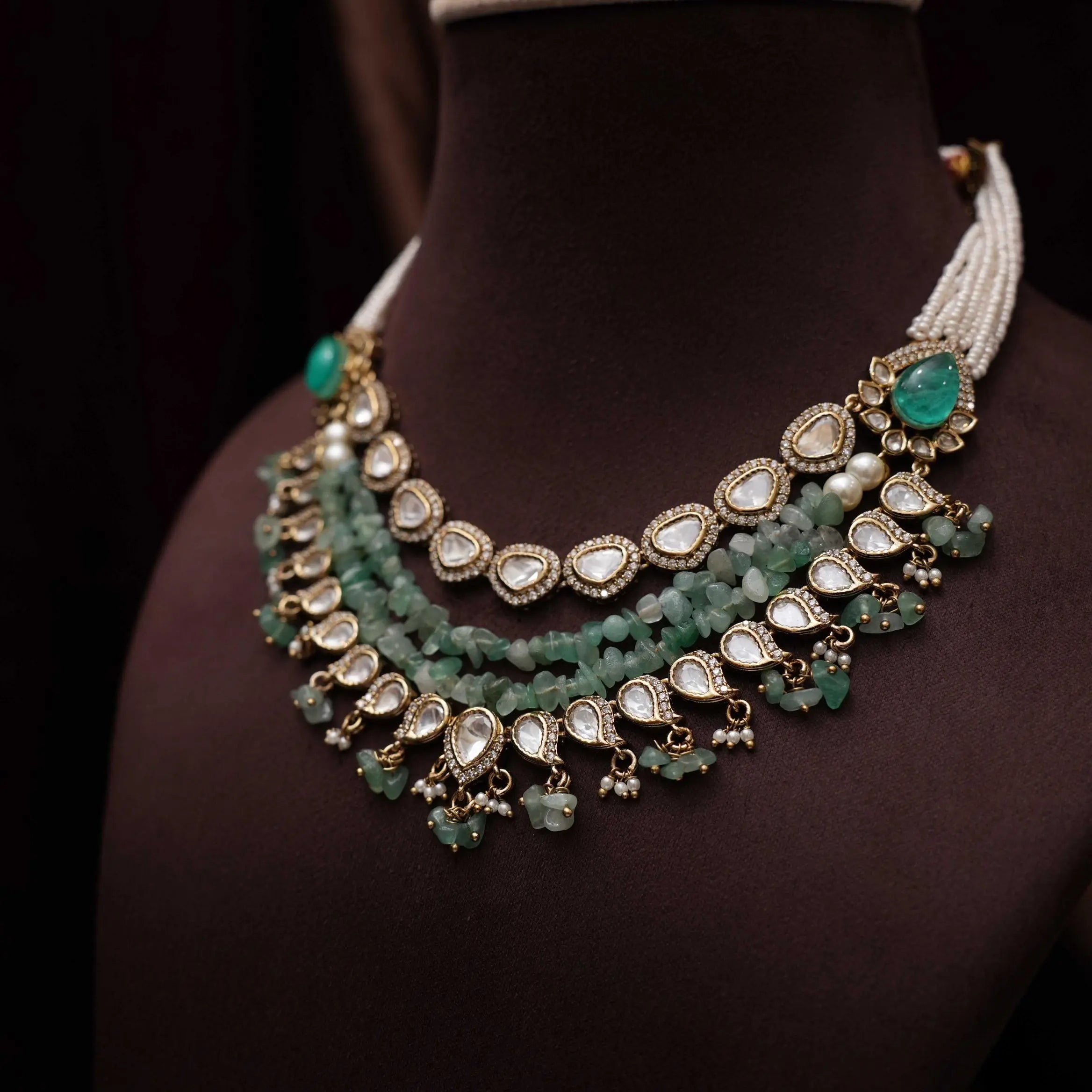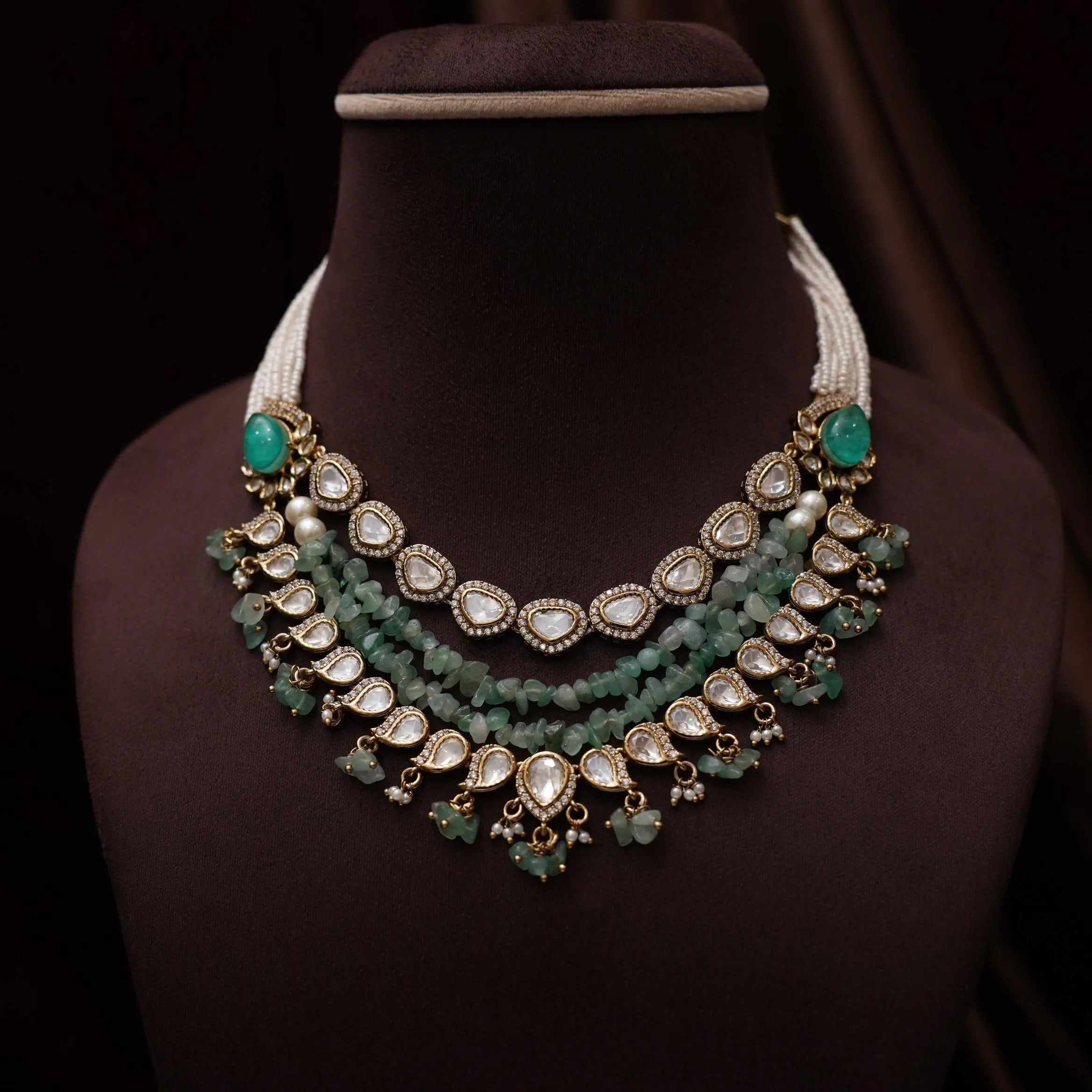 A stunning layered necklace, meticulously handcrafted with Victorian Polki stones and adorned with elegant pastel green beads. The design is beautifully accented with delicate pearl bunches, adding a touch of timeless charm. This exquisite set is paired with a matching pair of earrings, making it a perfect choice for special occasions.