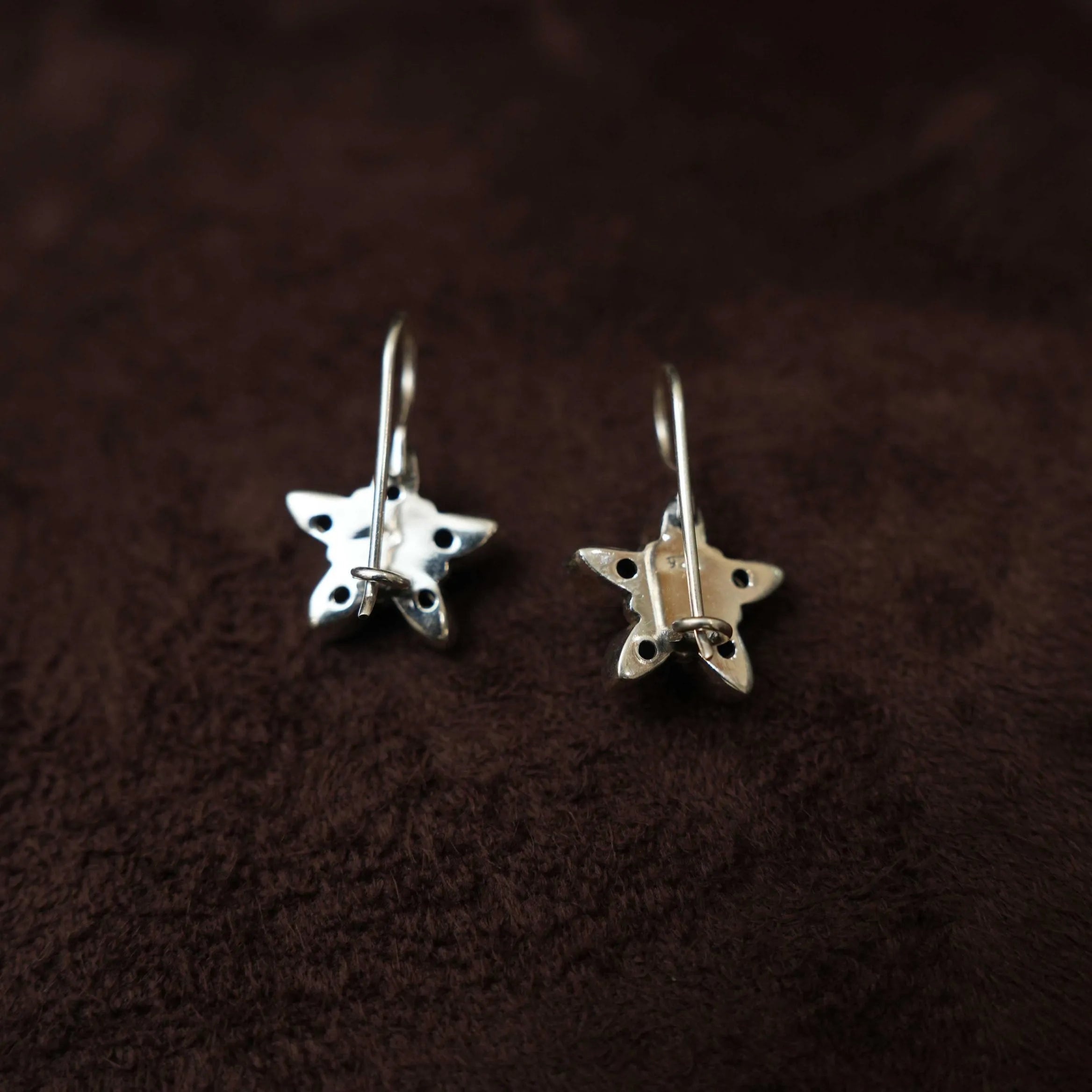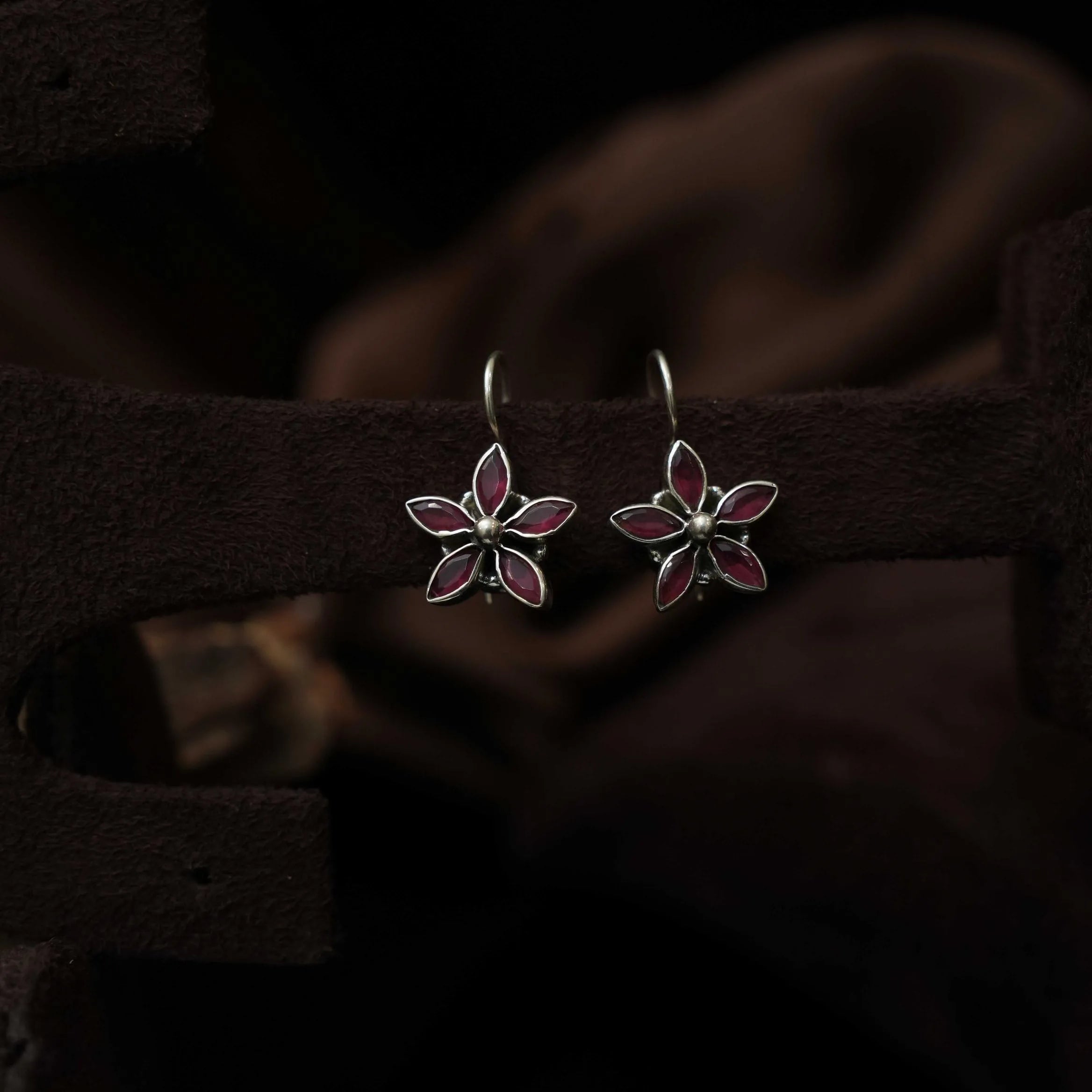 A beautiful silver oxidised hoop earring in floral motif studded with red stones.