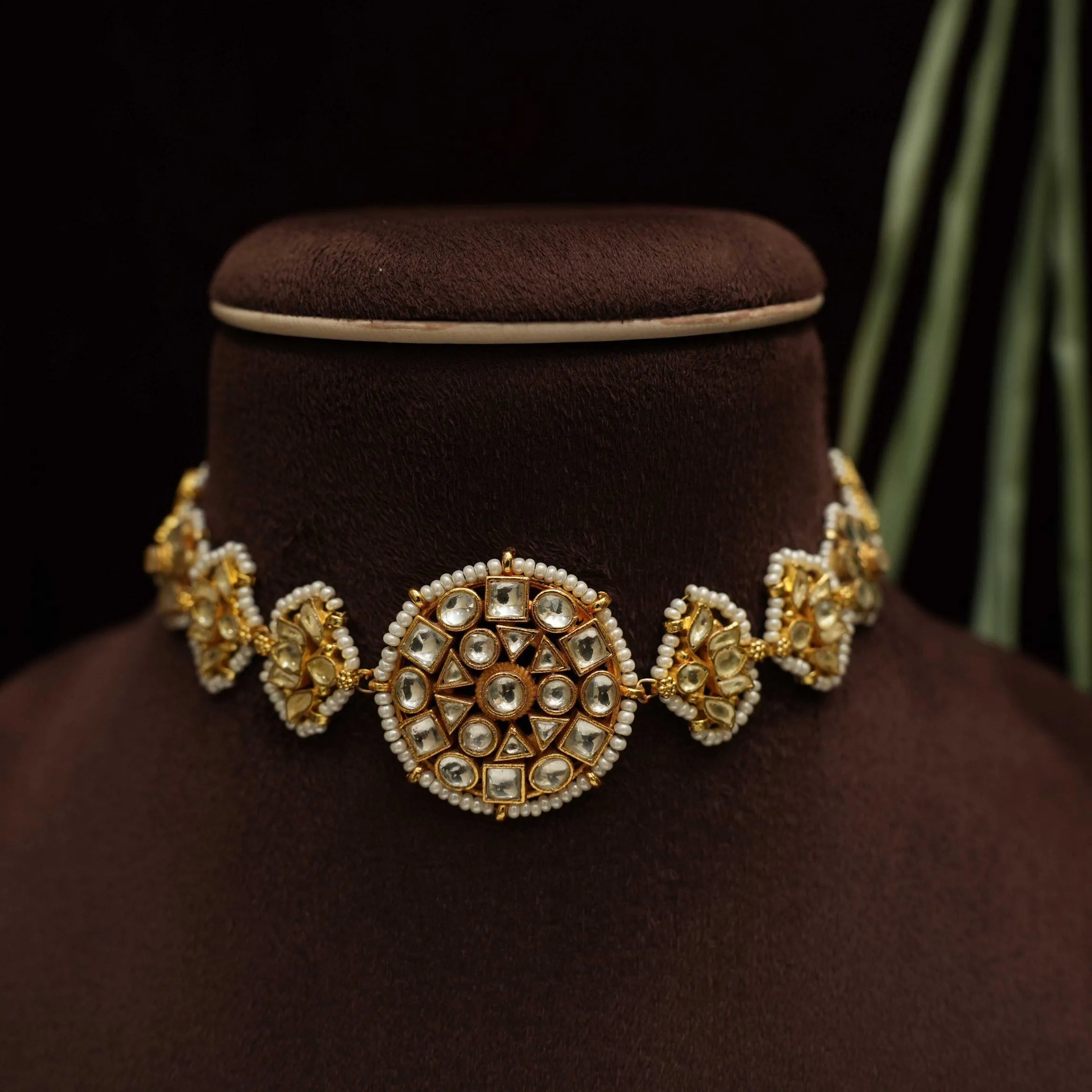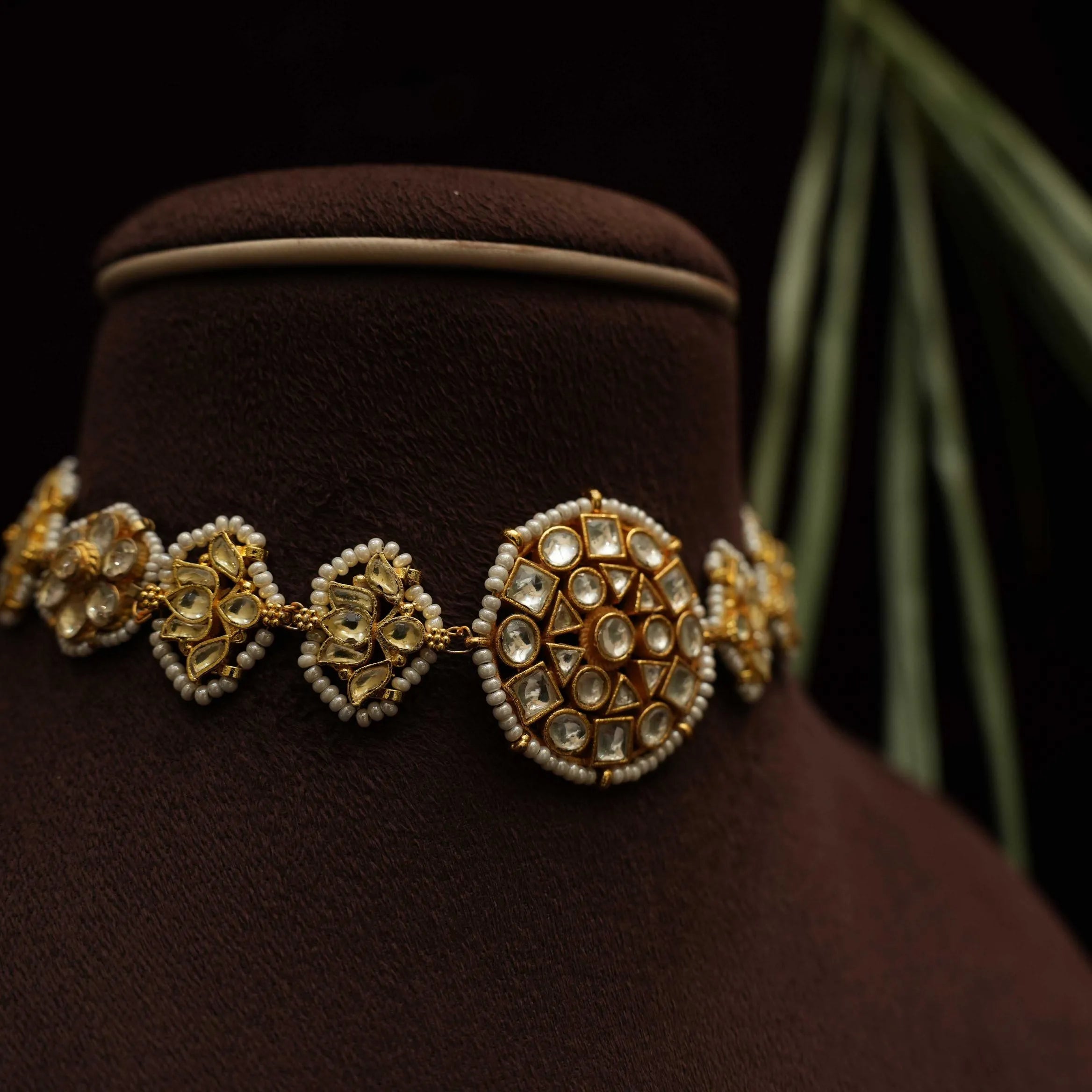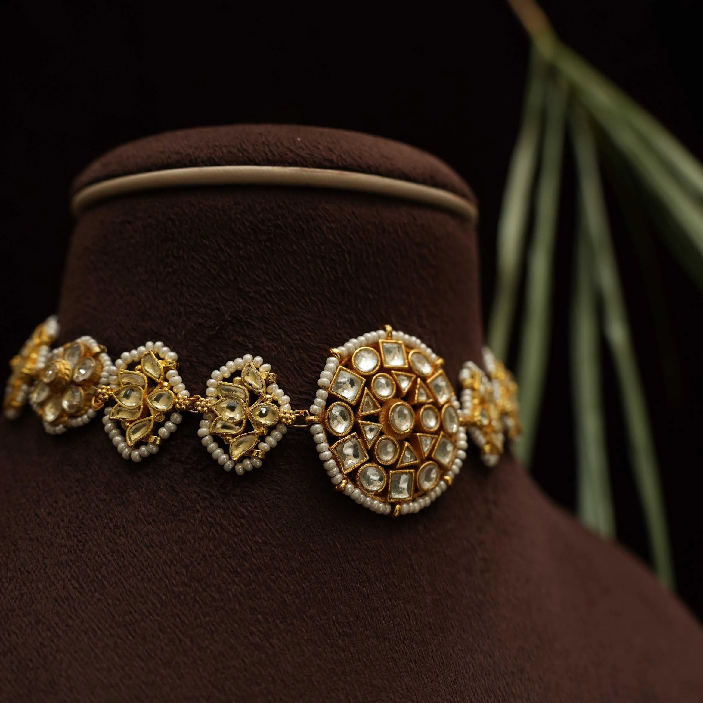 A simple & classic choker in lotus motif handcrafted with pearls and polki stones.