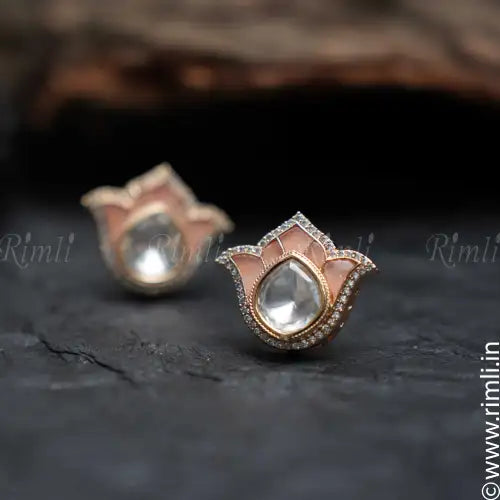 A beautiful ear stud in lotus motif adorn with peach stones.