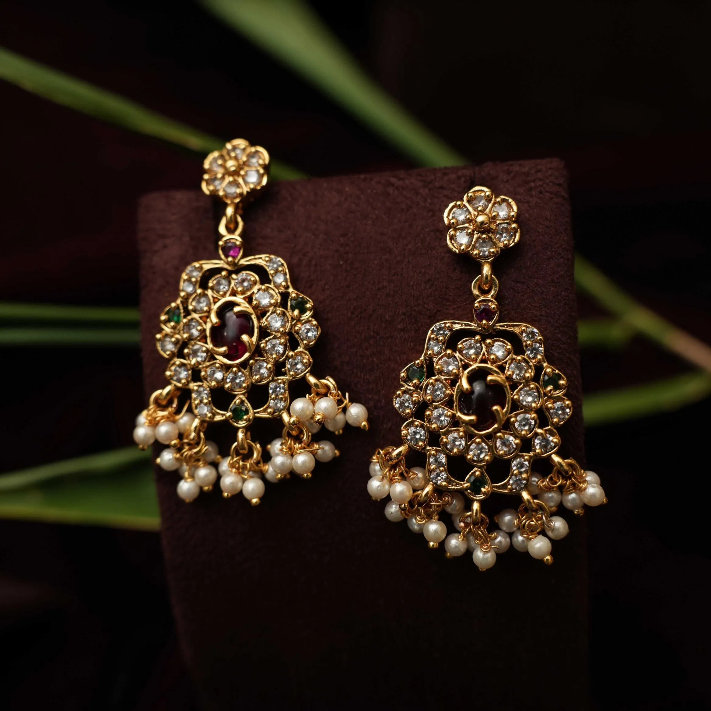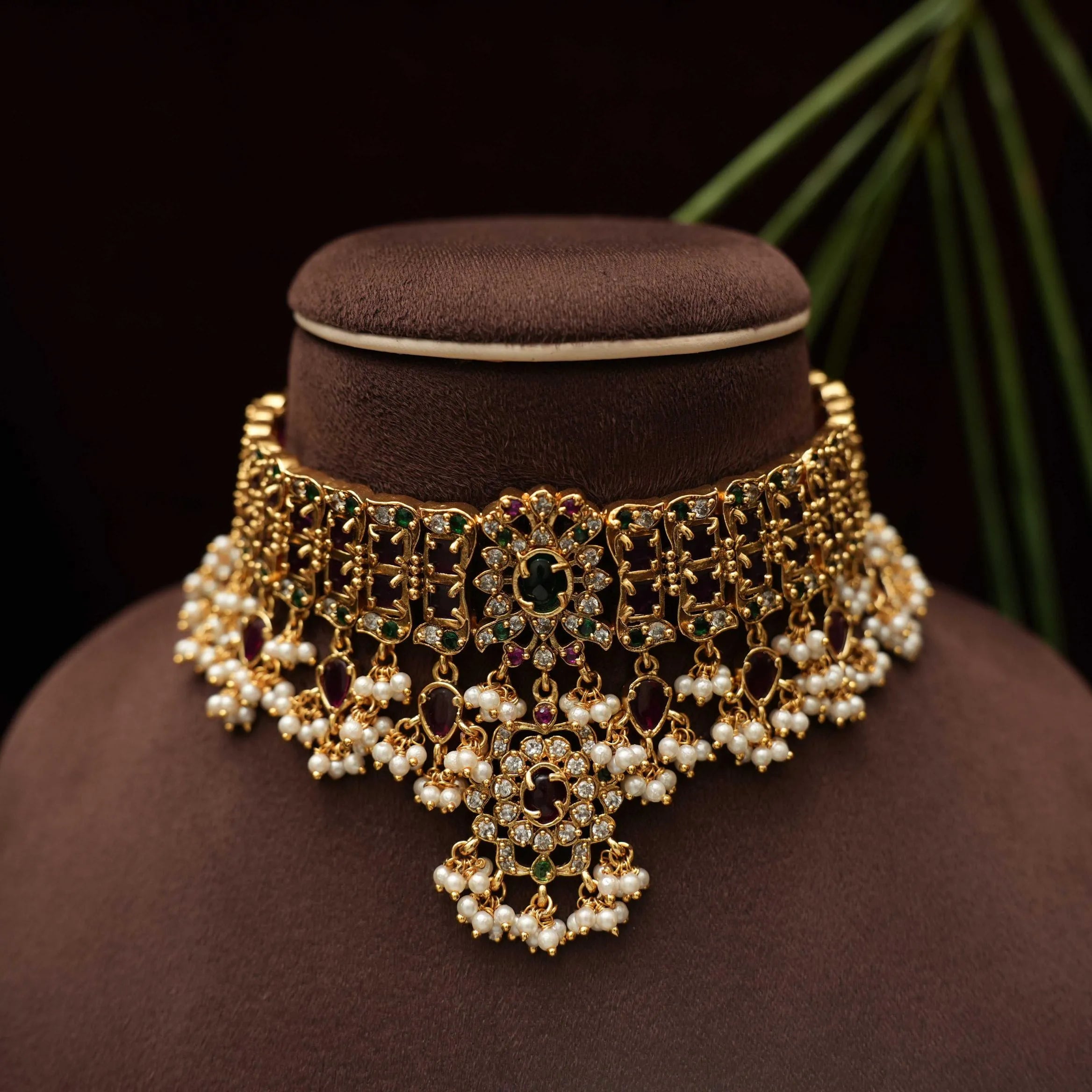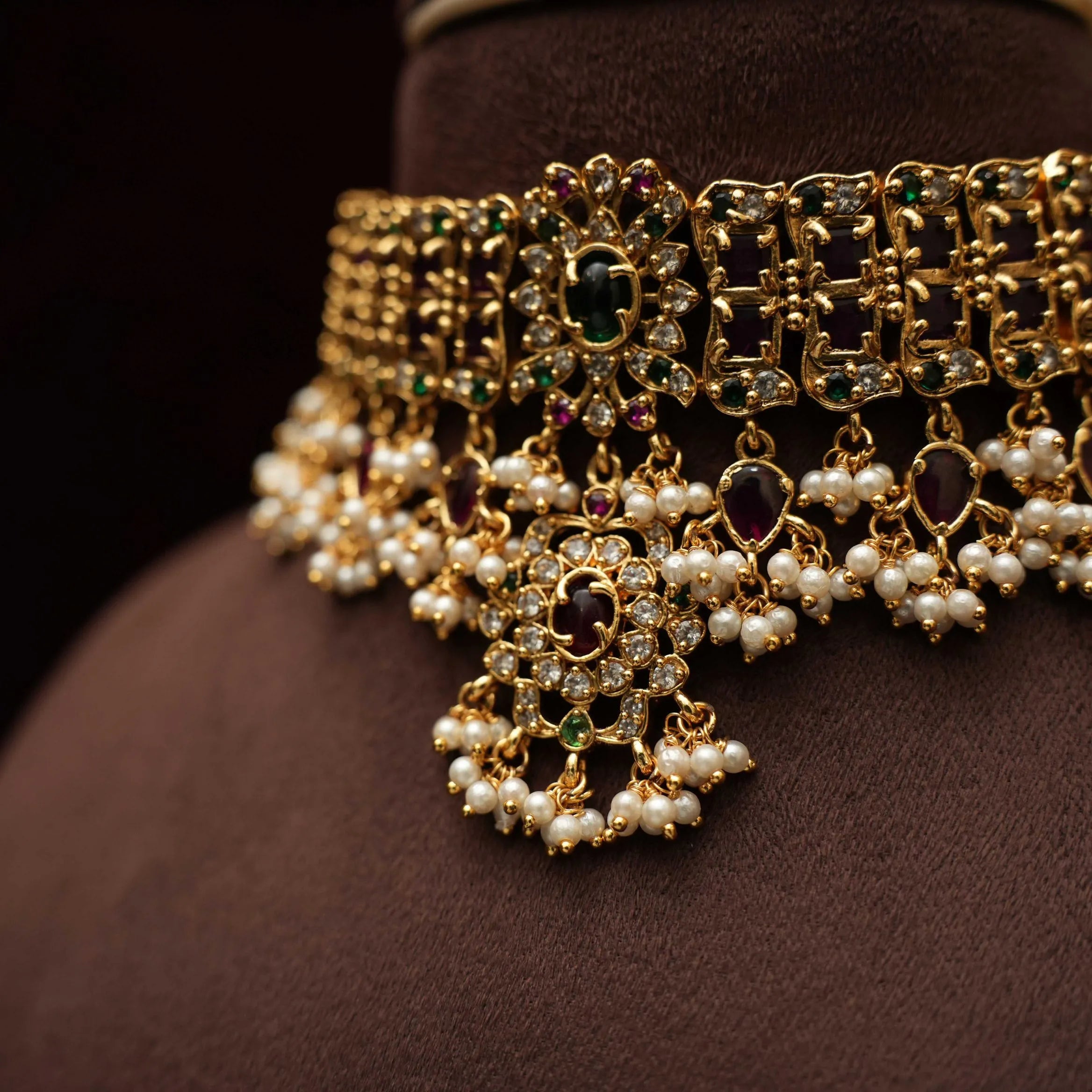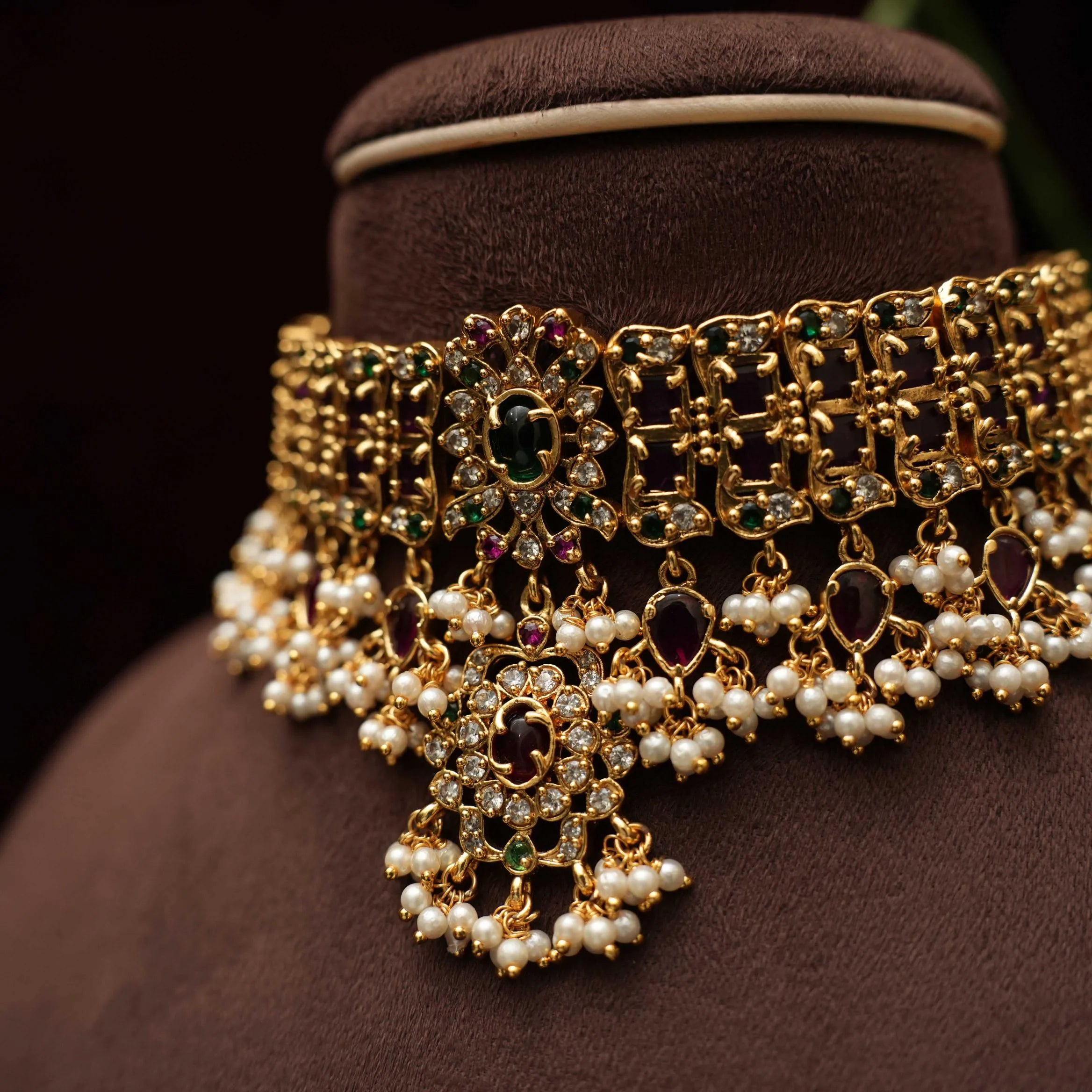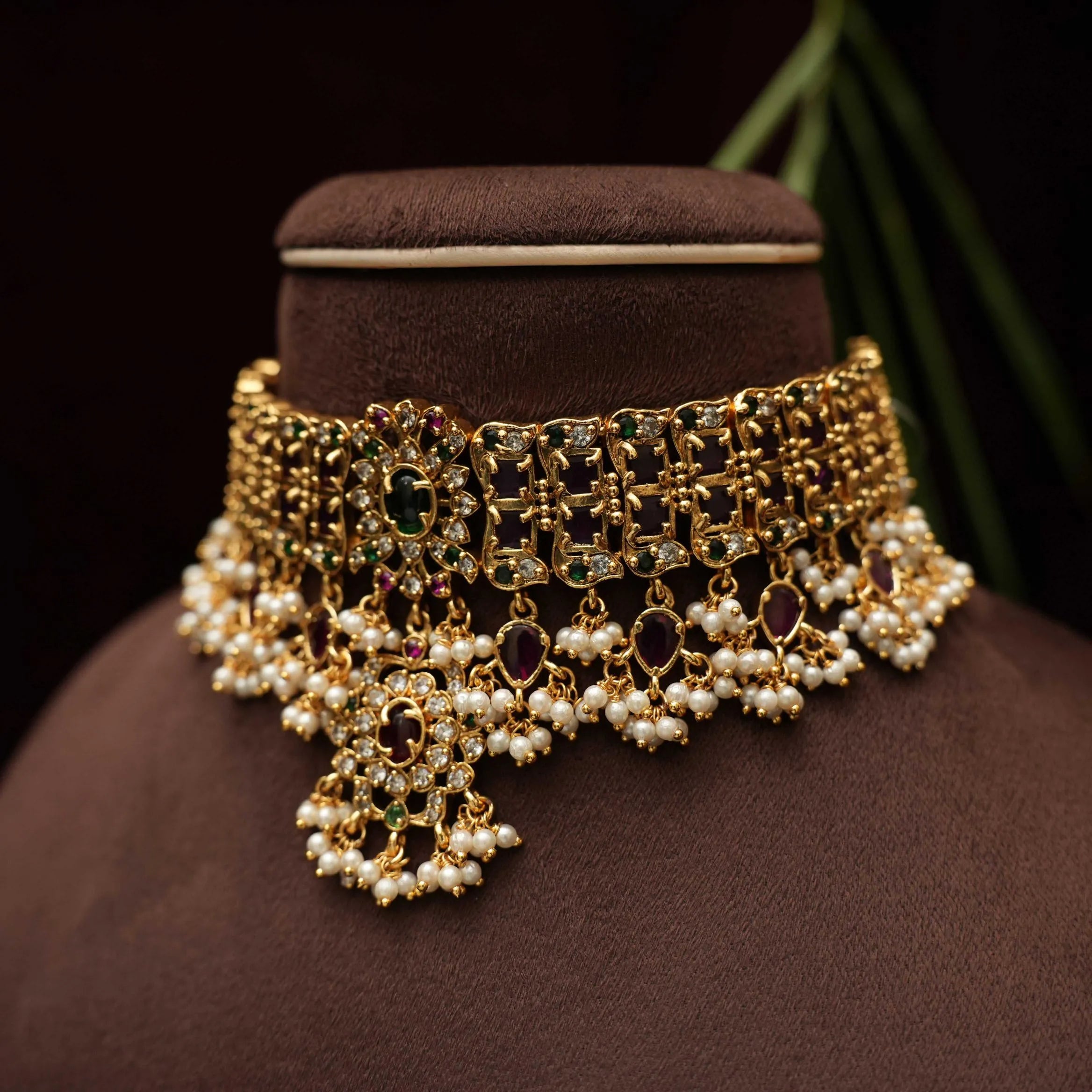 A stunning choker in traditional motif adorn with kemp stones and cluster pearls. This set compliments a pair of earrings.