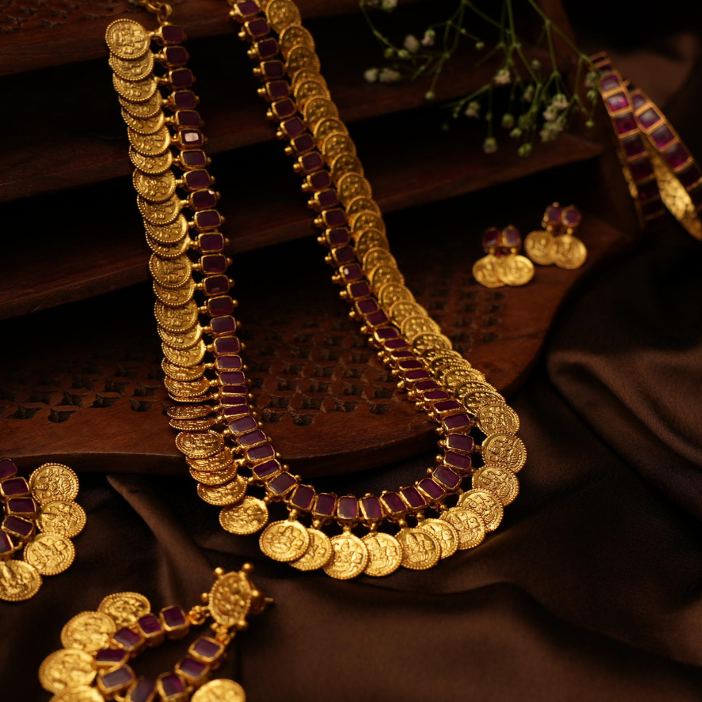 Delight in timeless tradition with our Classic Silver Coin Necklace Set, featuring intricately crafted Goddess motifs that celebrate cultural heritage. Accentuated with vibrant kemp stones, the necklace exudes elegance and spiritual charm.