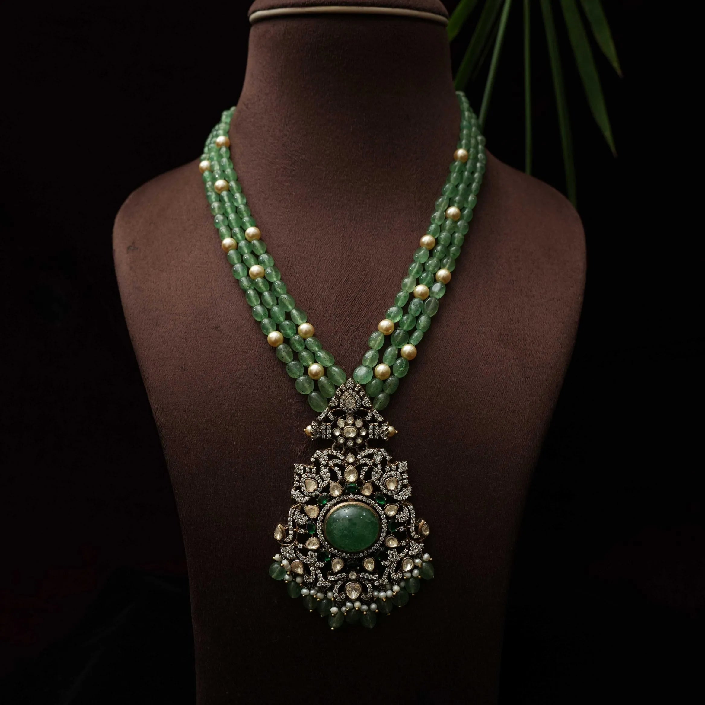 Introducing a stunning handcrafted statement necklace that combines vibrant green pumpkin beads and lustrous pearls. The centerpiece is a radiant moissanite pendant, elegantly adorned with complementary green beads that add a touch of sophistication.
