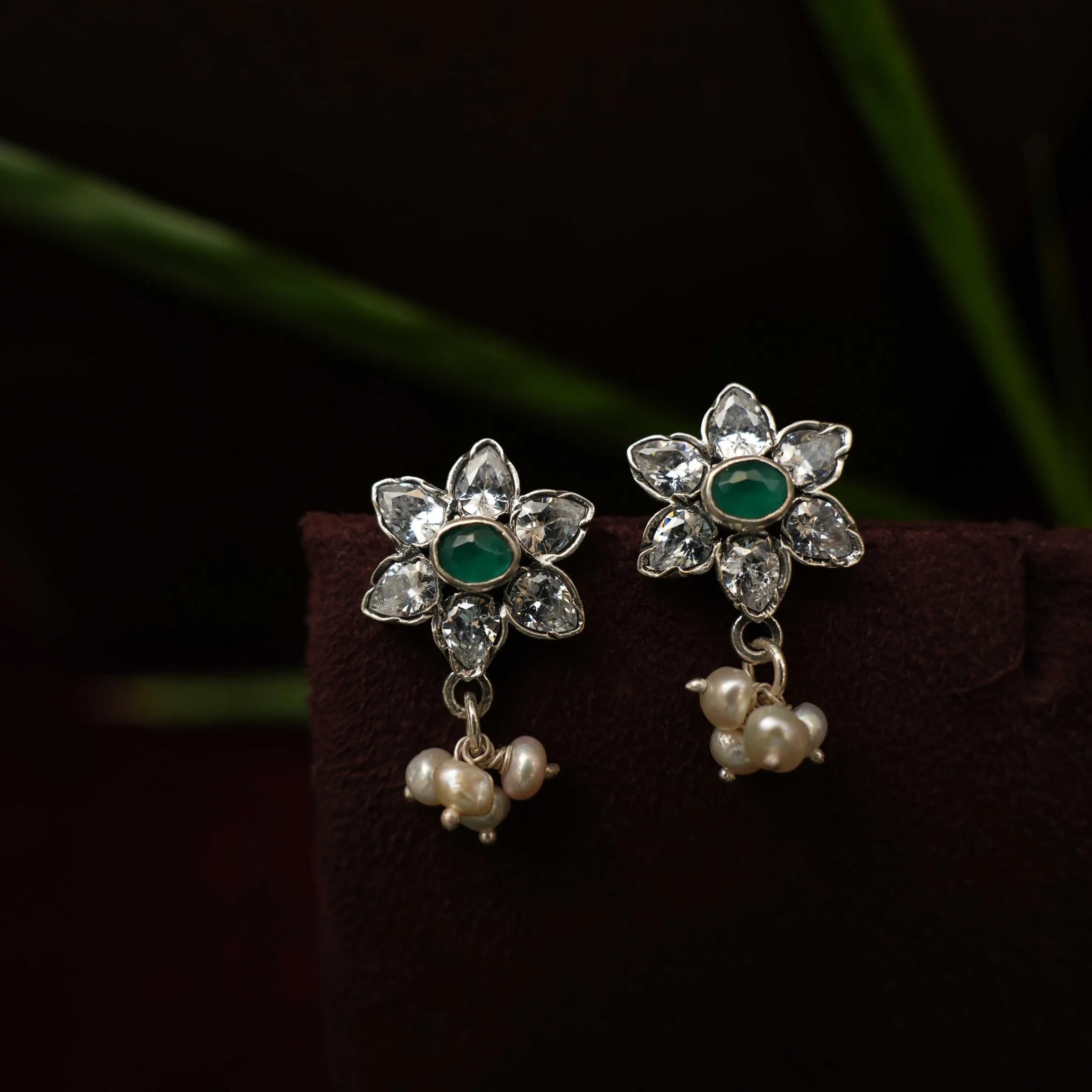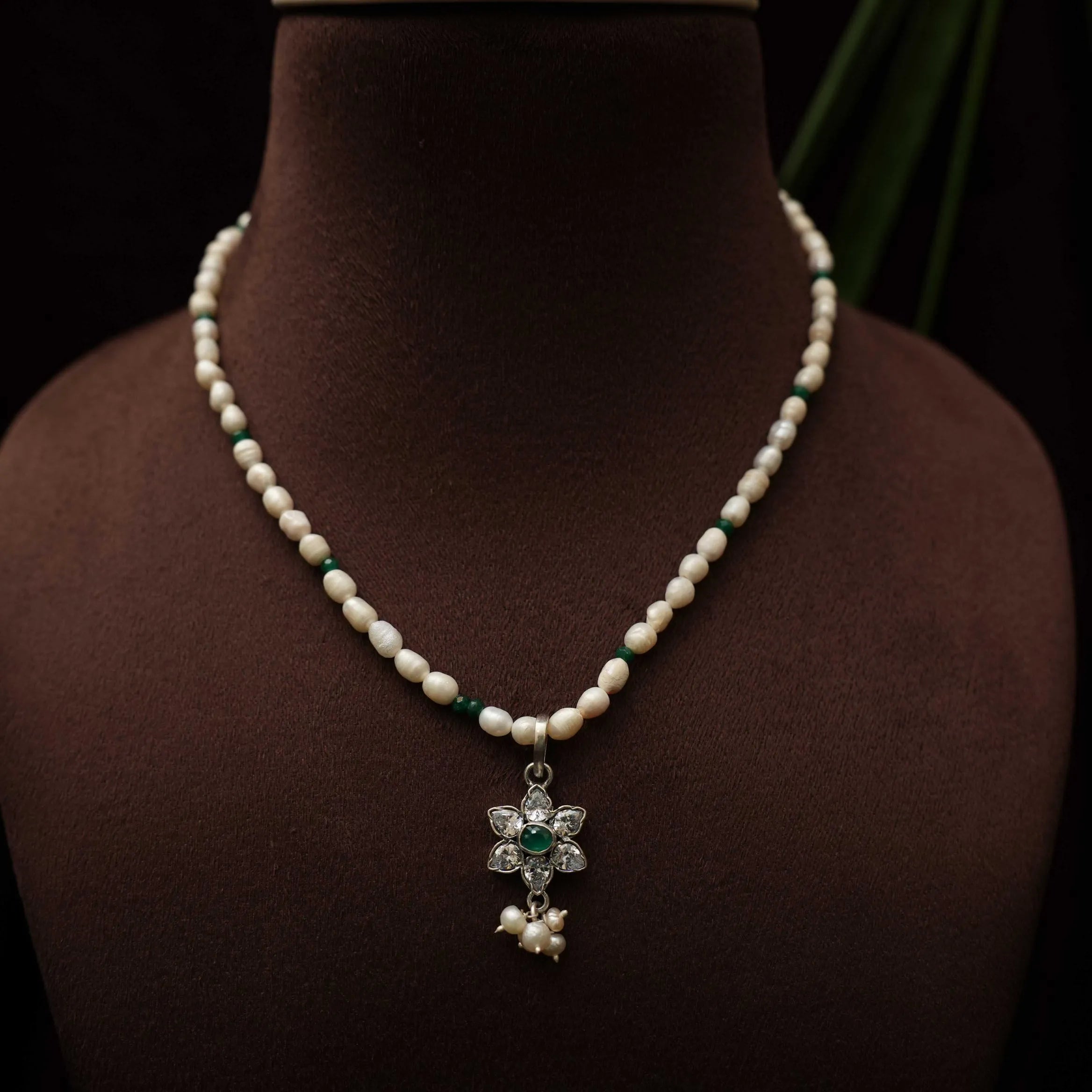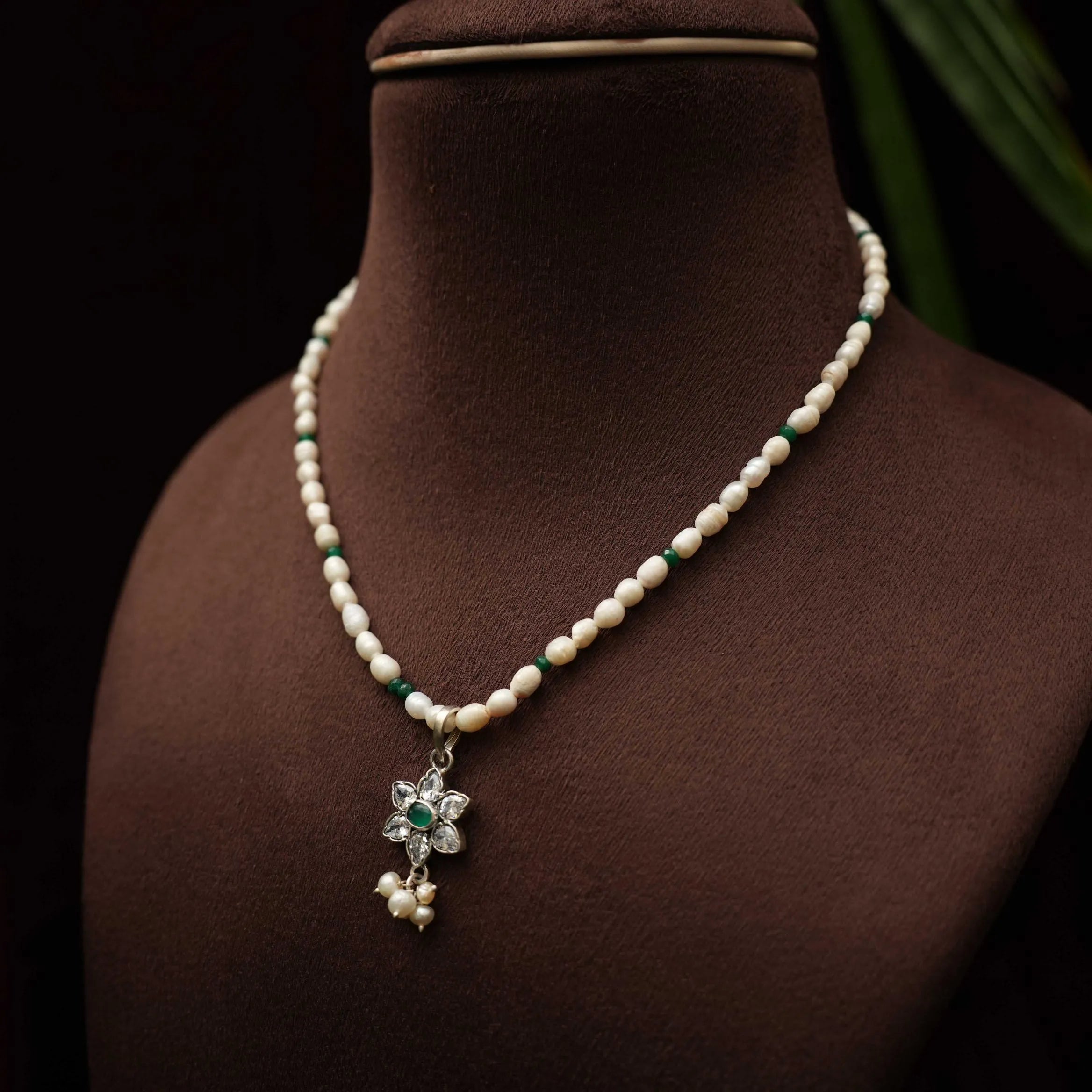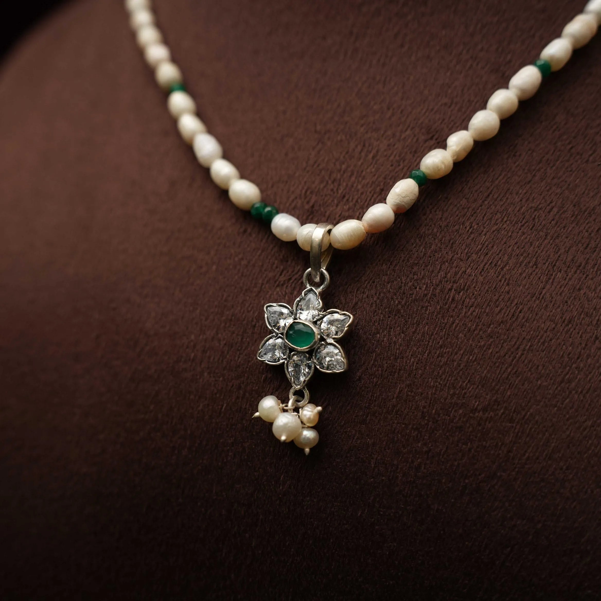 A regal necklace handcrafted in pearls paired to silver oxidized pendant adorn with pearls. This set comes with a pair of earrings.