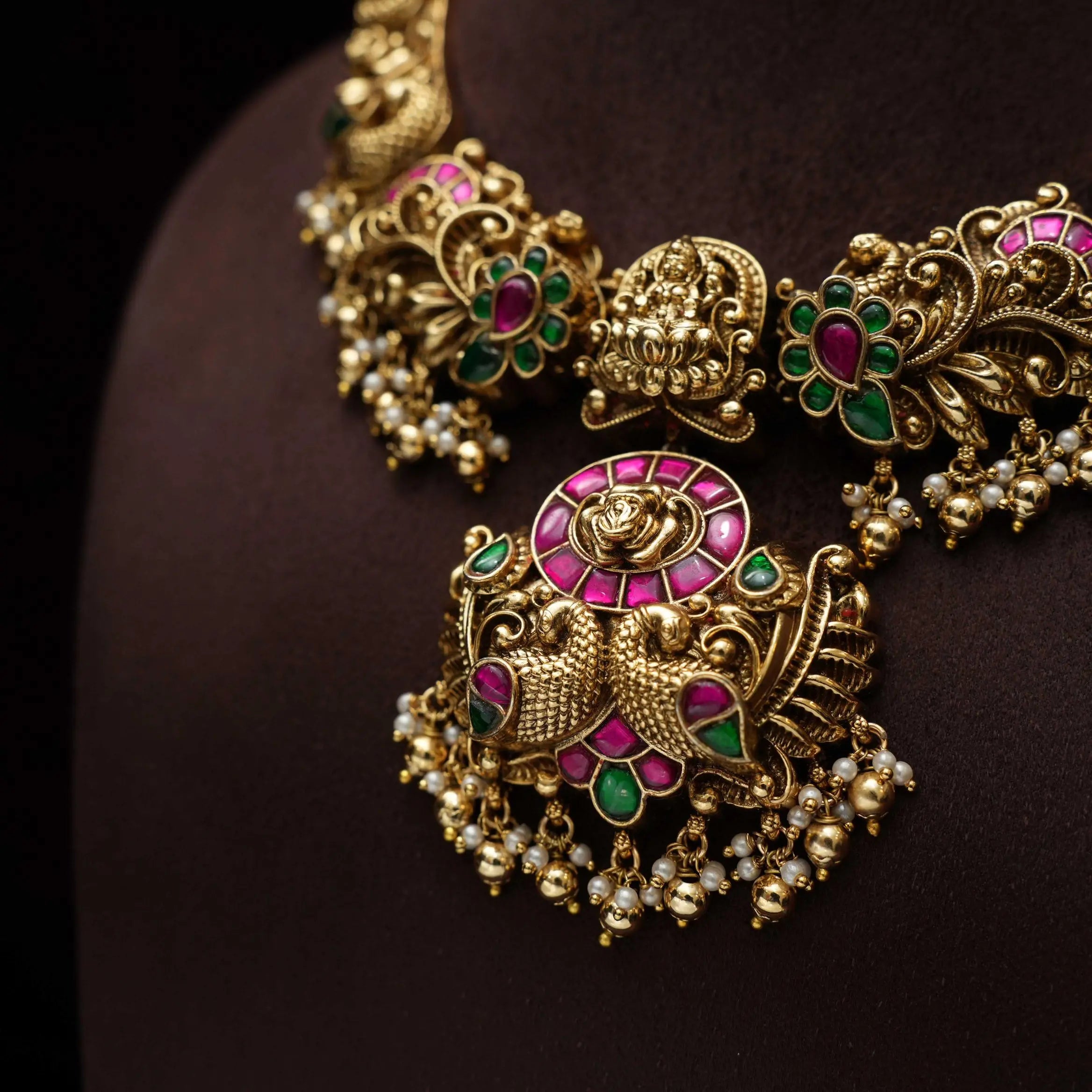 Make a bold statement with this exquisite antique Hasli necklace, beautifully handcrafted in traditional motifs featuring floral designs, peacocks, and the Goddess. Studded with rich Kemp stones, delicate golden balls, and lustrous pearls, the piece is finely detailed in a classic Nagas finish, reflecting timeless South Indian artistry.