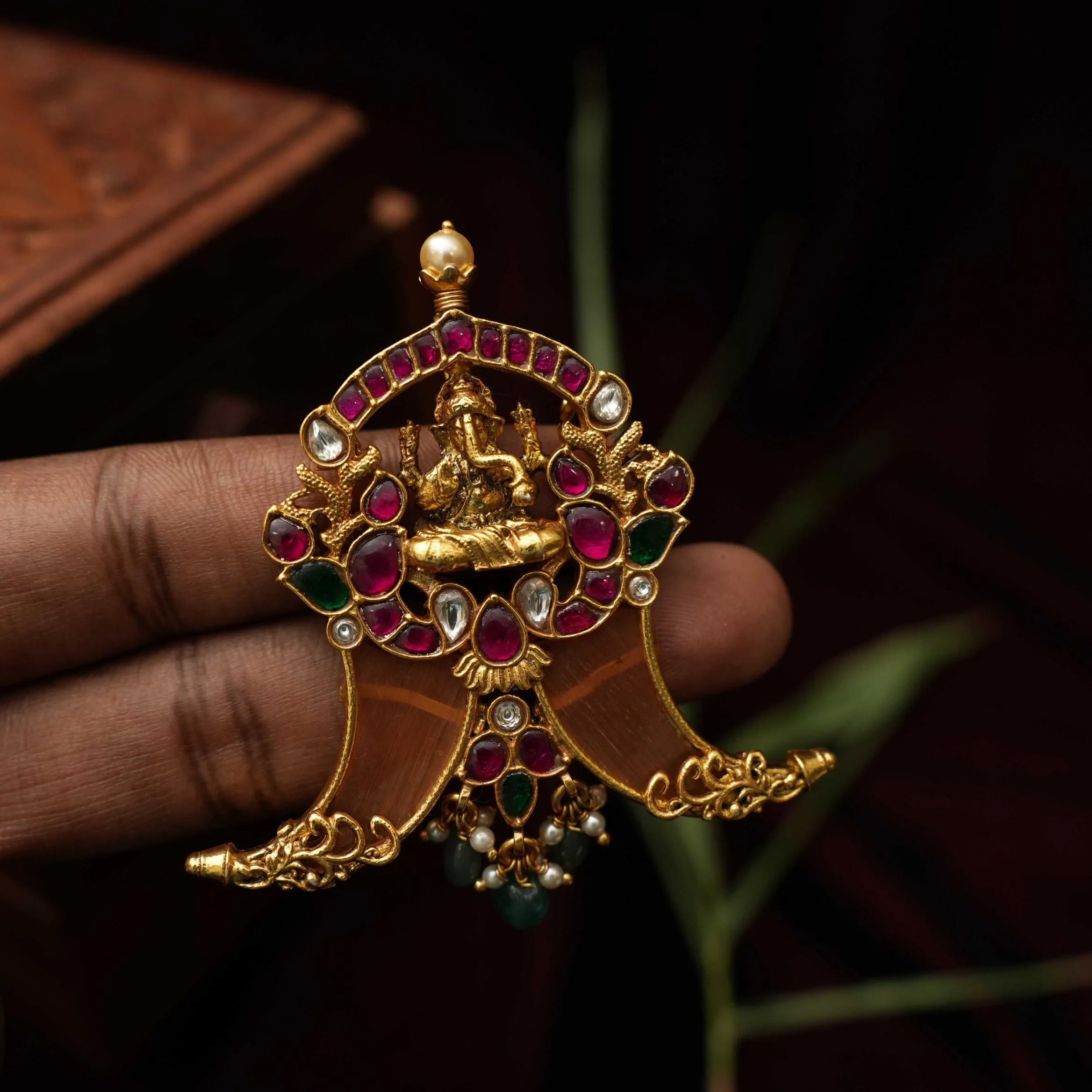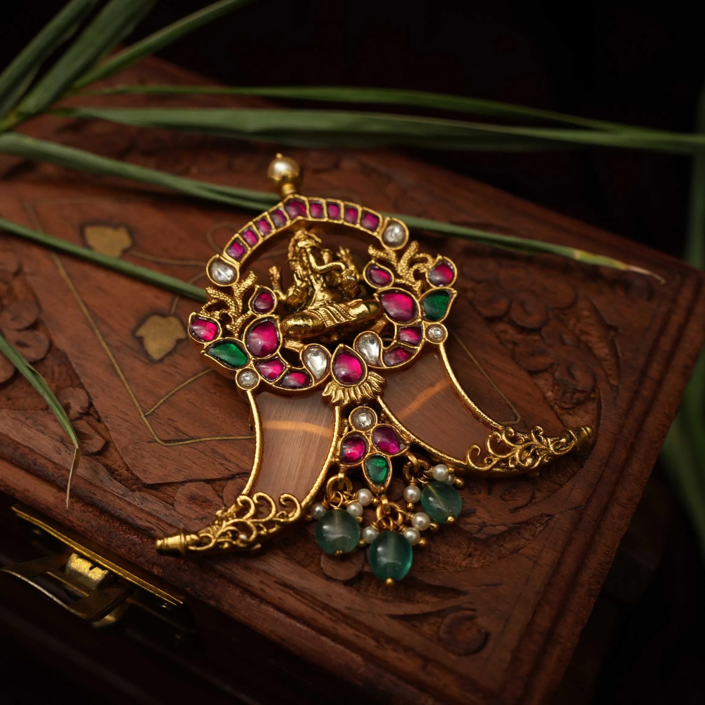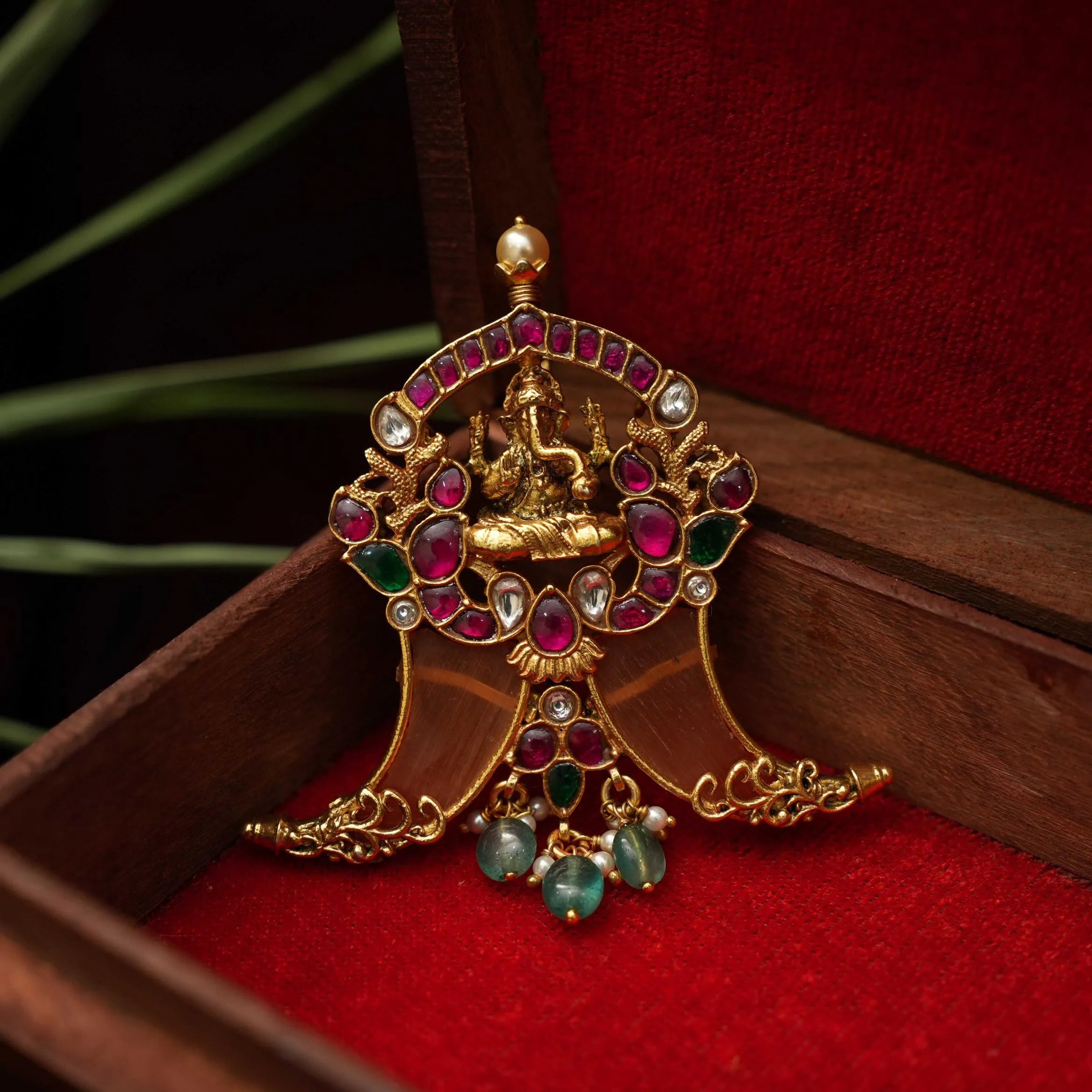 A beautiful silver pendant in puligoru shape studded with God Ganesha motif adorn with stones and beads.